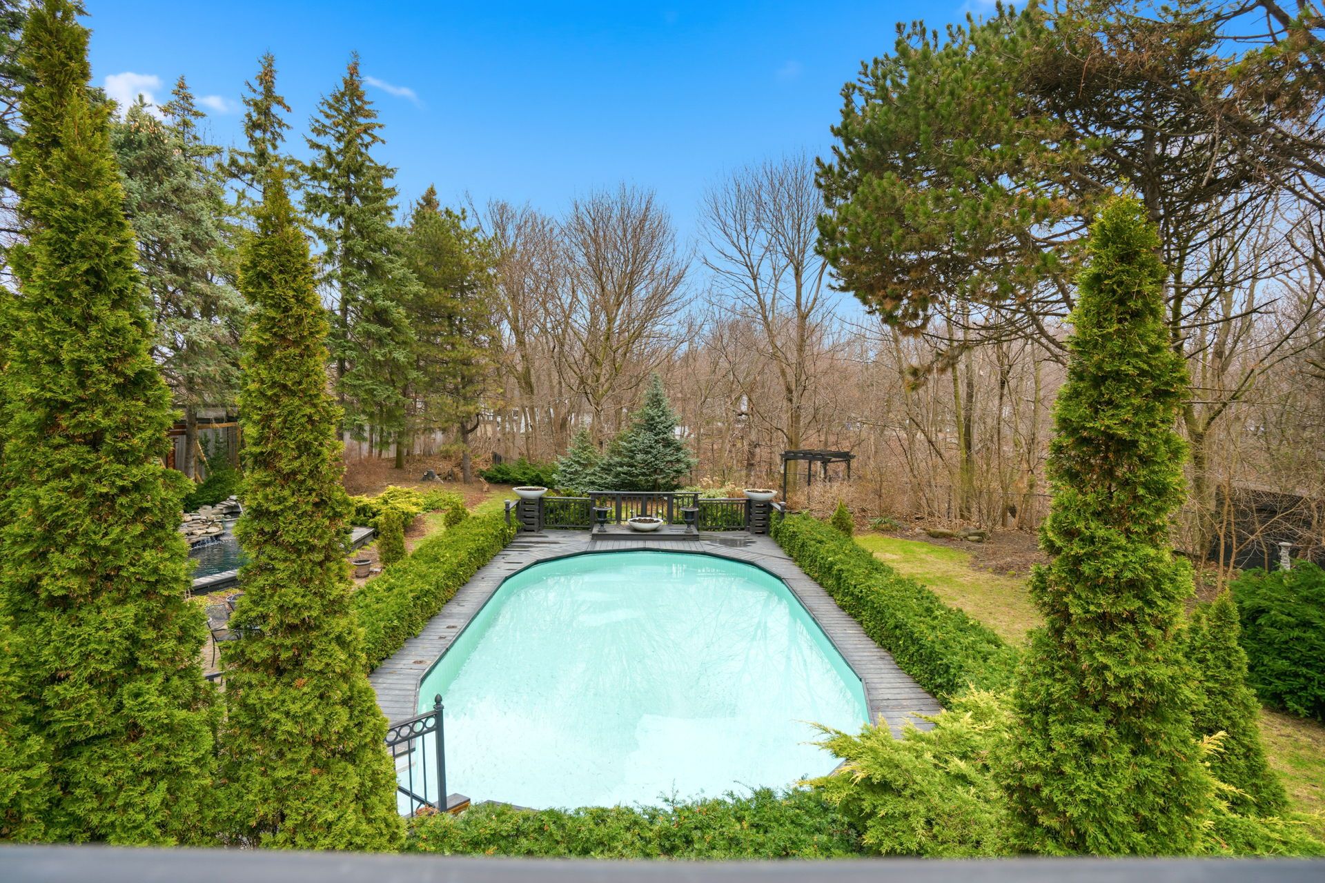 Welcome to 55 pine ridge road, a custom cliffcrest residence set on a private, tree-lined ravine lot near the scarborough bluffs. Rebuilt approximately 15 years ago on the original 1954 foundation, this bright and generously scaled home was designed for both everyday living and entertaining, with a dramatic two-storey great room, brazilian cherry hardwood floors, porcelain tile, multiple fireplaces, refined millwork, and an elevator serving all levels. The gourmet kitchen is finished with nero assoluto granite countertops and equipped with 2 miele dishwashers, 2 sinks, instant hot and filtered water, a raised island bar, hidden buffet table, side-by-side kitchenaid fridge and freezer, bar fridge, electrolux built-in microwave and 2 electric ovens, miele steam oven, 5 induction burners, and a gas wok burner. The family, living, dining, and breakfast areas connect seamlessly to the outdoor spaces, creating an exceptional main floor layout for both large gatherings and daily family life. The upper level includes a spacious primary suite with terrace access, a dressing room, walk-in closets, and a 5-piece ensuite. A second ensuite bedroom, additional bedroom space on the main level, and a lower level bedroom with an adjacent bath provide flexibility for family, guests, or multigenerational living. The lower level adds a recreation room, gym, steam room, hot tub, wet bar, and walk-out access. Outside, the landscaped grounds include a circular driveway, built-in 2-car garage, terraces, pond, pool house, and a gas-heated saltwater pool in a private garden setting. Located in an established cliffcrest neighbourhood, the home is close to bluffer's park, local parks and recreation, shopping and dining along kingston road, well-regarded schools, and transit connections including eglinton go, scarborough go, and kennedy station.