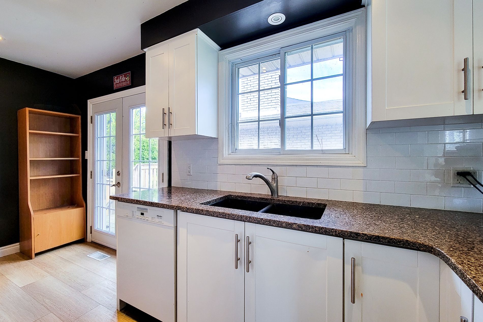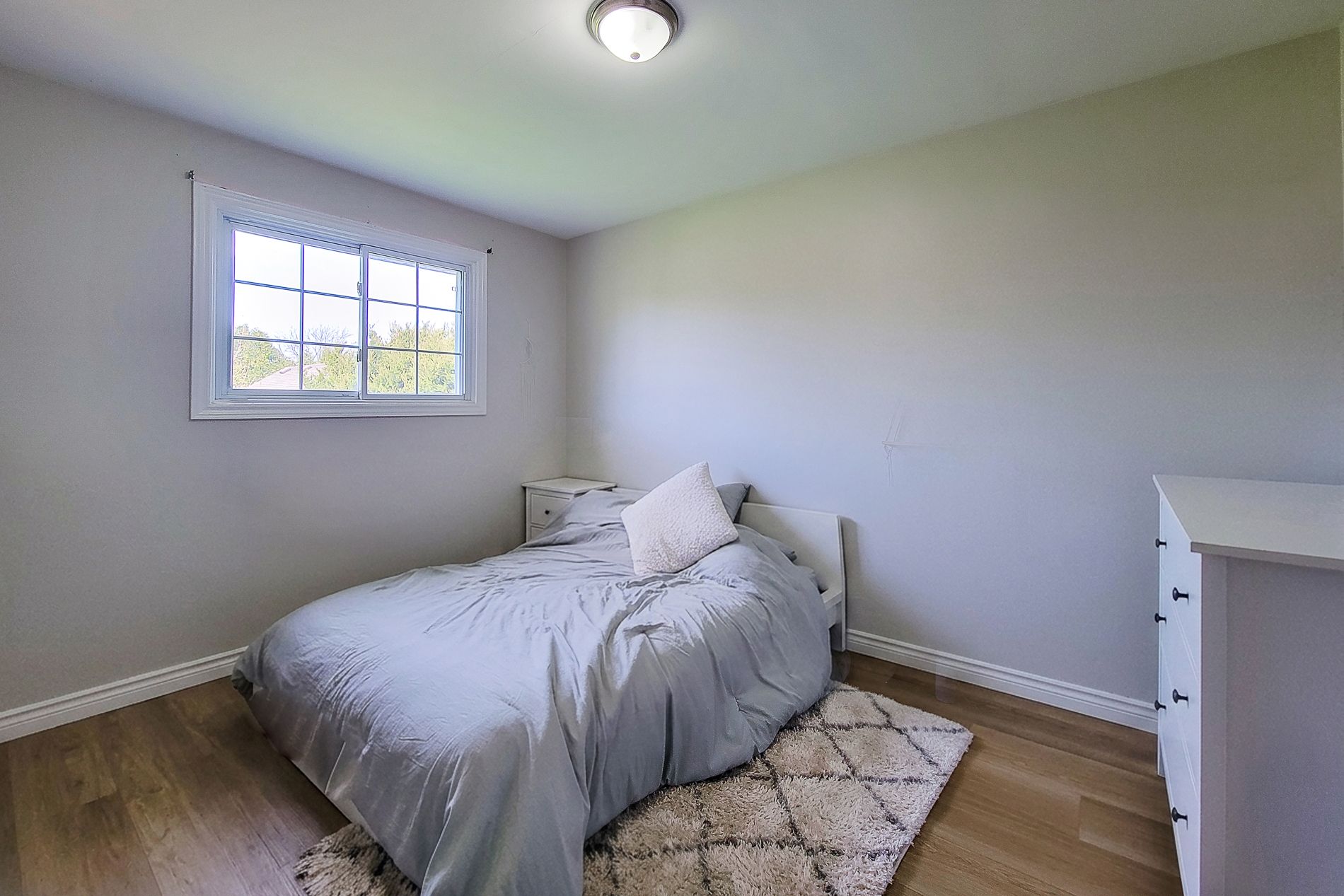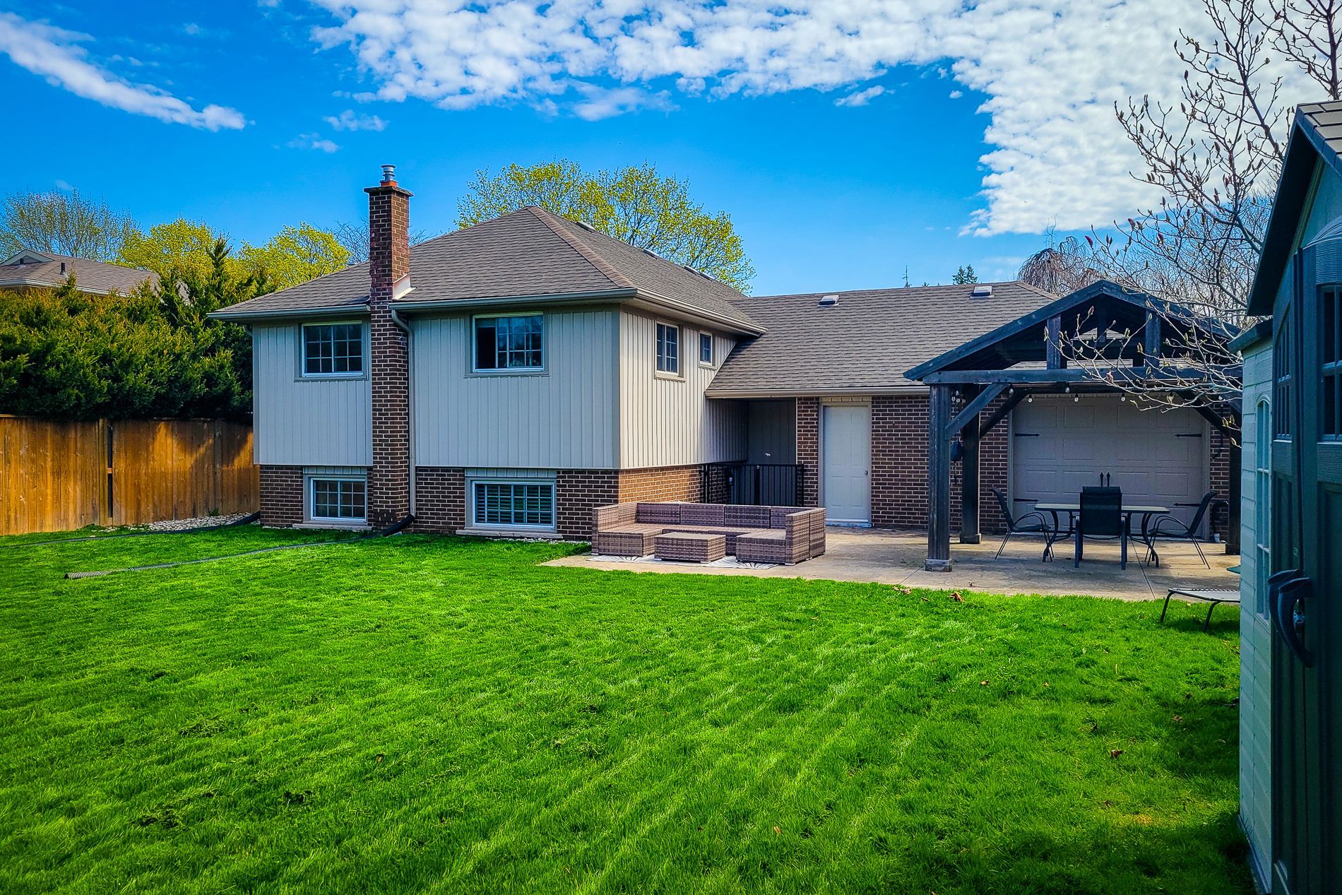 Nestled on a quiet cul-de-sac and set on a large lot with no rear neighbours, this beautifully maintained raised-ranch bungalow offers the perfect blend of space, privacy, and convenience. Backing onto lakeview park, you'll enjoy peaceful views and a serene setting just minutes from the lake and waterfront trail. The main level features a bright and spacious living room, a separate dining area, and an inviting eat-in kitchen complete with granite countertops, tiled backsplash, ample cabinetry, and a walk-out to the side porch-ideal for outdoor dining and entertaining. Three good sized bedrooms and a full 4-piece bathroom complete the upper level. The fully finished lower level offers excellent in-law or multi-generational living potential with its walk-up separate entrance. Enjoy a large family room with a cozy gas fireplace, a spacious fourth bedroom, an additional 4-piece bathroom, and a finished laundry room with plenty of storage space. Step outside to your private backyard oasis. Fully fenced and backing onto open fields, this impressive outdoor space features a stamped concrete patio, gazebo, pergola, and two storage sheds-perfect for relaxing or hosting family and friends. The attached garage also offers convenient rear yard access. Ideally located close to schools, parks, shopping, and all major amenities, this exceptional home combines comfort, functionality, and an unbeatable location. A fantastic opportunity for families, downsizers, or investors alike.