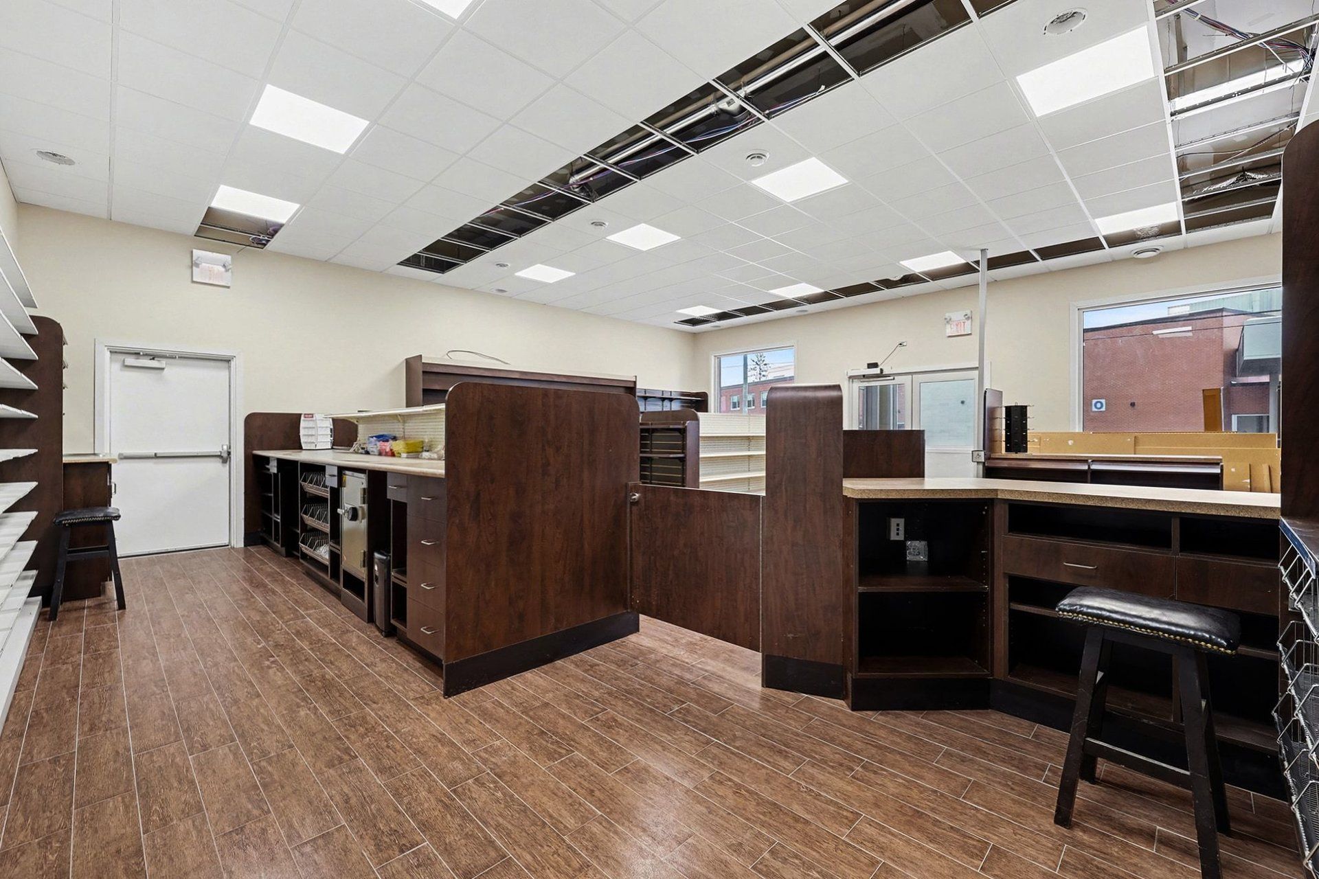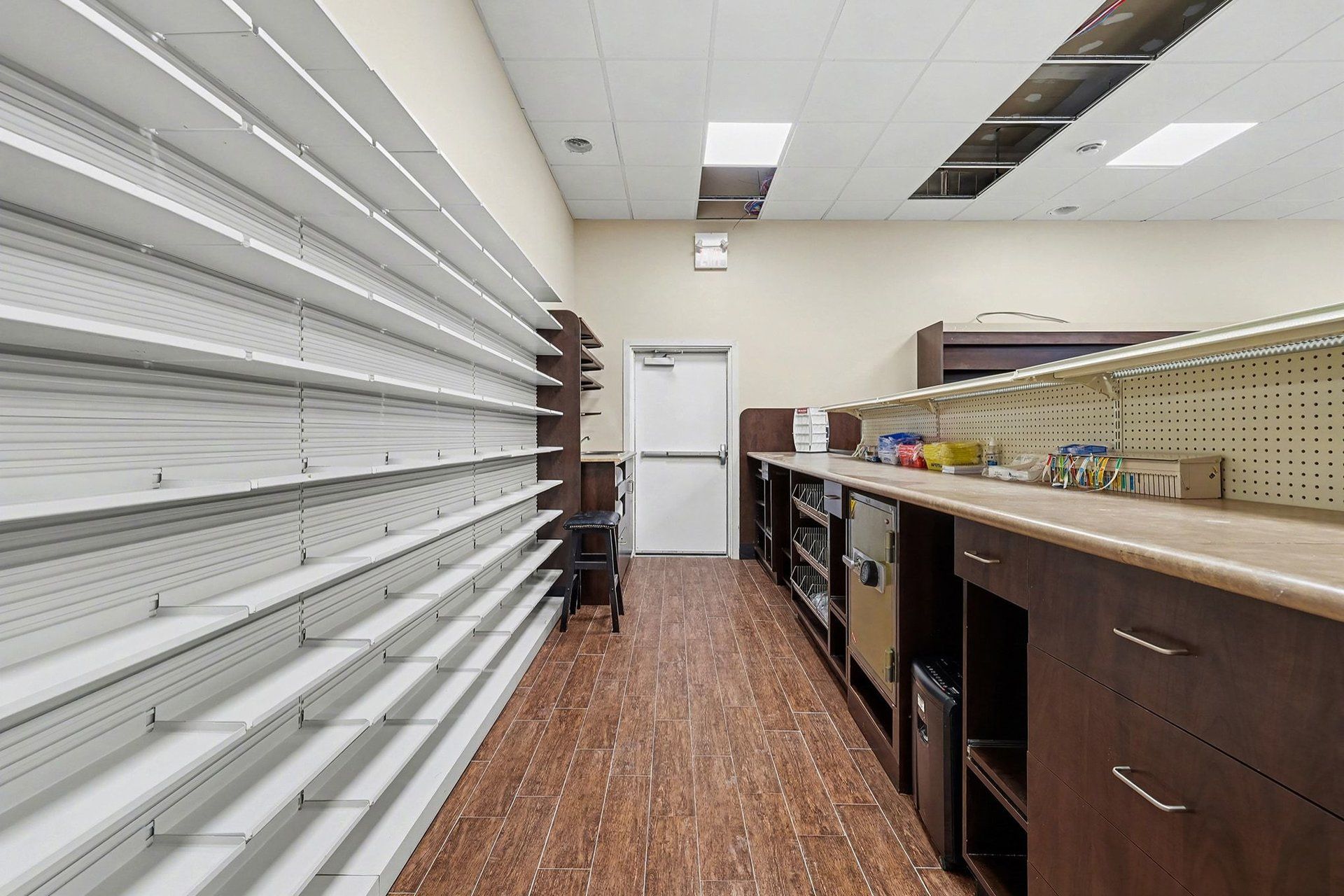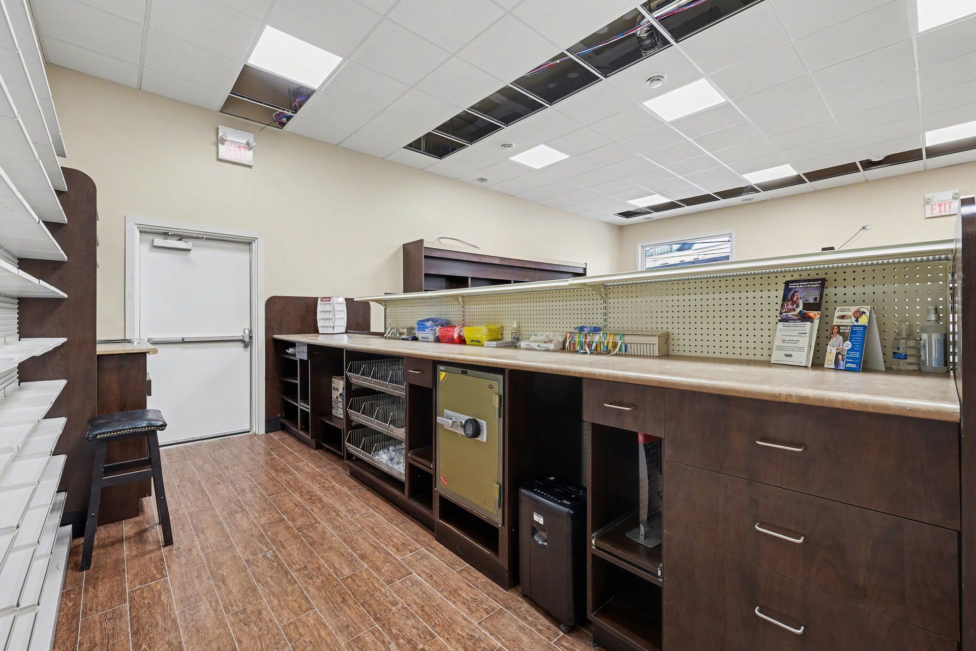• Fully equipped with pharmacy fixtures, including a narcotics safe and consultation room.
