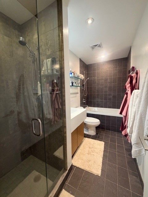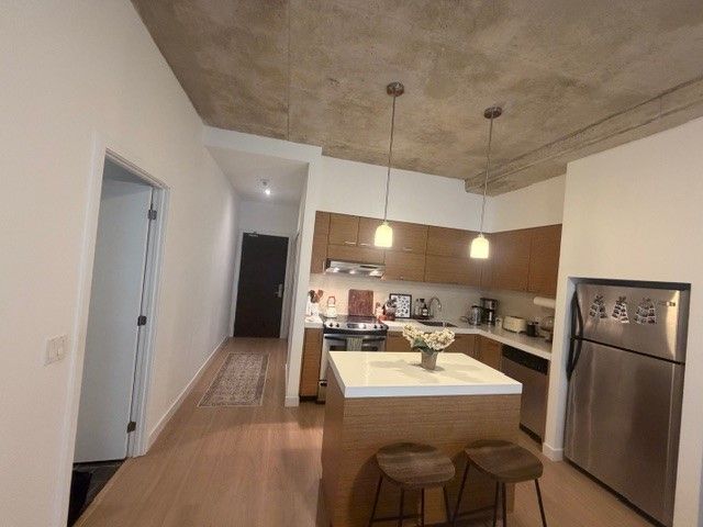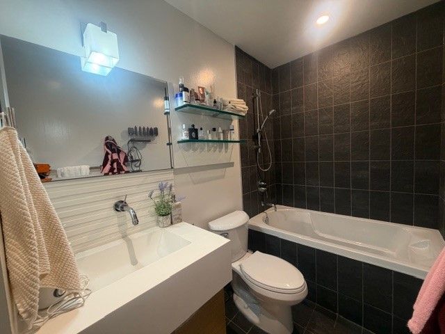 55 stewart street - a striking glass residence in the heart of vibrant king west, offering direct access to the luxury 1 hotel and its world-class amenities. This stylish 1-bedroom suite features approximately 610 sq. Ft. Of thoughtfully designed living space, plus a full length balcony. Enjoy soaring 10' exposed concrete ceilings, floor-to-ceiling windows, engineered hardwood flooring, and a sleek modern kitchen with stainless steel appliances, centre island, and stacked washer & dryer. The spacious, spa-inspired bathroom is complete with a contemporary glass shower. Residents enjoy premium amenities including a fully equipped fitness centre, rooftop terrace with bbqs, party room, 24-hour concierge, and a stunning rooftop pool with panoramic skyline views. An exceptional opportunity for a professional seeking refined urban living with unmatched convenience. One storage locker included.