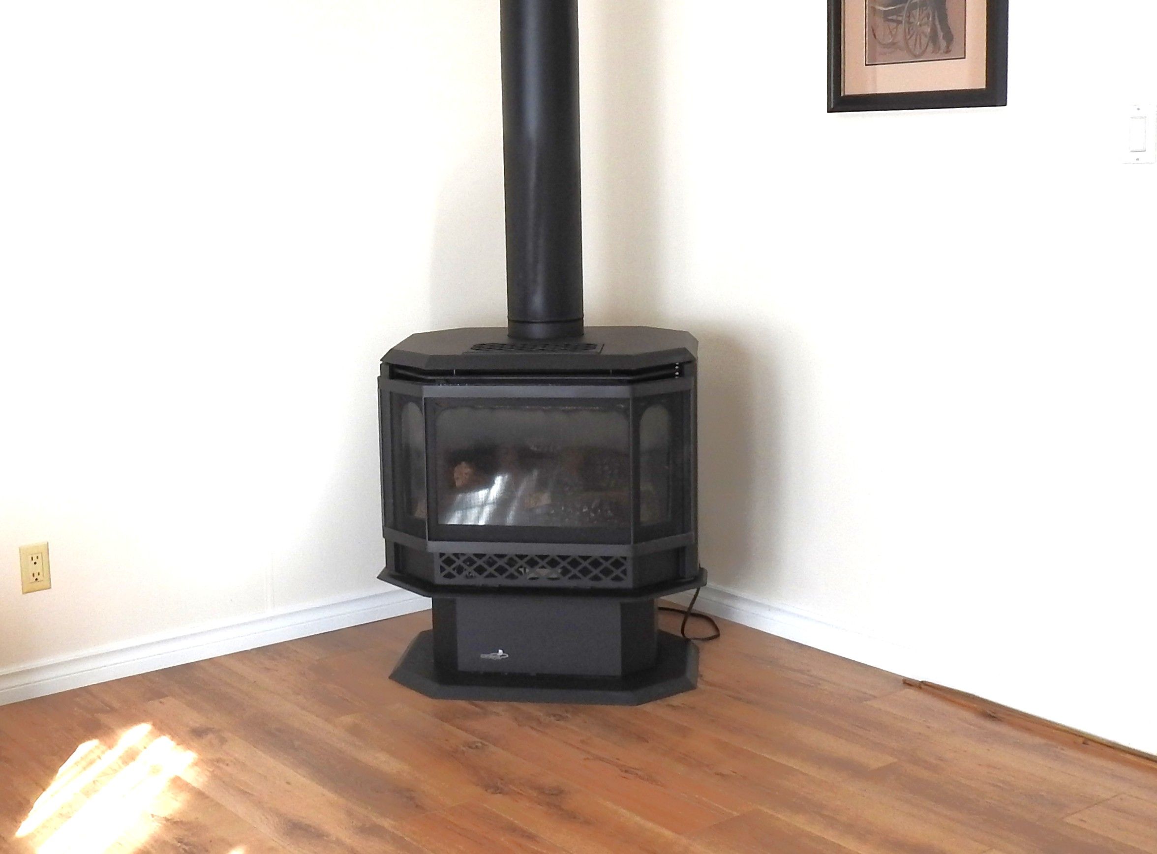 • Spacious living room with a gas fireplace and large windows.