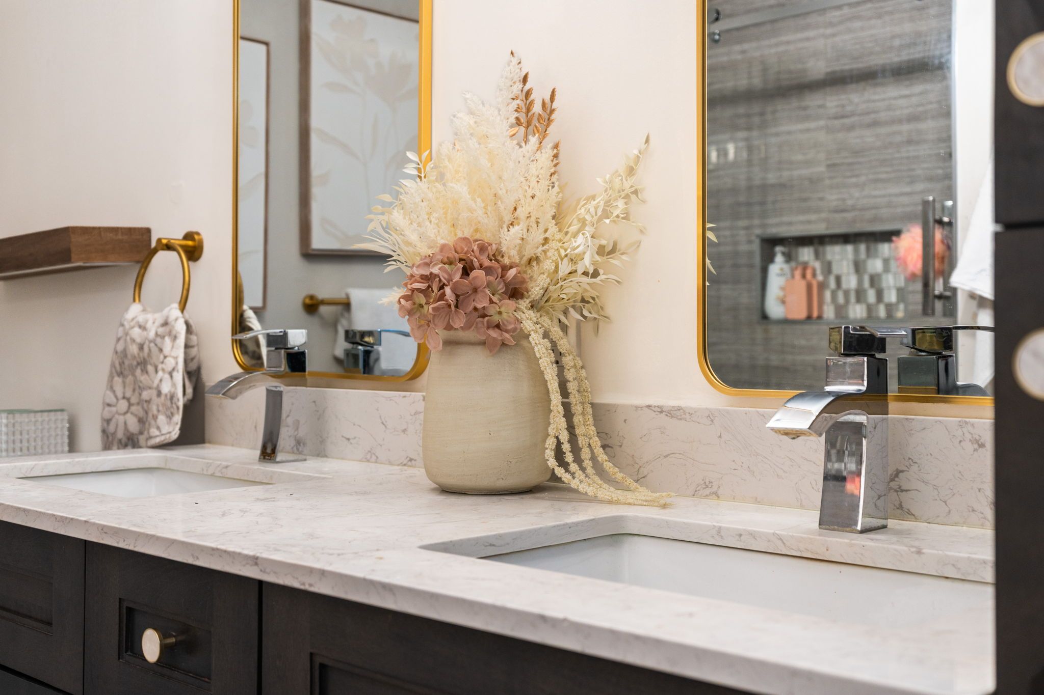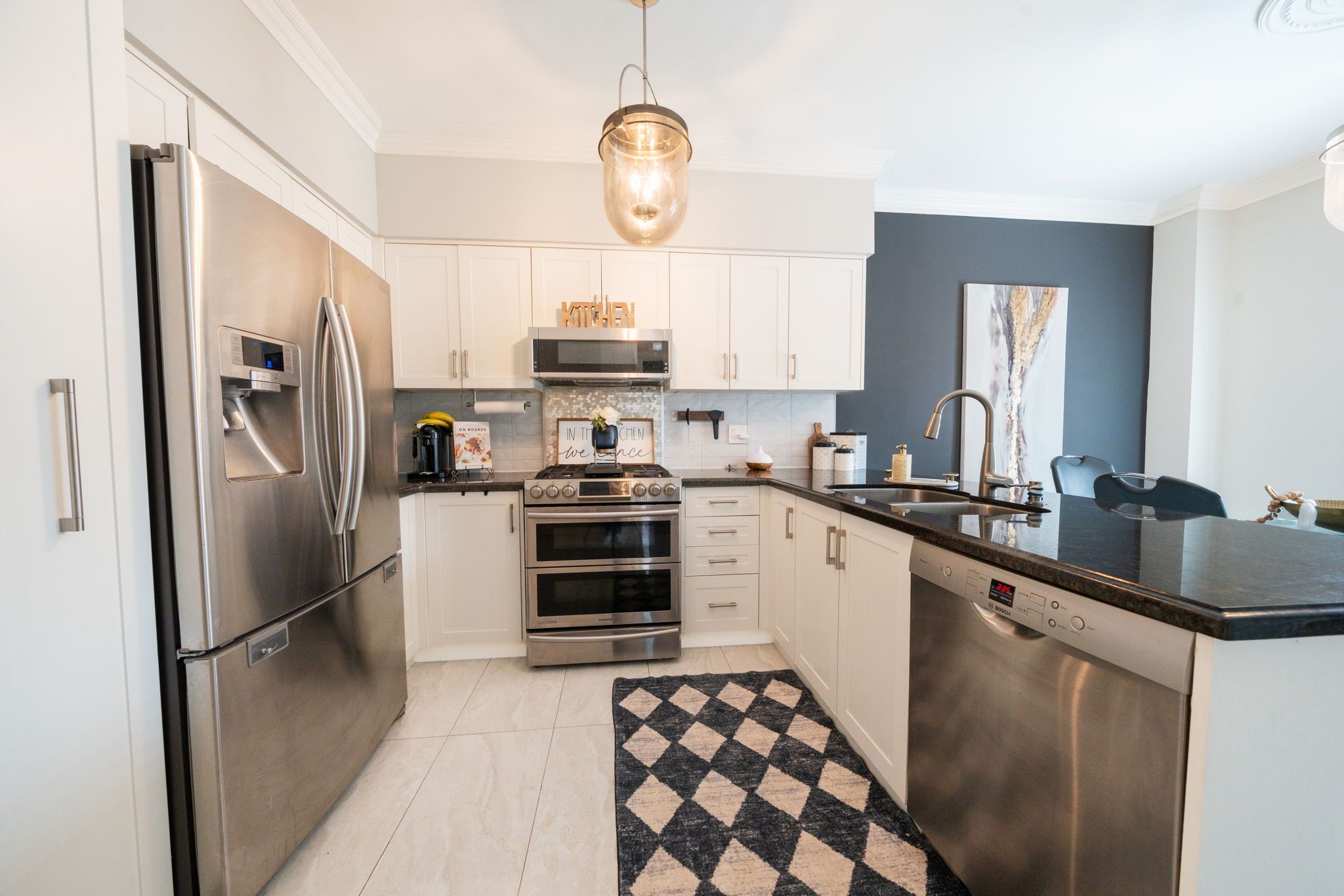 • Modern kitchen with quartz counters and stainless steel appliances.