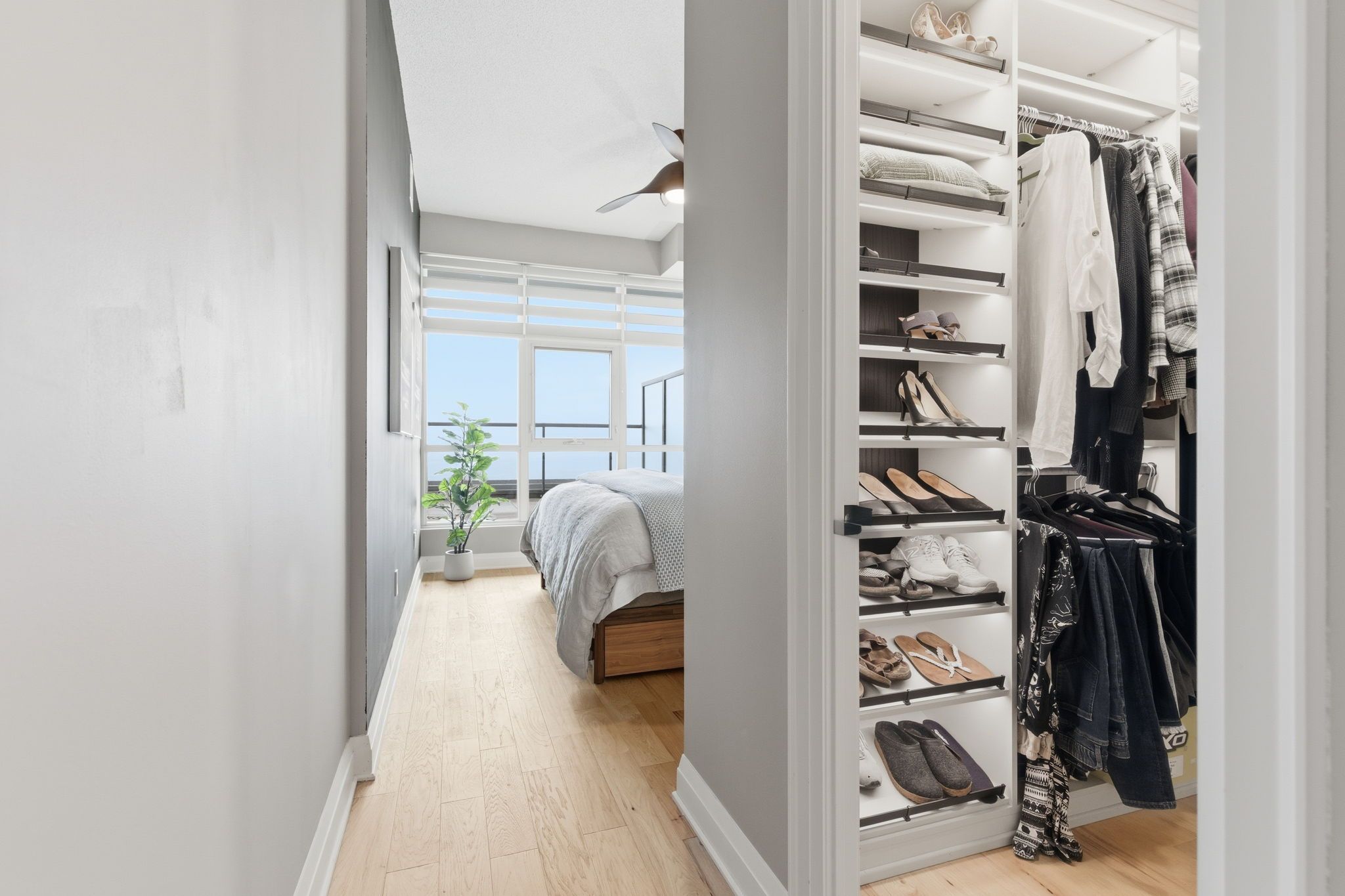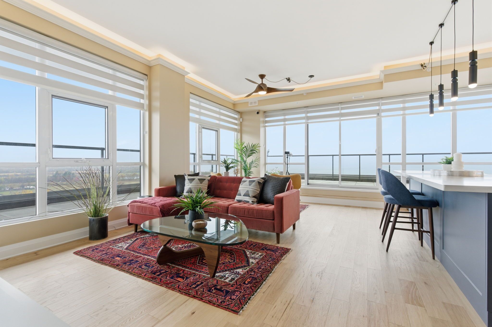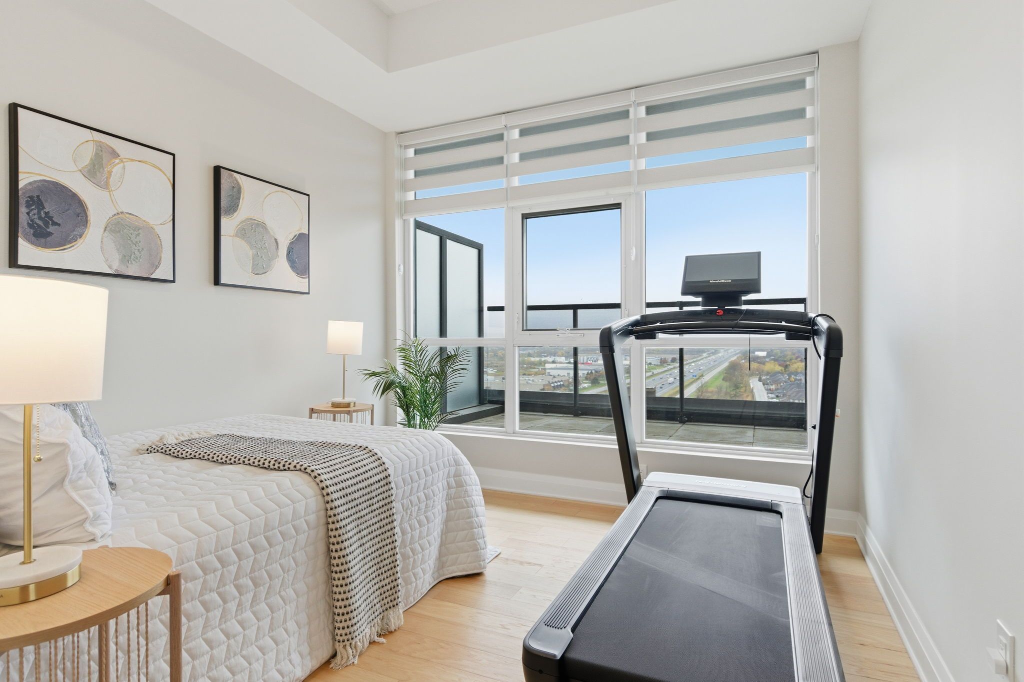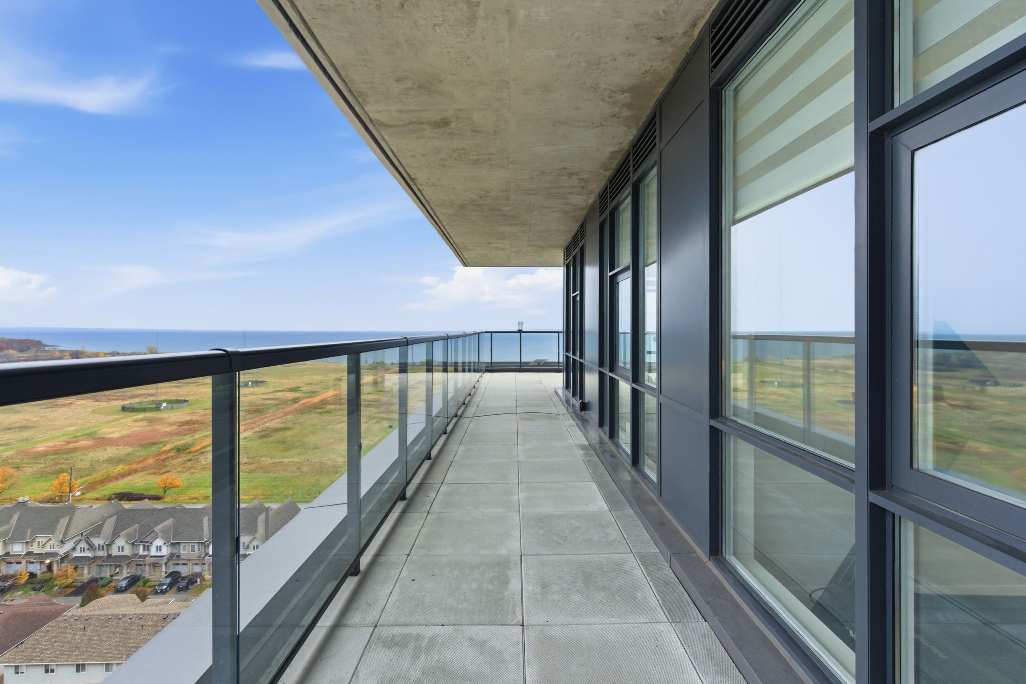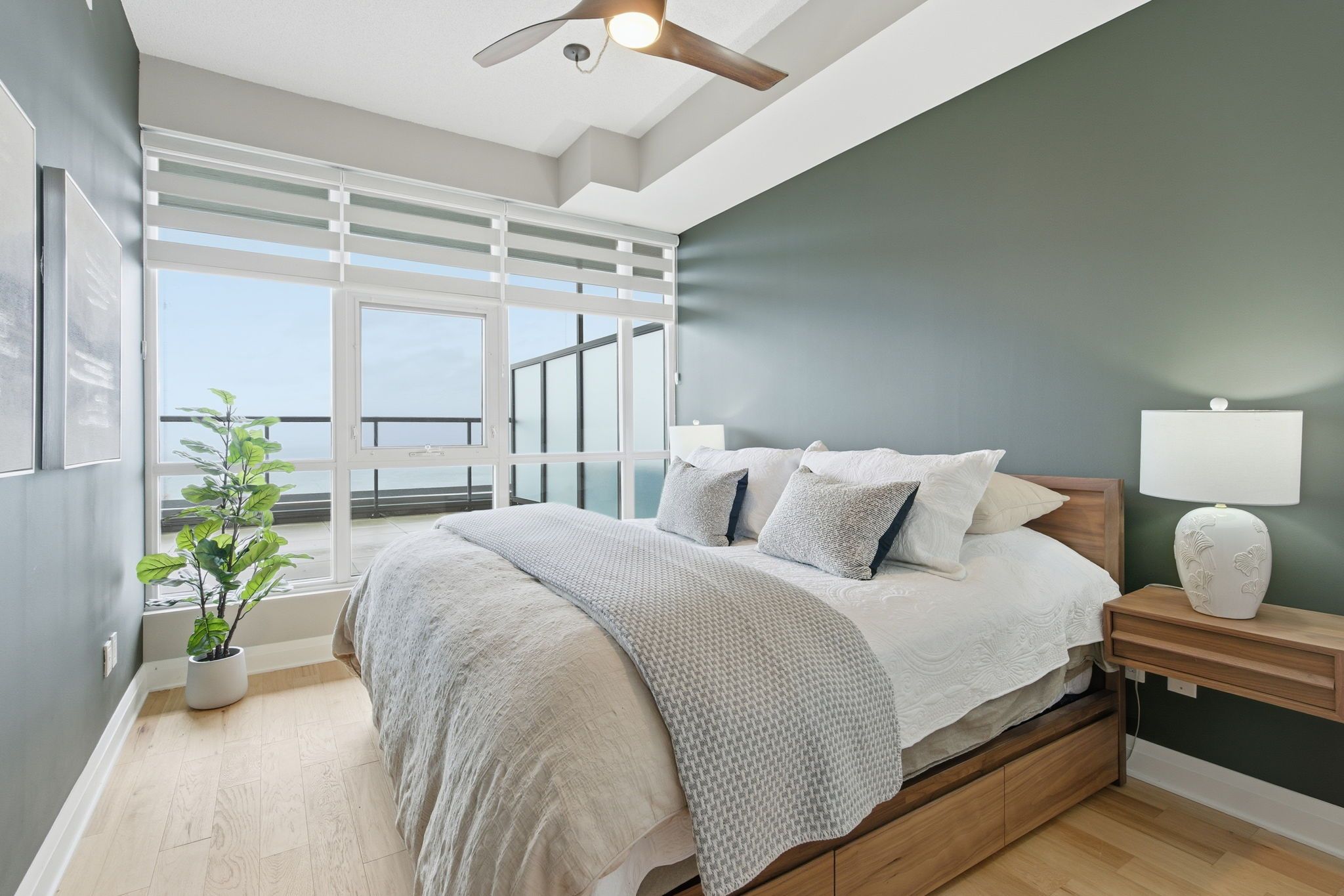• Floor-to-ceiling windows offer stunning views of the lake and skyline.