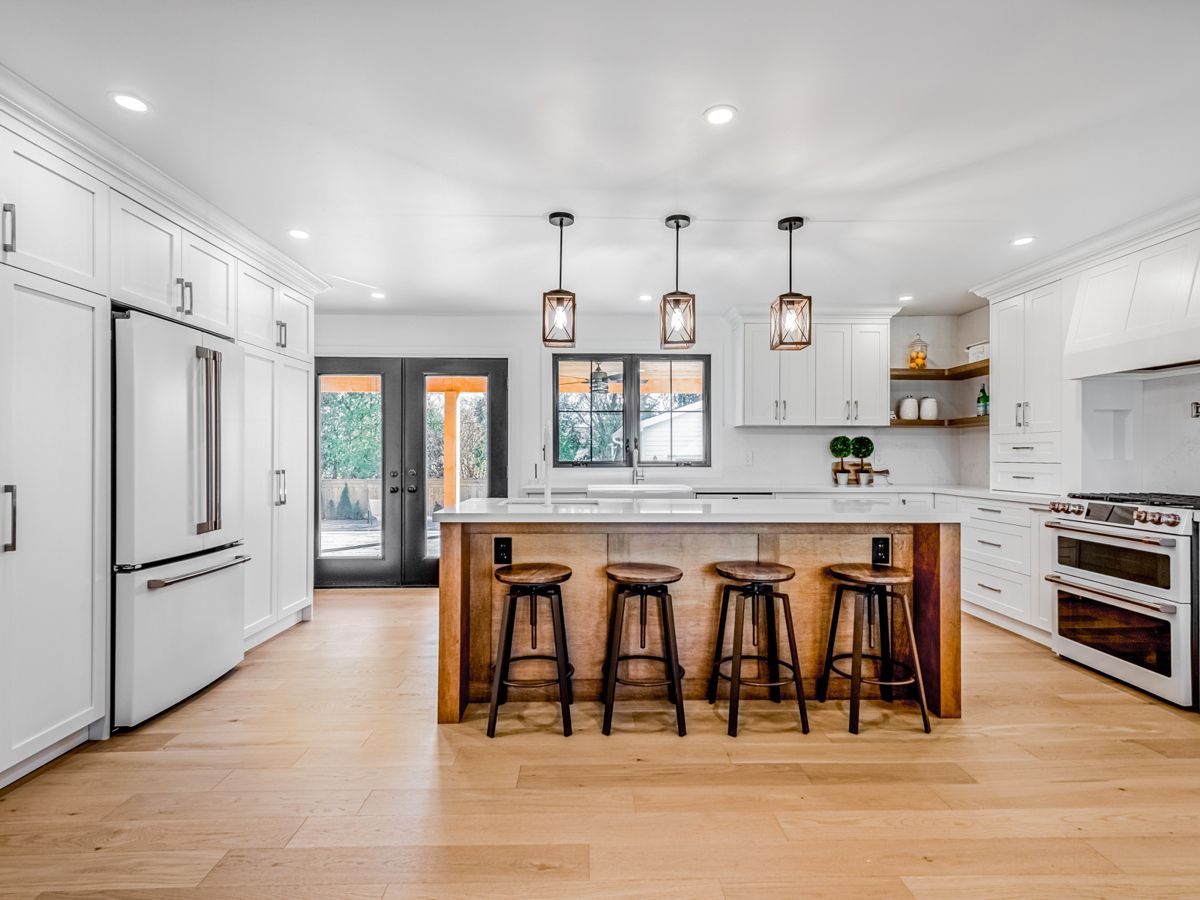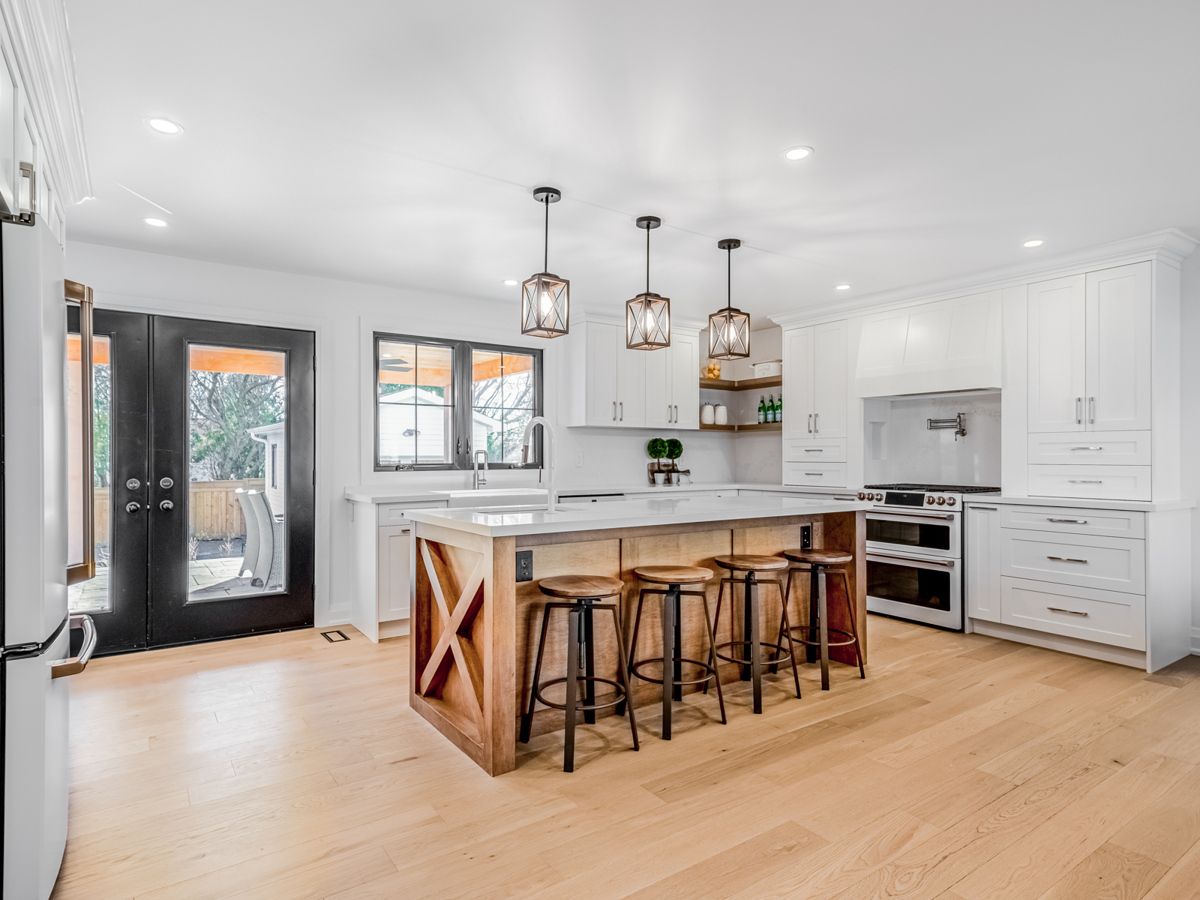 • Open-concept dining area and chef-inspired kitchen overlooking a beautiful backyard.