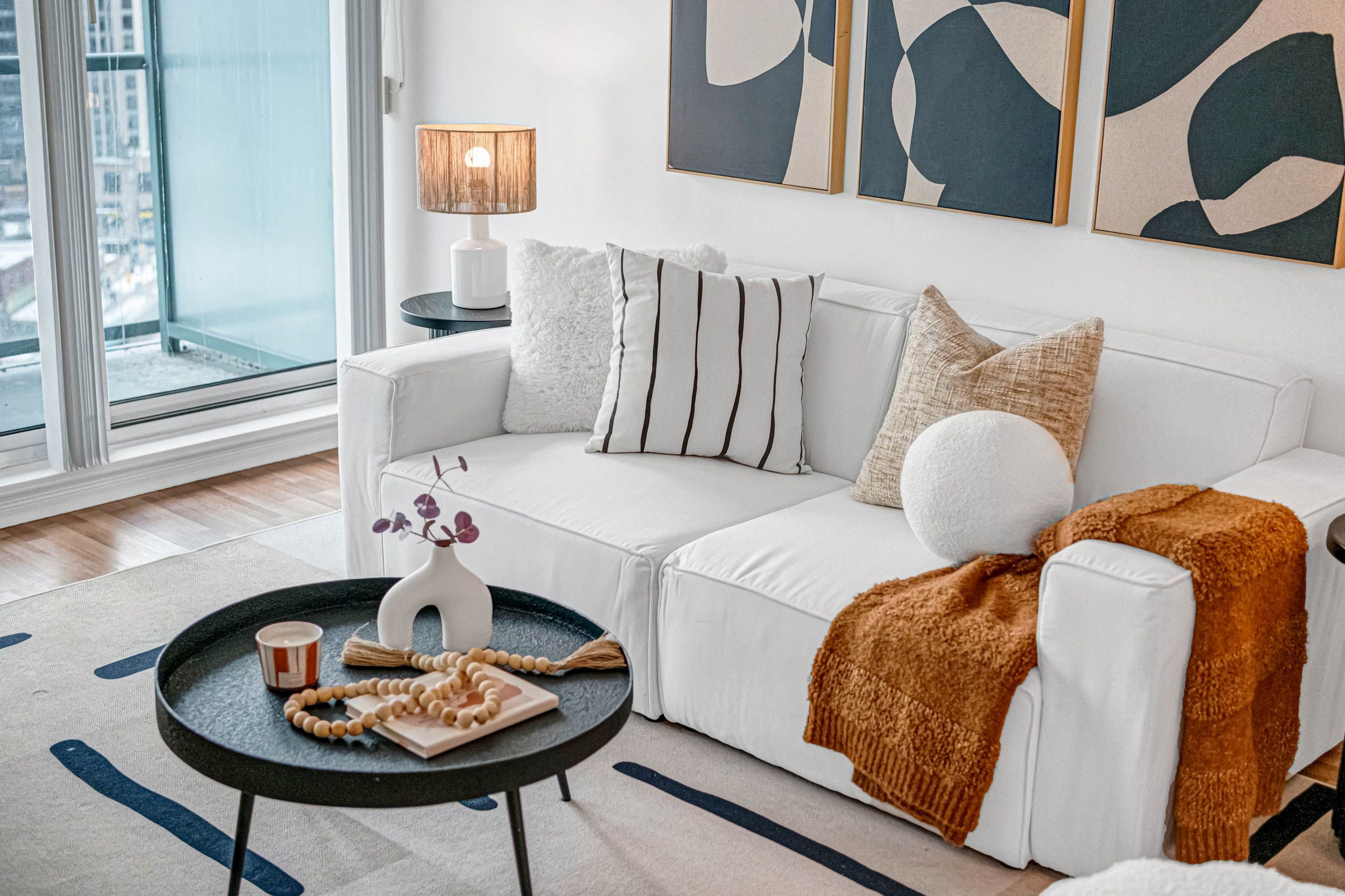 • Open-concept layout with floor-to-ceiling windows and city views.