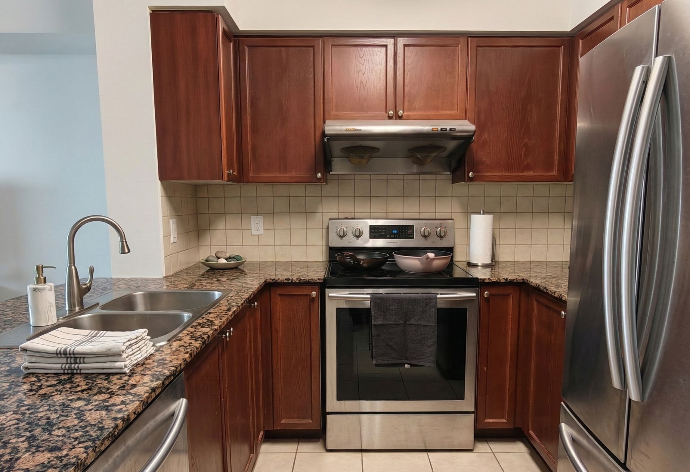 • Updated kitchen equipped with granite countertops and stainless steel appliances.