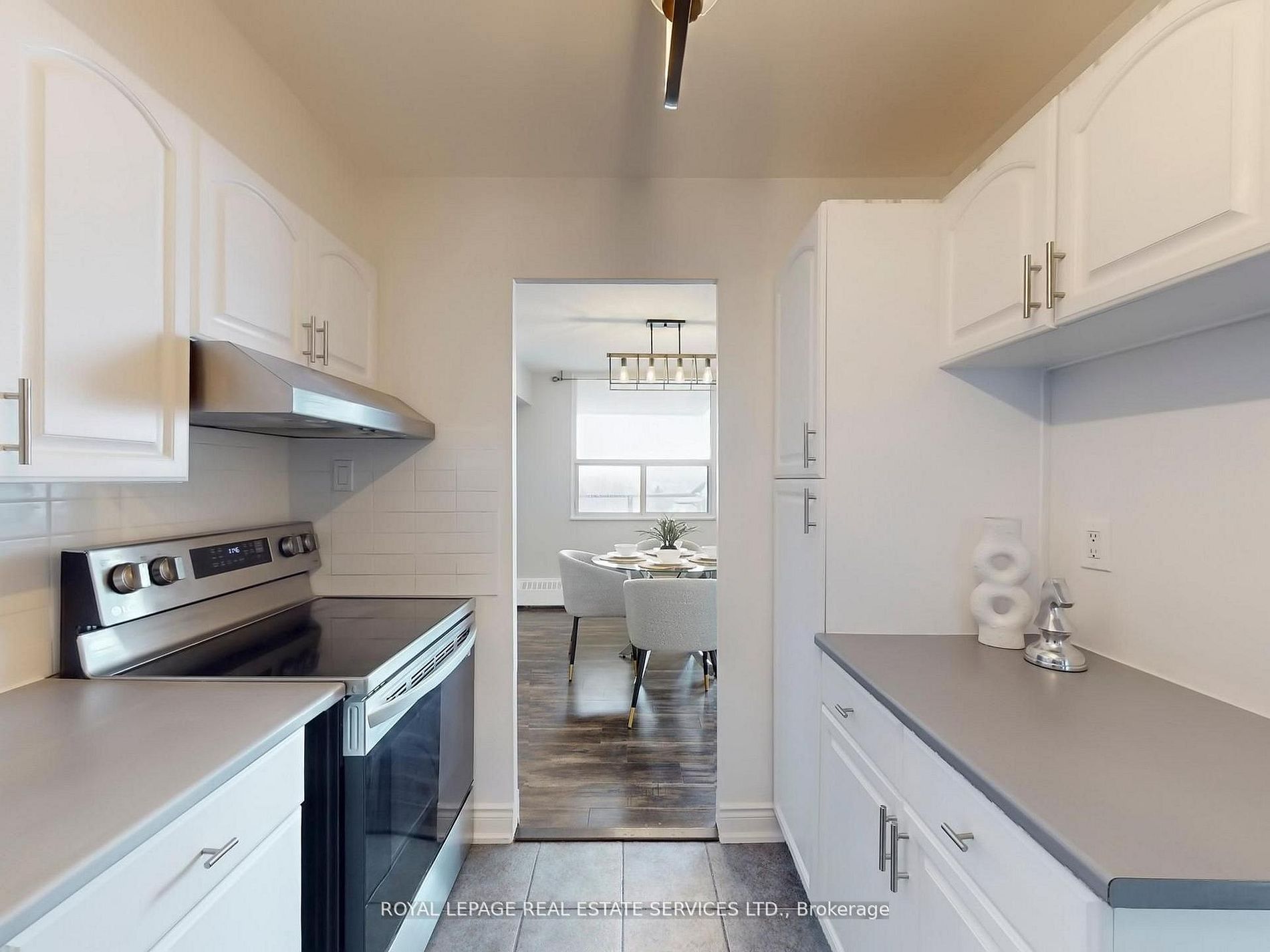 • Modern eat-in kitchen features sleek cabinetry and stainless steel appliances.