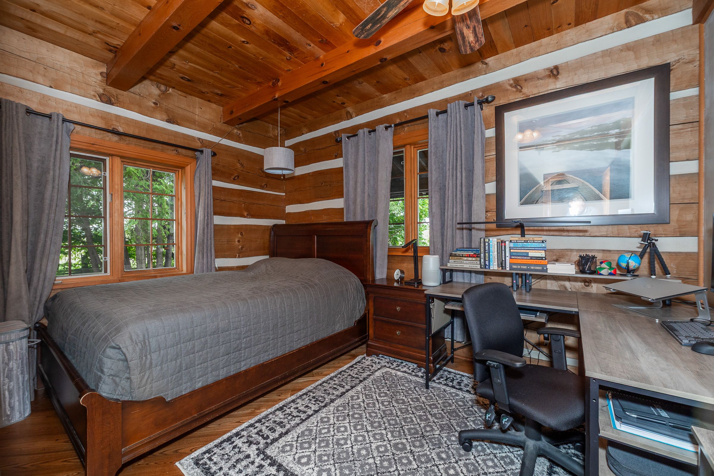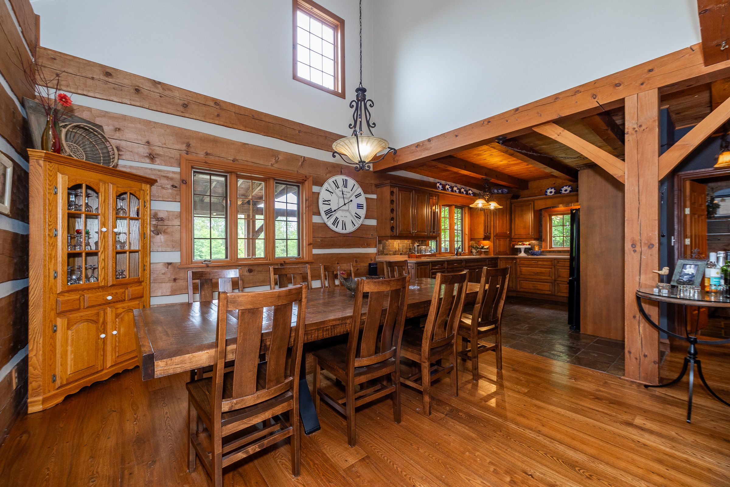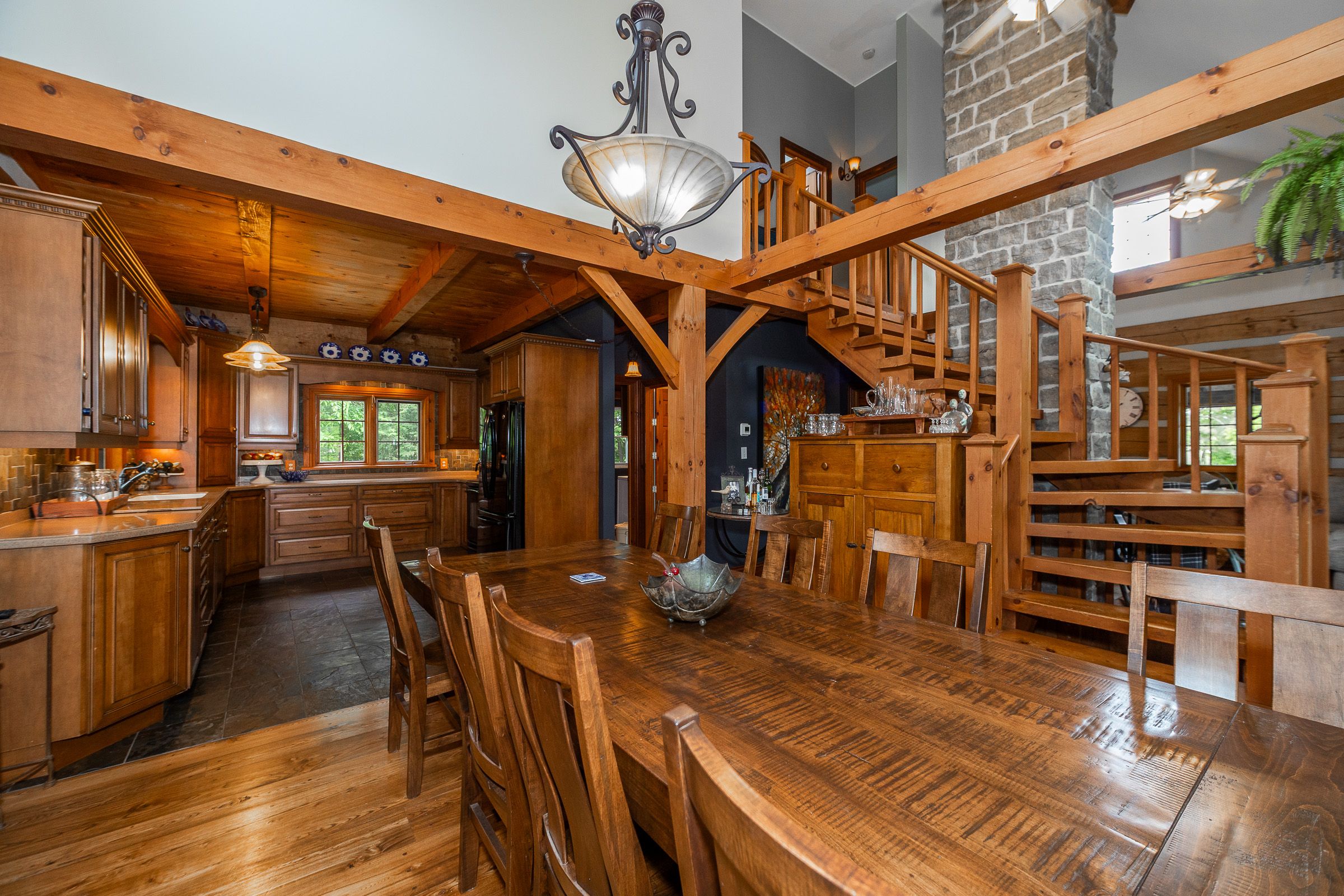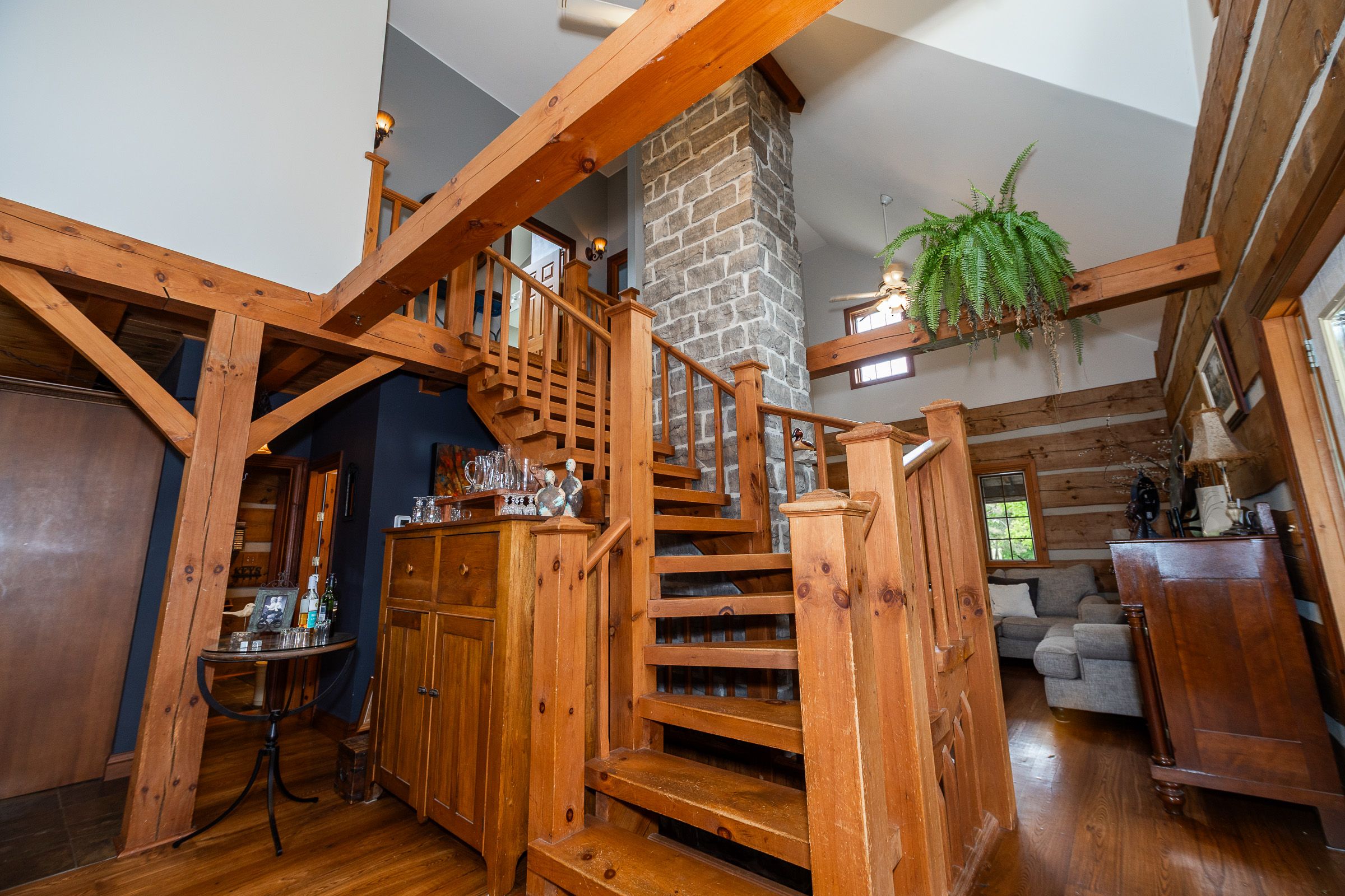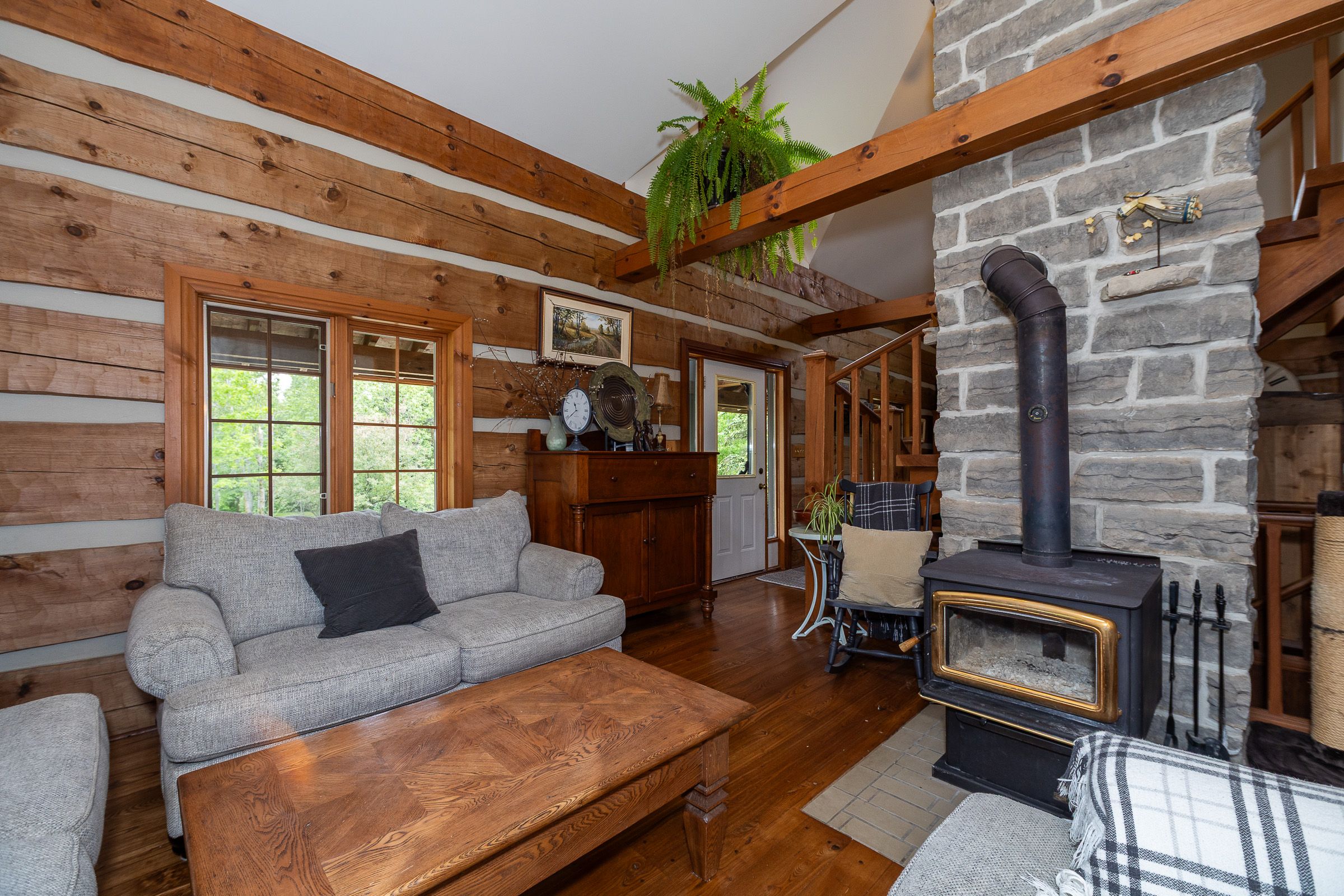 • Log home features antique hardwood flooring and central stone chimney.
