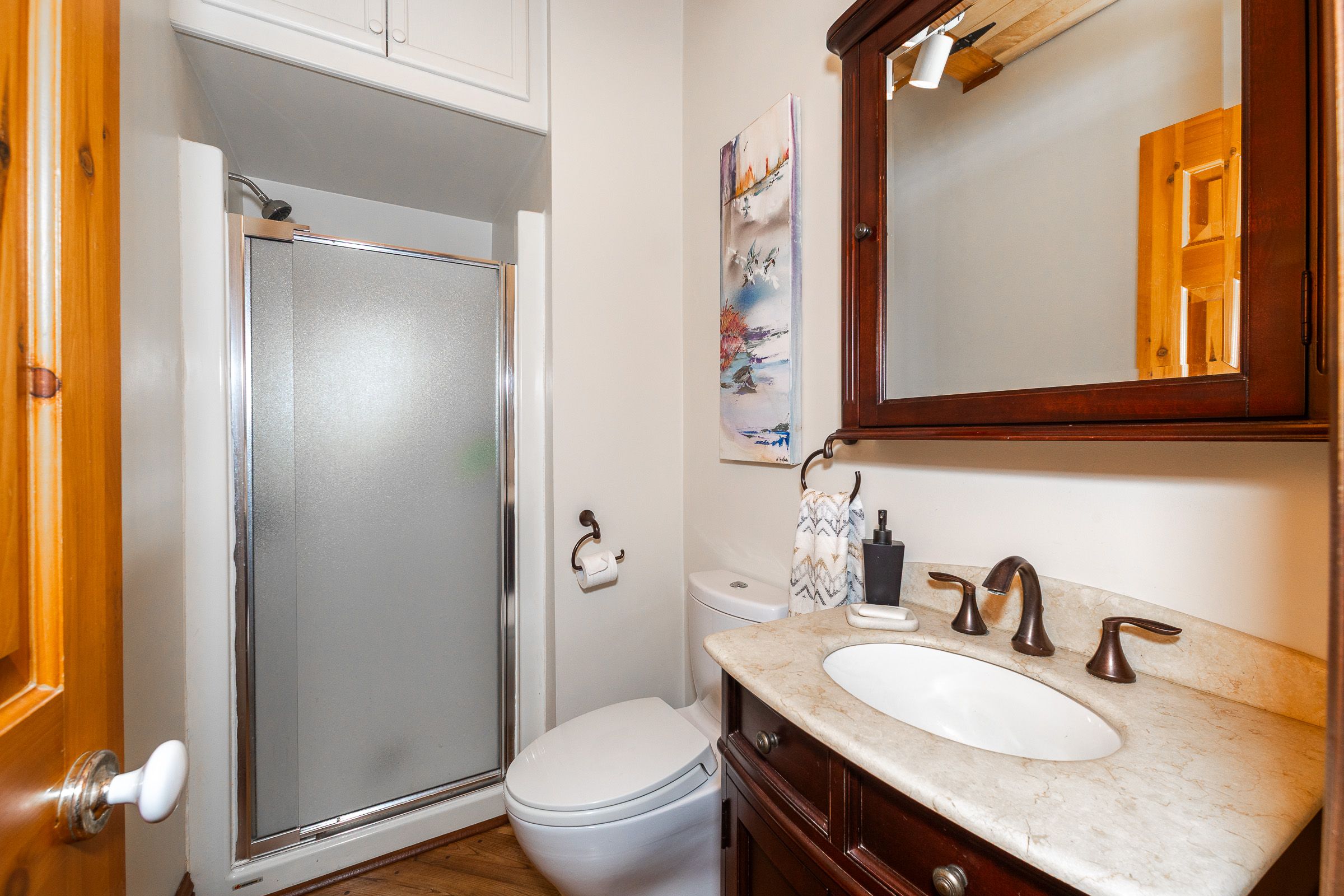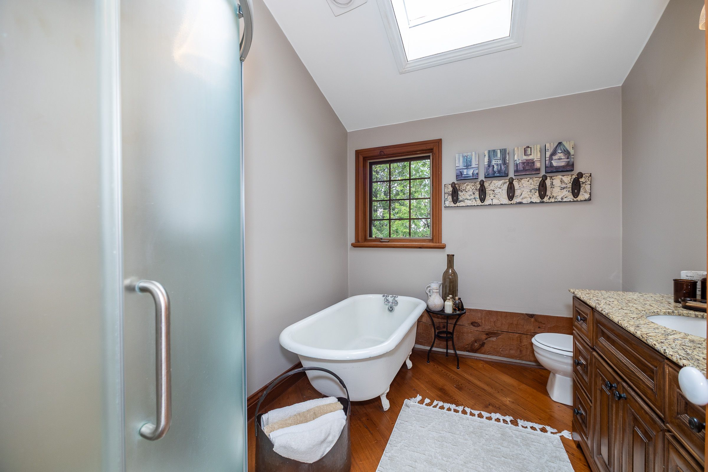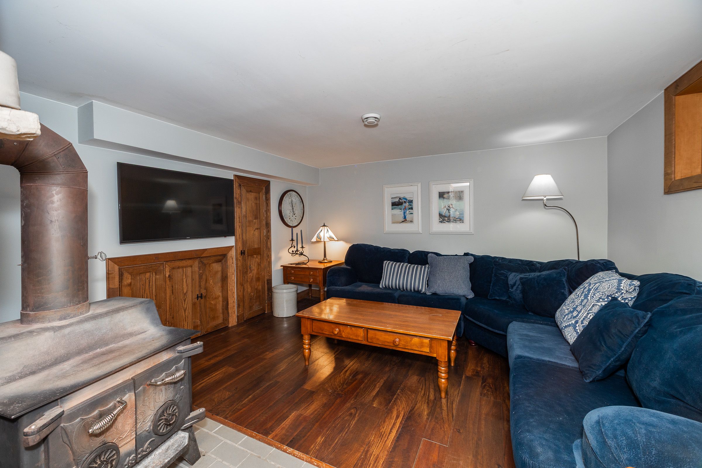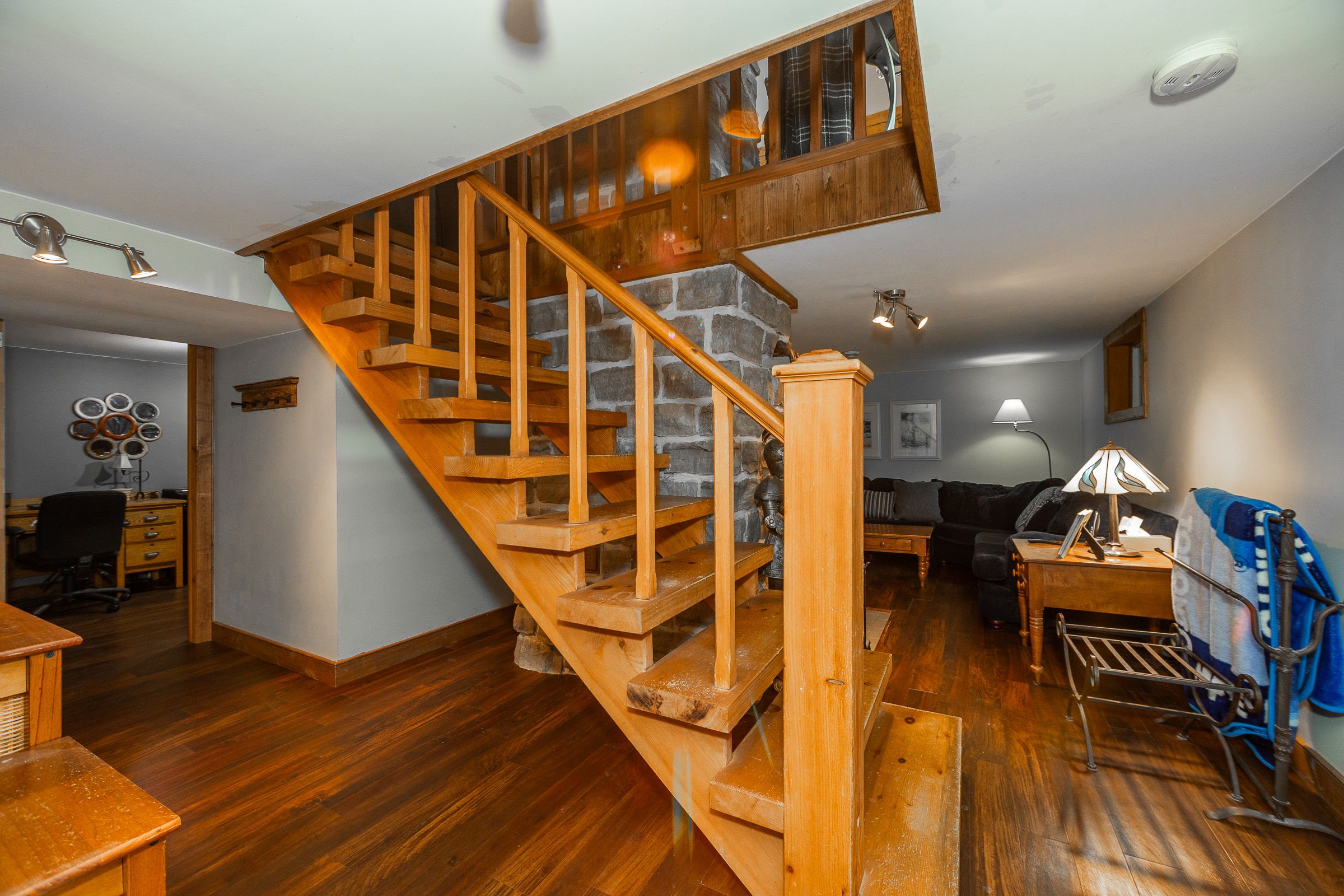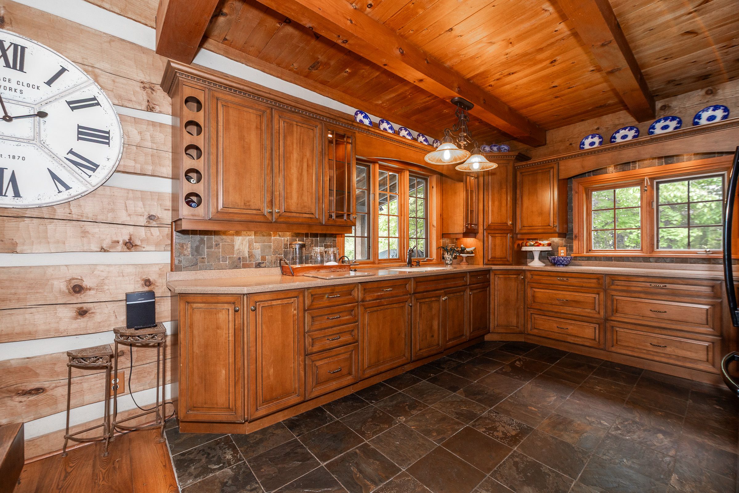 • Log home features antique hardwood flooring and central stone chimney.