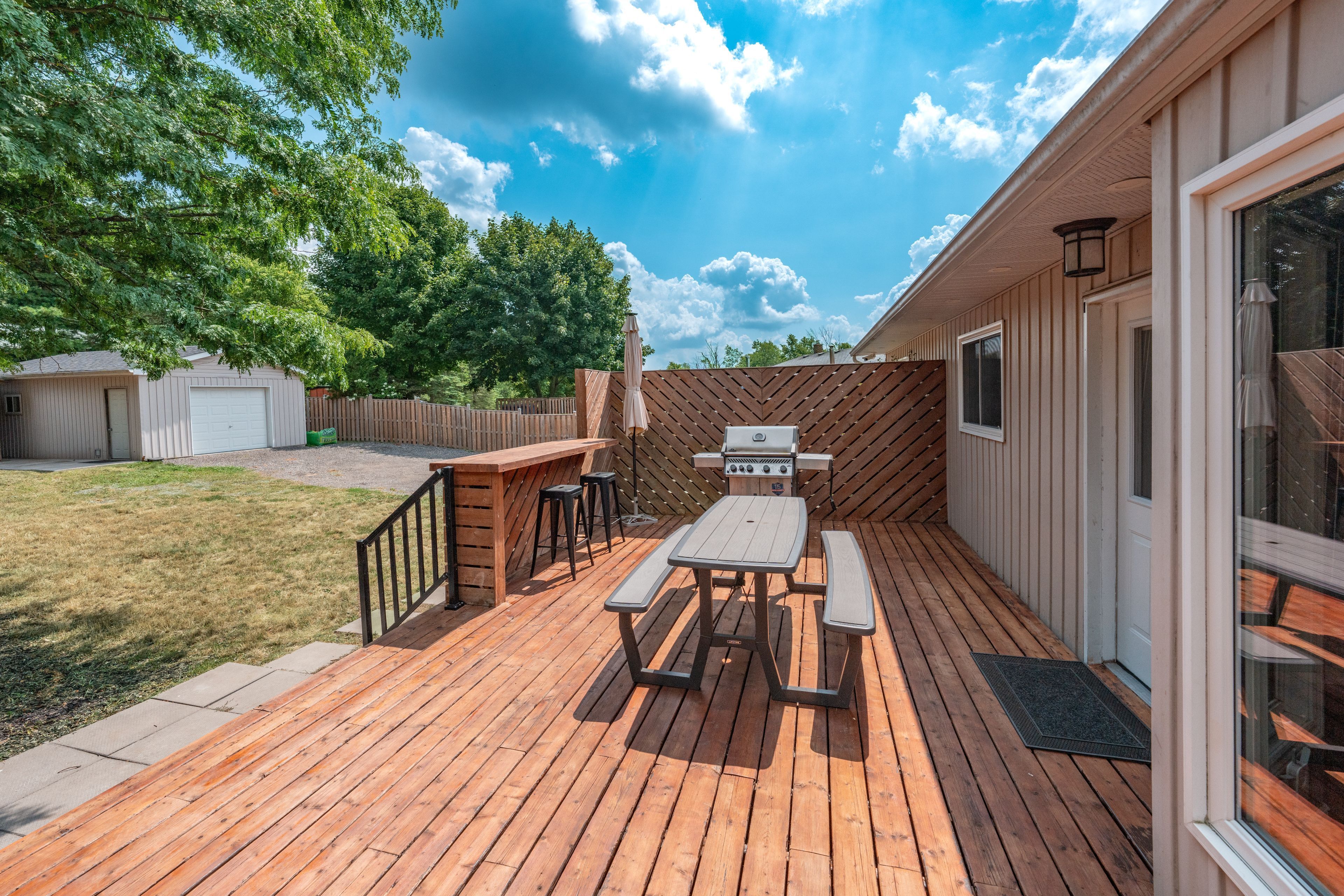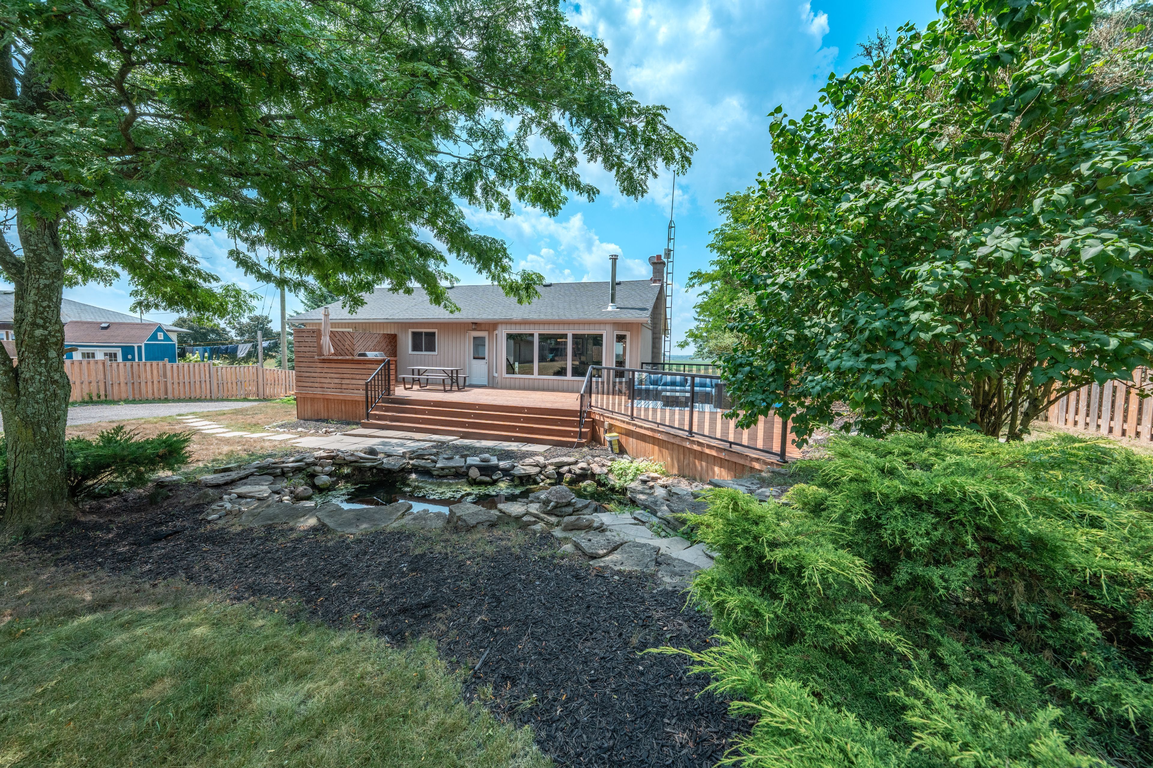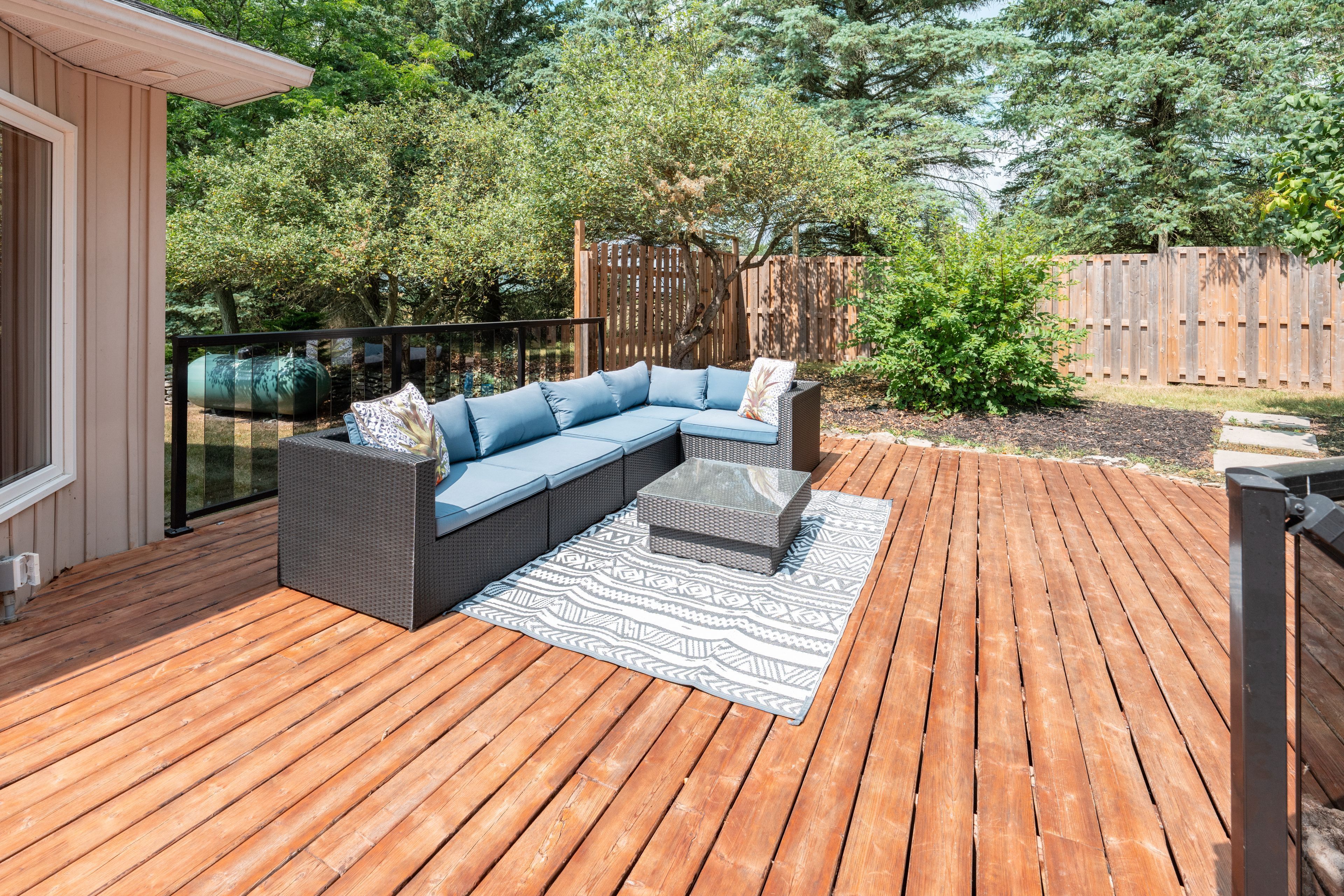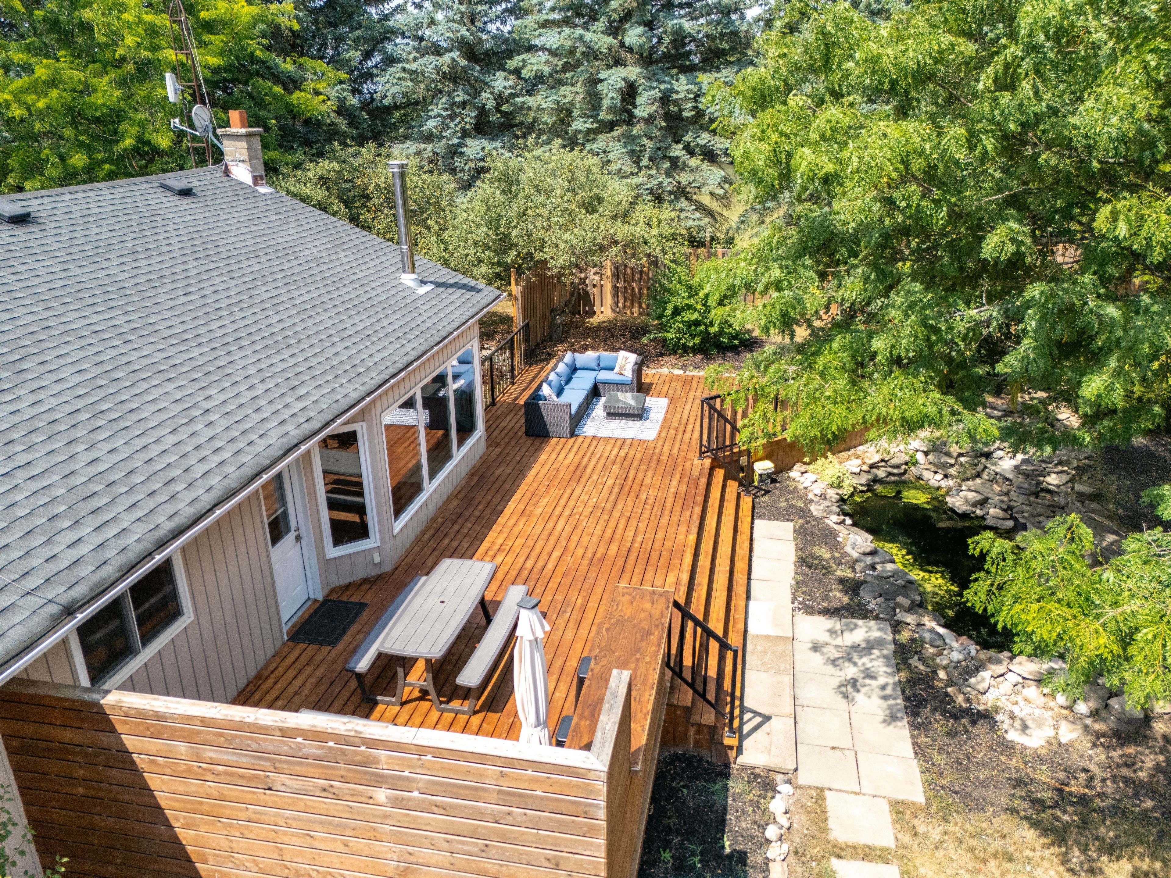 • Generous deck overlooks a tranquil pond and waterfall feature.