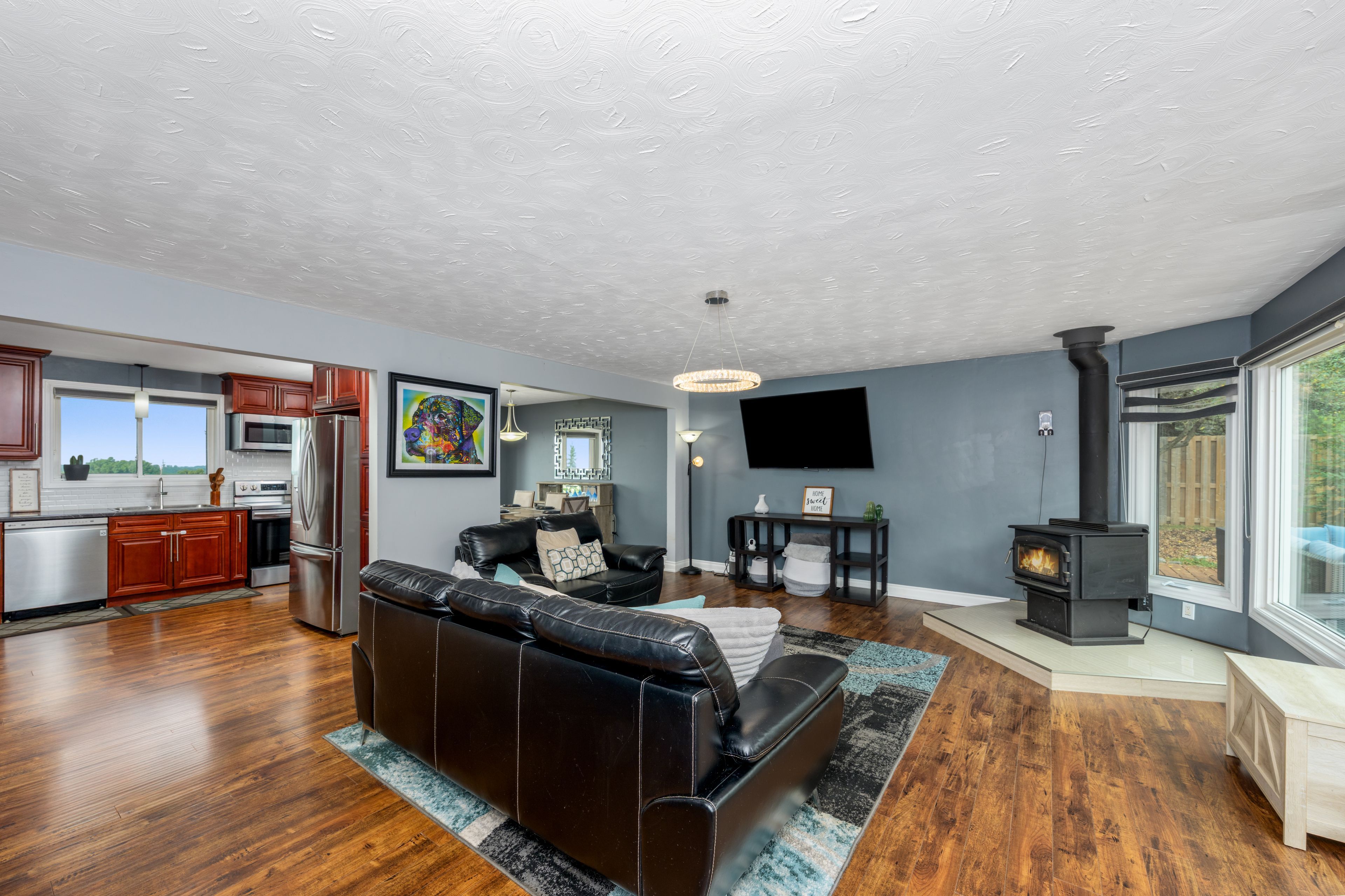 • Bright open concept living area includes a fireplace and spacious kitchen.