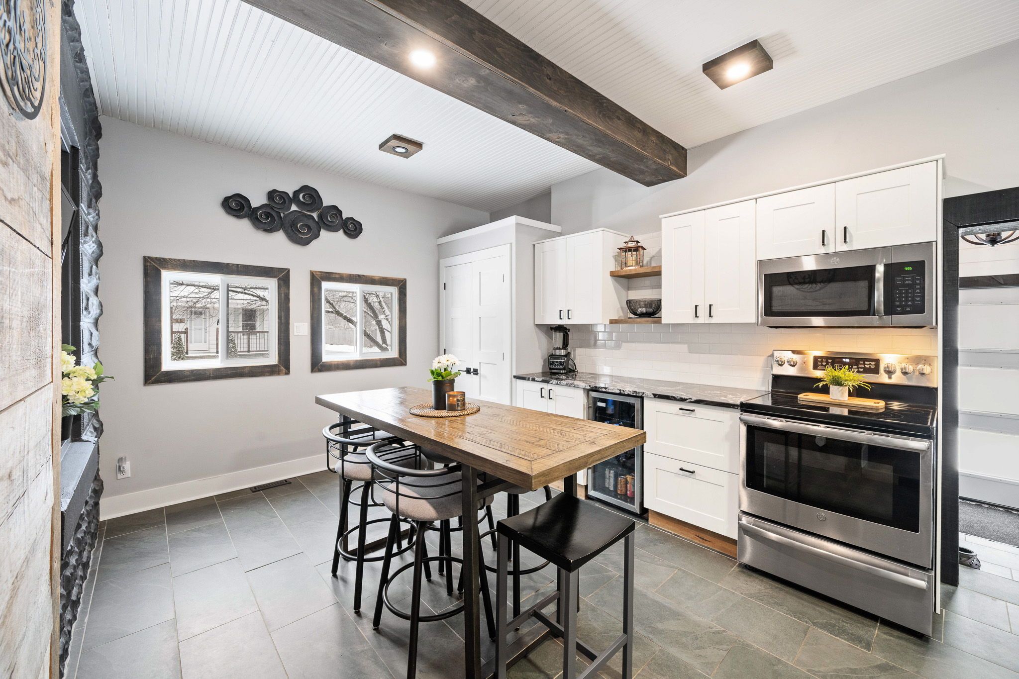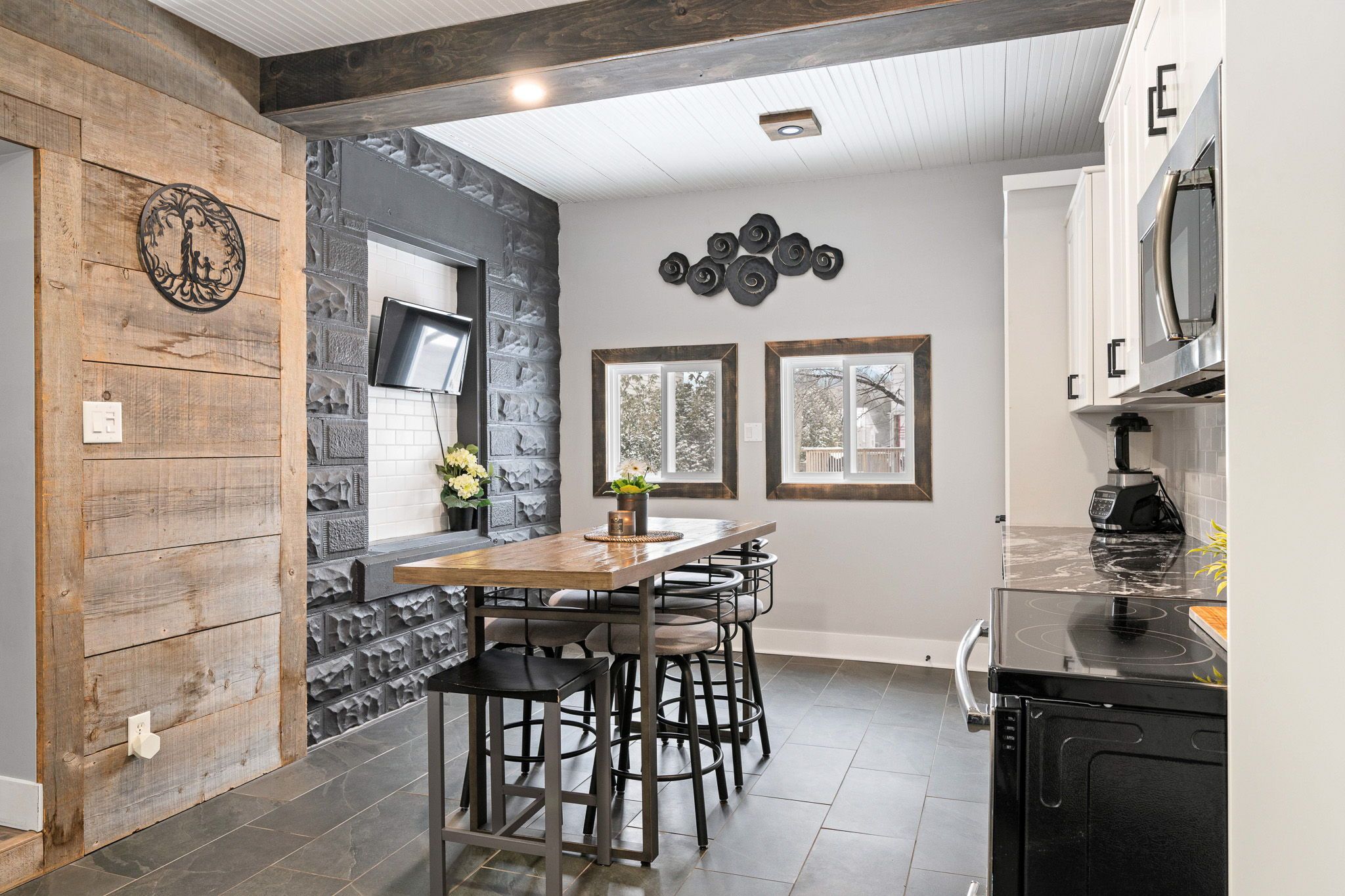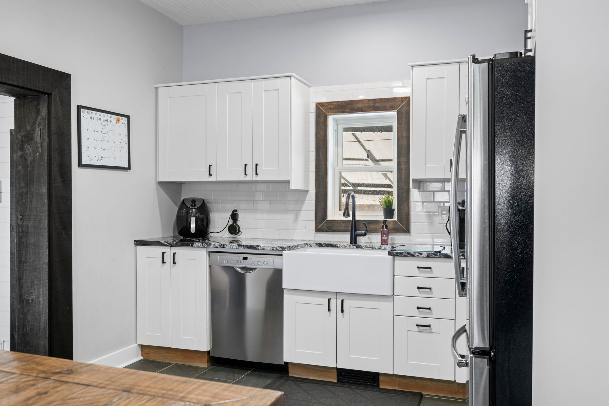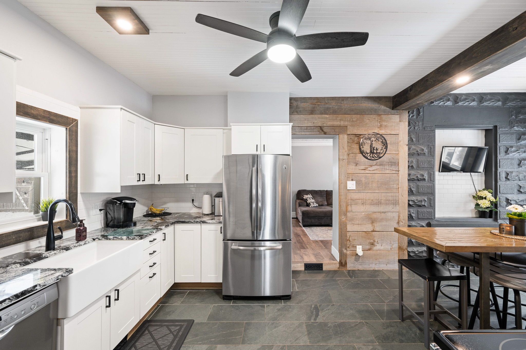 Beautifully renovated home blending modern upgrades with timeless character, ideally situated on a desirable corner lot. Extensive improvements since 2020 include all new flooring throughout, fresh neutral paint, updated lighting, and widened interior doorways with modern 4-panel doors and hardware. The main floor features a fully redesigned kitchen with ge stainless steel appliances, granite countertops, white shaker cabinetry, subway tile backsplash, led pot lighting, and a 32" farmhouse sink. Original 1920 tin ceilings and crown moulding have been refinished in crisp white, adding charm and character. A convenient mudroom addition off the kitchen offers additional storage and access to the backyard, along with a stylish black steel entry door. Upstairs, the second floor includes a renovated full bathroom with new plumbing, a large porcelain tub with full-height tile surround, new vanity and toilet, plus a custom barn board accent wall. The primary bedroom features a newly created walk-in closet. The third floor offers additional living space with updated laminate flooring. Step outside to enjoy a fully fenced yard with double gate access from the street, perfect for trailers, equipment, or added convenience. A standout feature is the authentic original barn with loft, ideal for a workshop, hobby space, or at-home business setup. Additional updates include armour stone front steps, refinished staircases on all three levels, interior barn doors, updated half bath with full-size stackable laundry and new mechanicals including furnace (2024), hot water tank (2020, gas), air conditioning (2020) and sand point well (2025). Windows were previously updated (approx. 2013). Located within walking distance to the public school, post office, and general store, and just a 2-minute drive to the grocery store, this home offers the perfect blend of small-town convenience and modern living. All measurements as per iguide floorplan. Buyer to confirm all room sizes.
