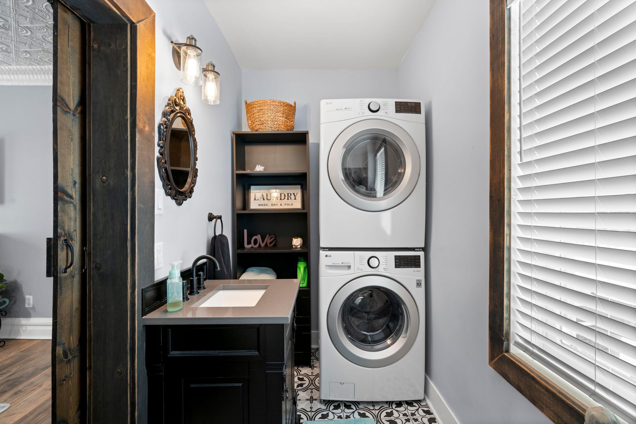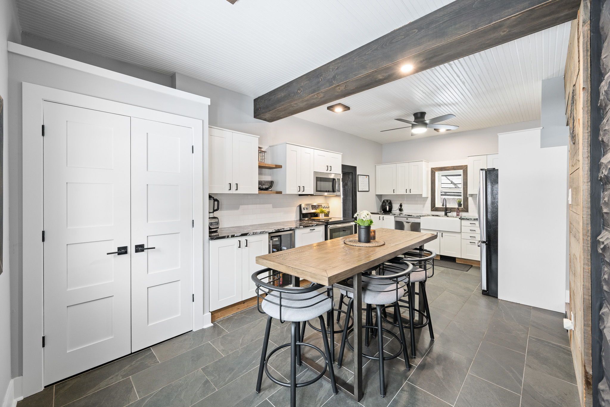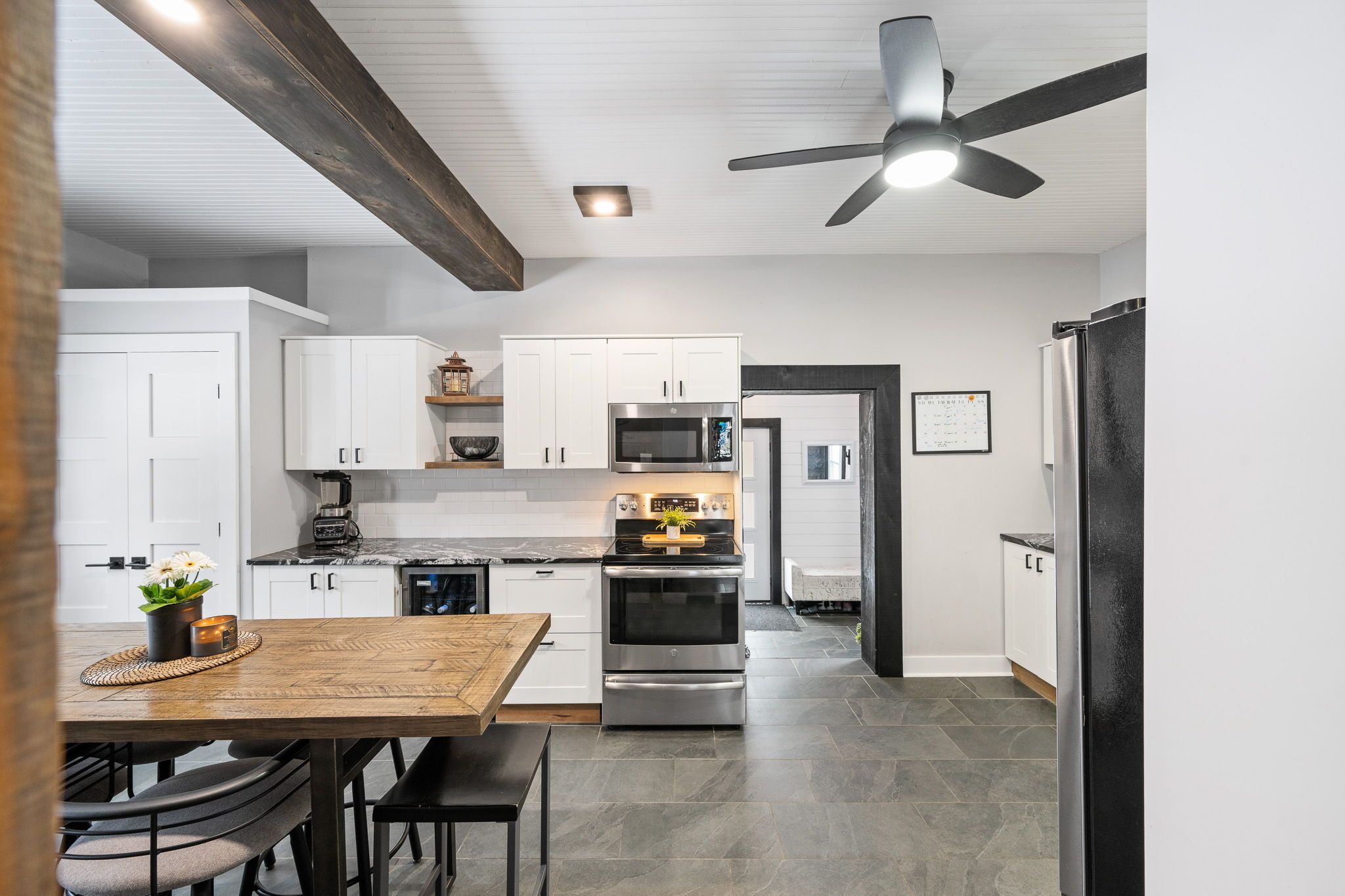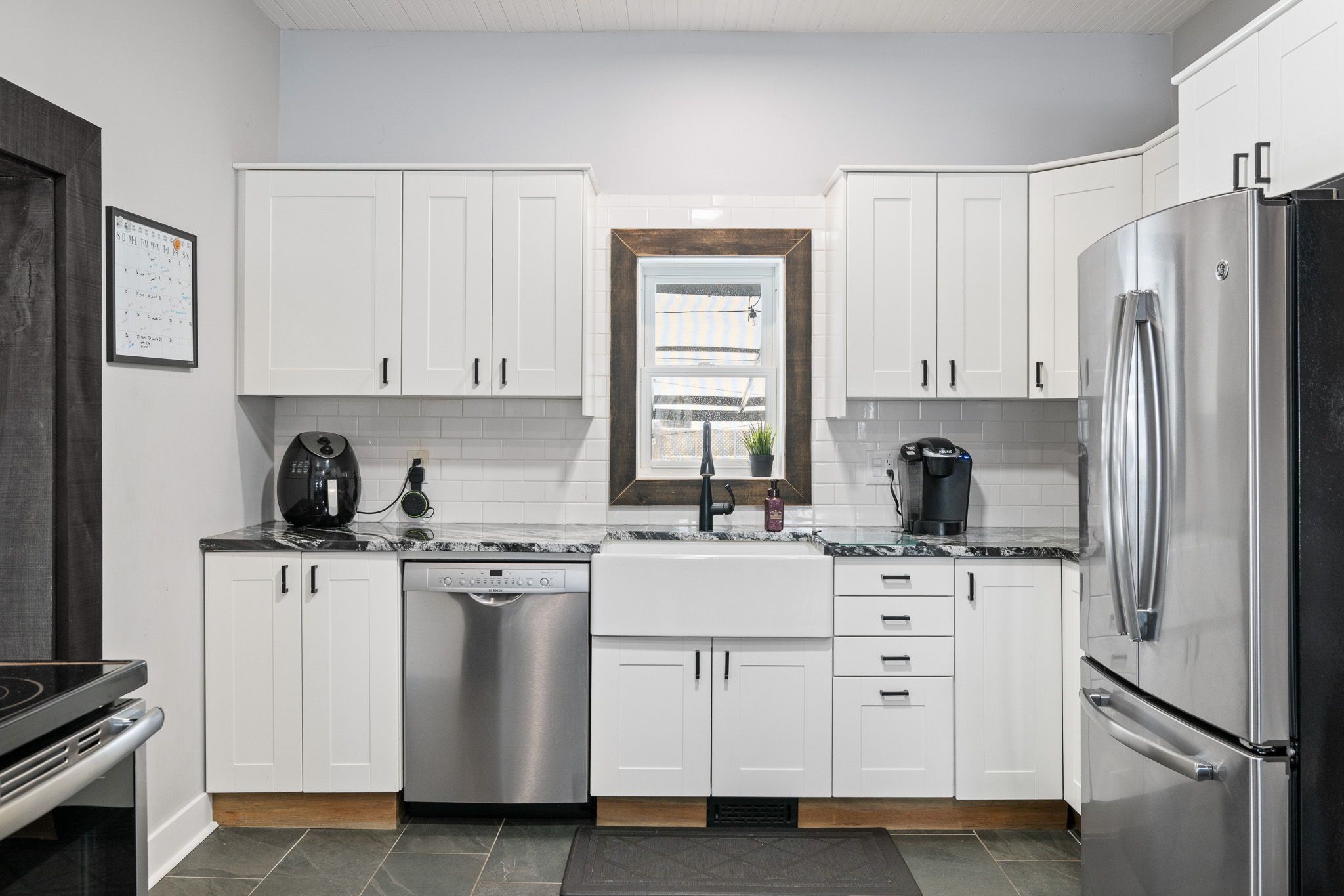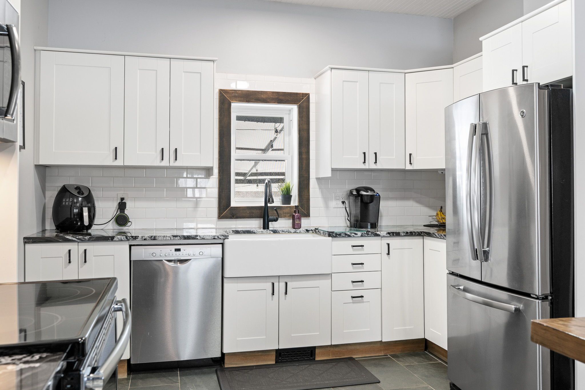 • Stylish kitchen featuring GE appliances, granite countertops, and farmhouse sink.