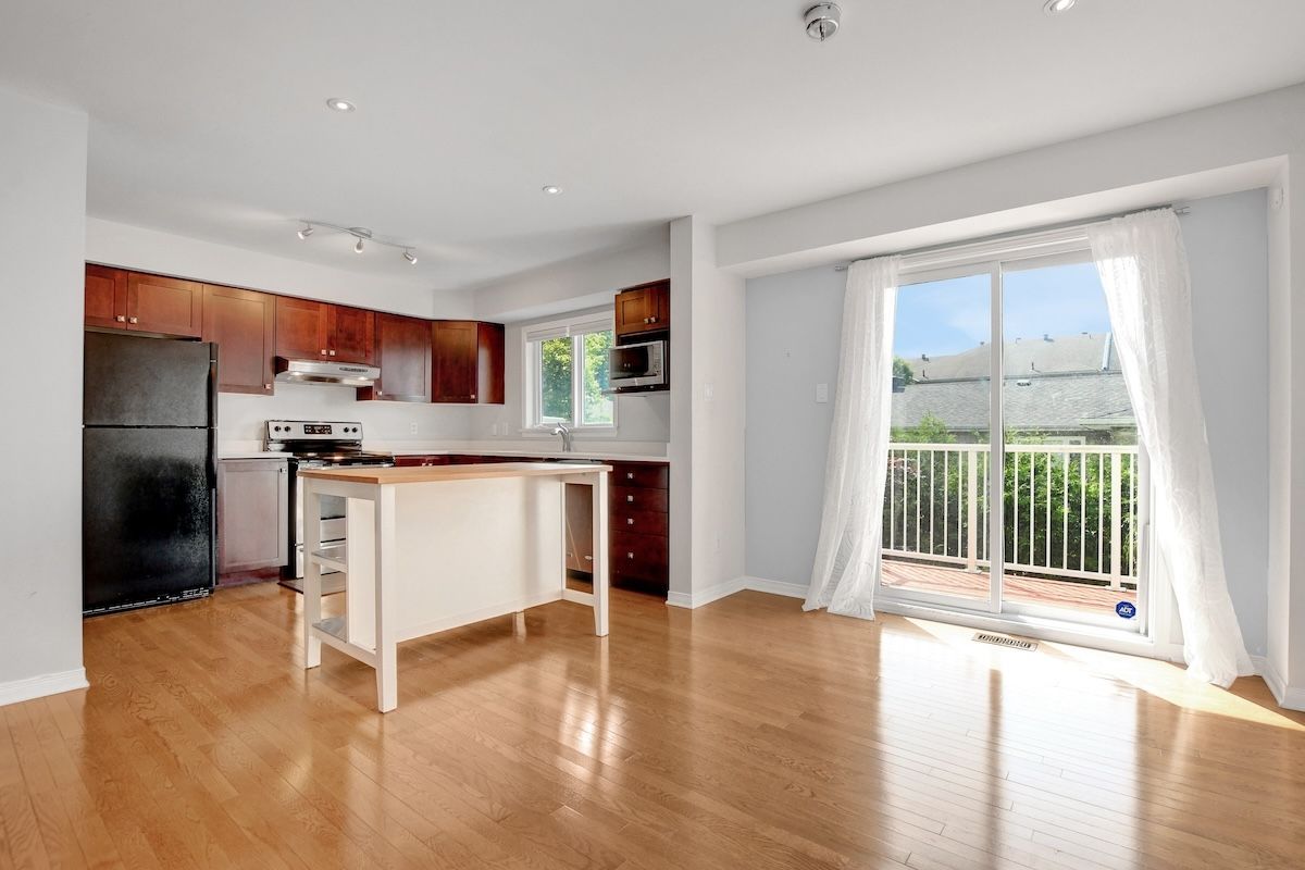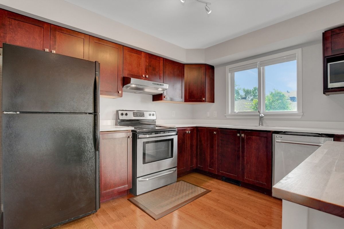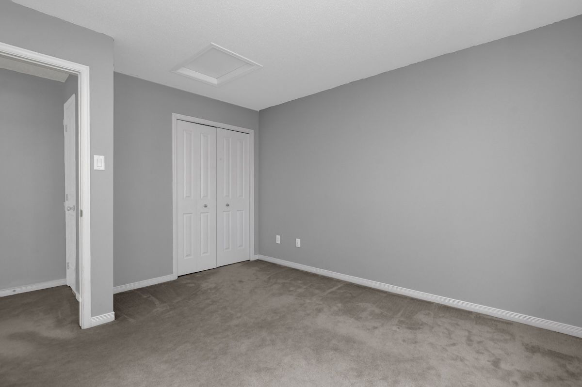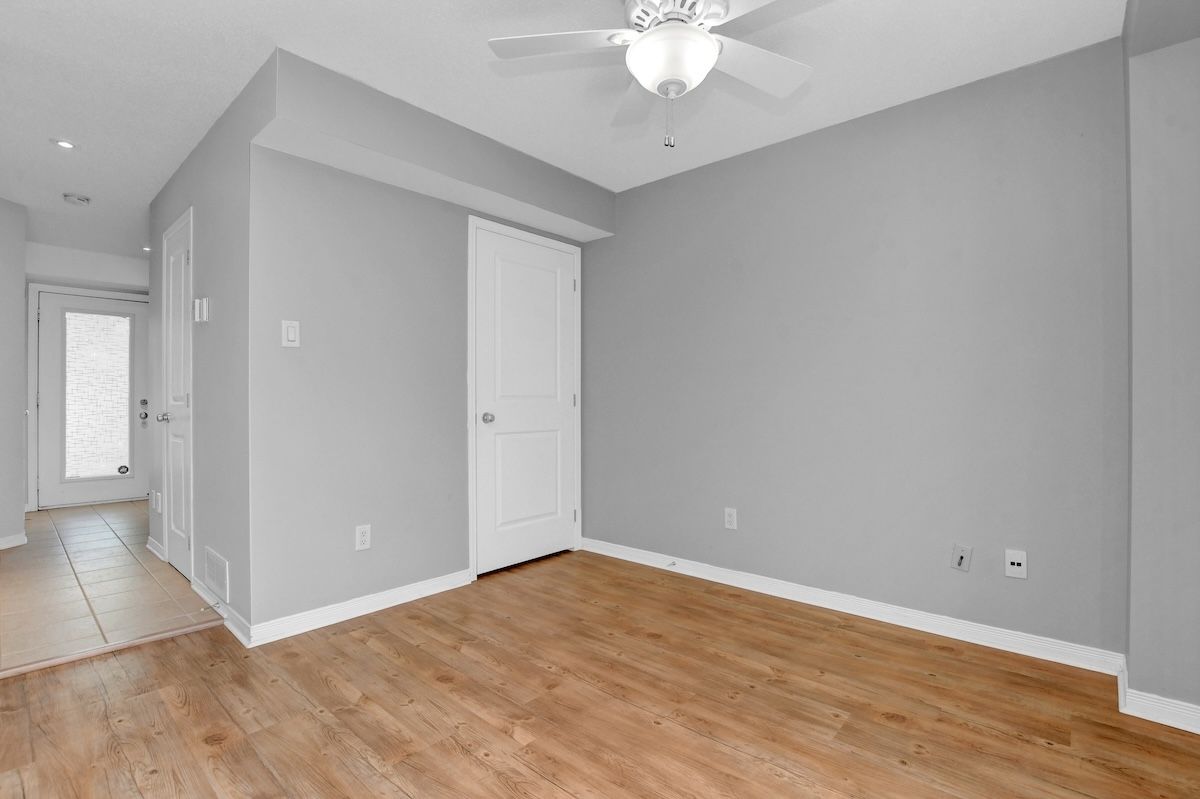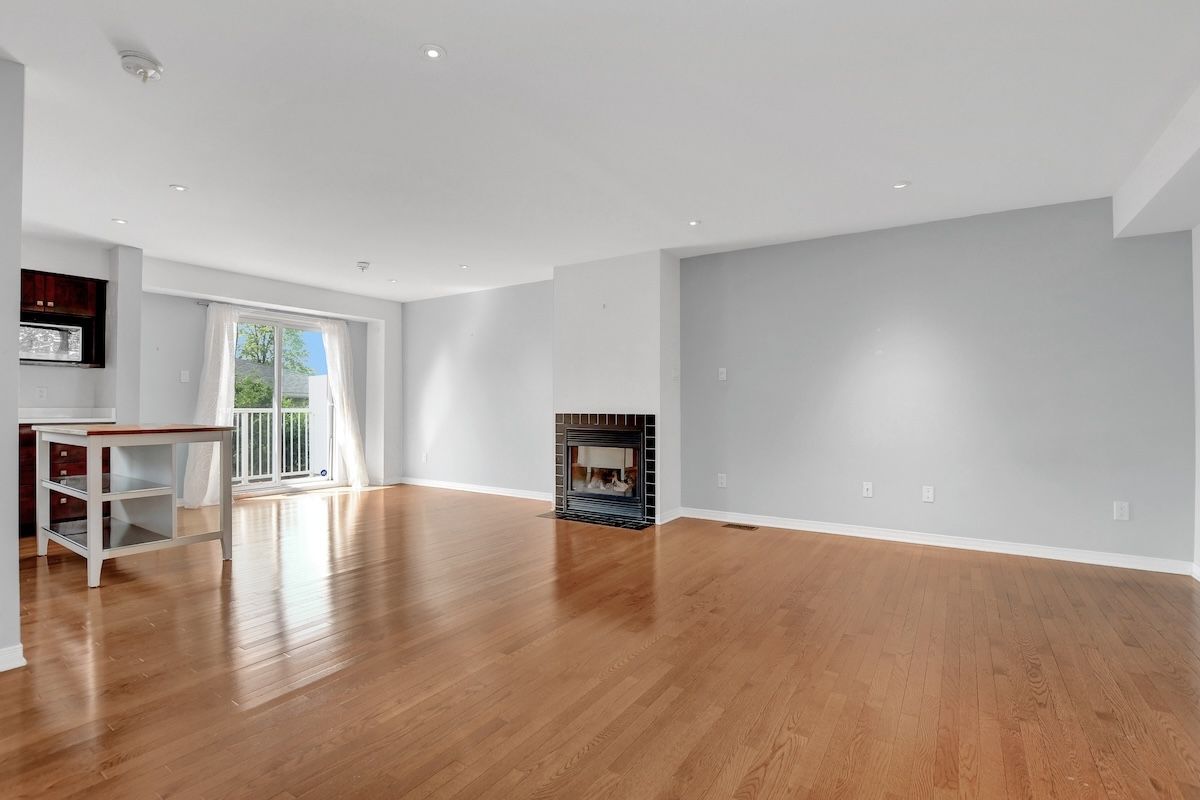 Tucked away in a quiet, private enclave, this domicile-built three-storey executive townhome offers a seamless blend of quality craftsmanship, modern style, and thoughtful design. Natural light fills every level of this bright and welcoming home. The main floor features a versatile space perfect for an office, gym or den along with a convenient powder room and direct access to a private backyard through sliding patio doors. The second level showcases an open-concept living and dining area with elegant hardwood floors, a cozy gas fireplace and access to a charming balcony overlooking the yard. The kitchen is both stylish and functional, complete with quartz countertops. Upstairs, the spacious primary bedroom includes a walk-in closet and an ensuite, while the second bedroom sits adjacent to a large main bathroom with updated ceramic flooring. Additional highlights include oak stairs to the second floor, a large unfinished basement offering ample storage and a private, gated entrance to ken steele park, scenic walking trails and the aviation pathway. With close proximity to the lrt and just minutes from downtown, this beautifully maintained home combines the best of urban convenience with peaceful, park-like surroundings. Quartz countertop in the kitchen, furnace, a/c and owned hot water tank (2019), oak stairs to 2nd floor (2020). Low $900 annual association fee for snow removal and road maintenance. Some photos have been virtually staged.