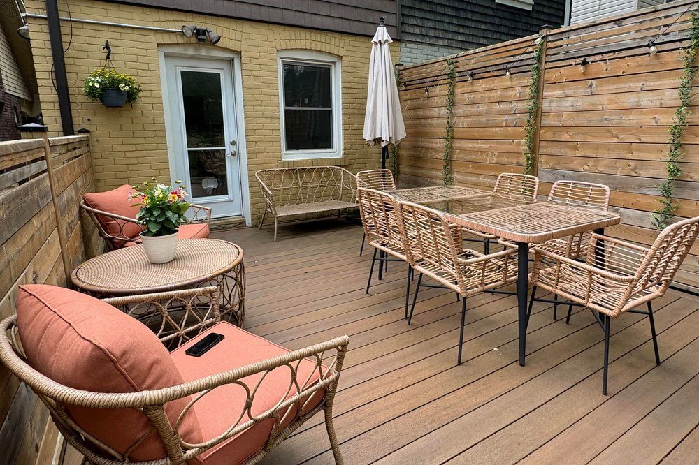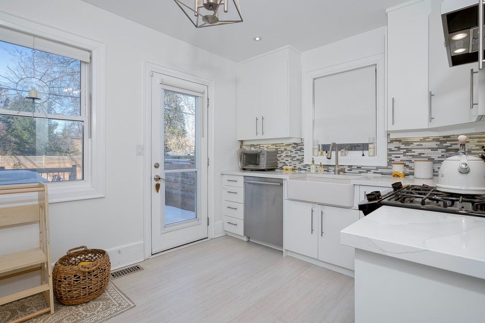 • Modern chef's kitchen with stainless-steel appliances and a walk-out to the backyard.