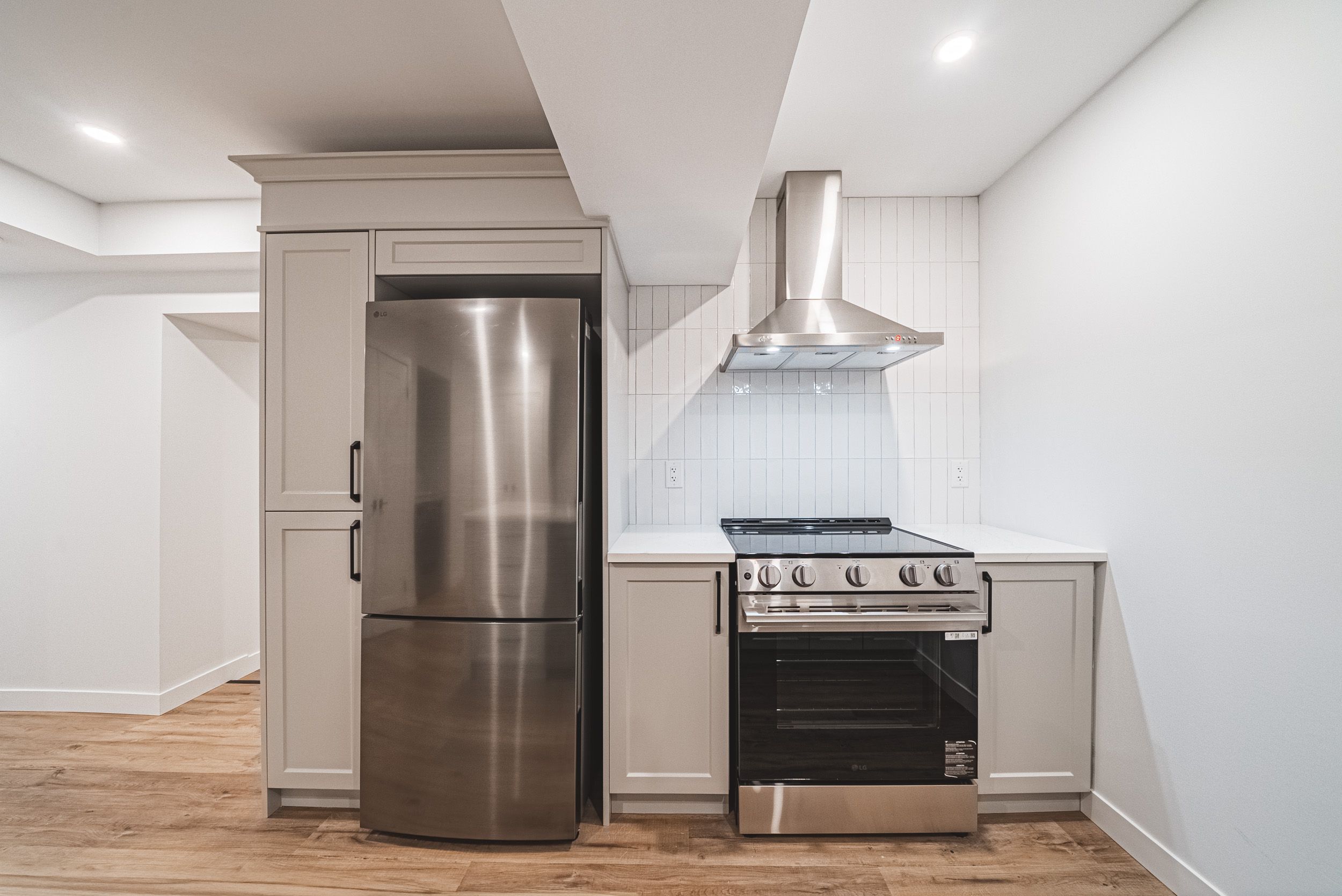 • Modern kitchen featuring stainless steel appliances and quartz countertops.