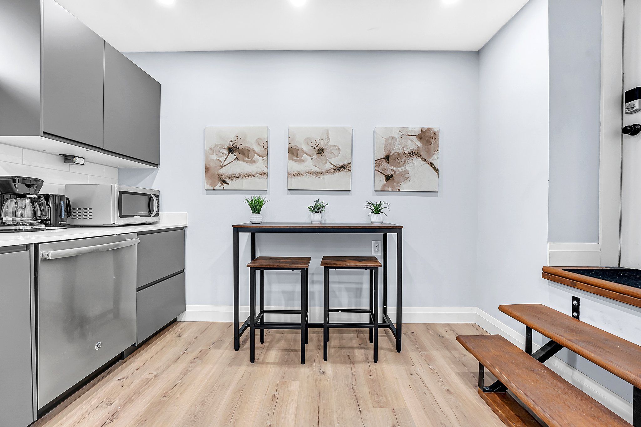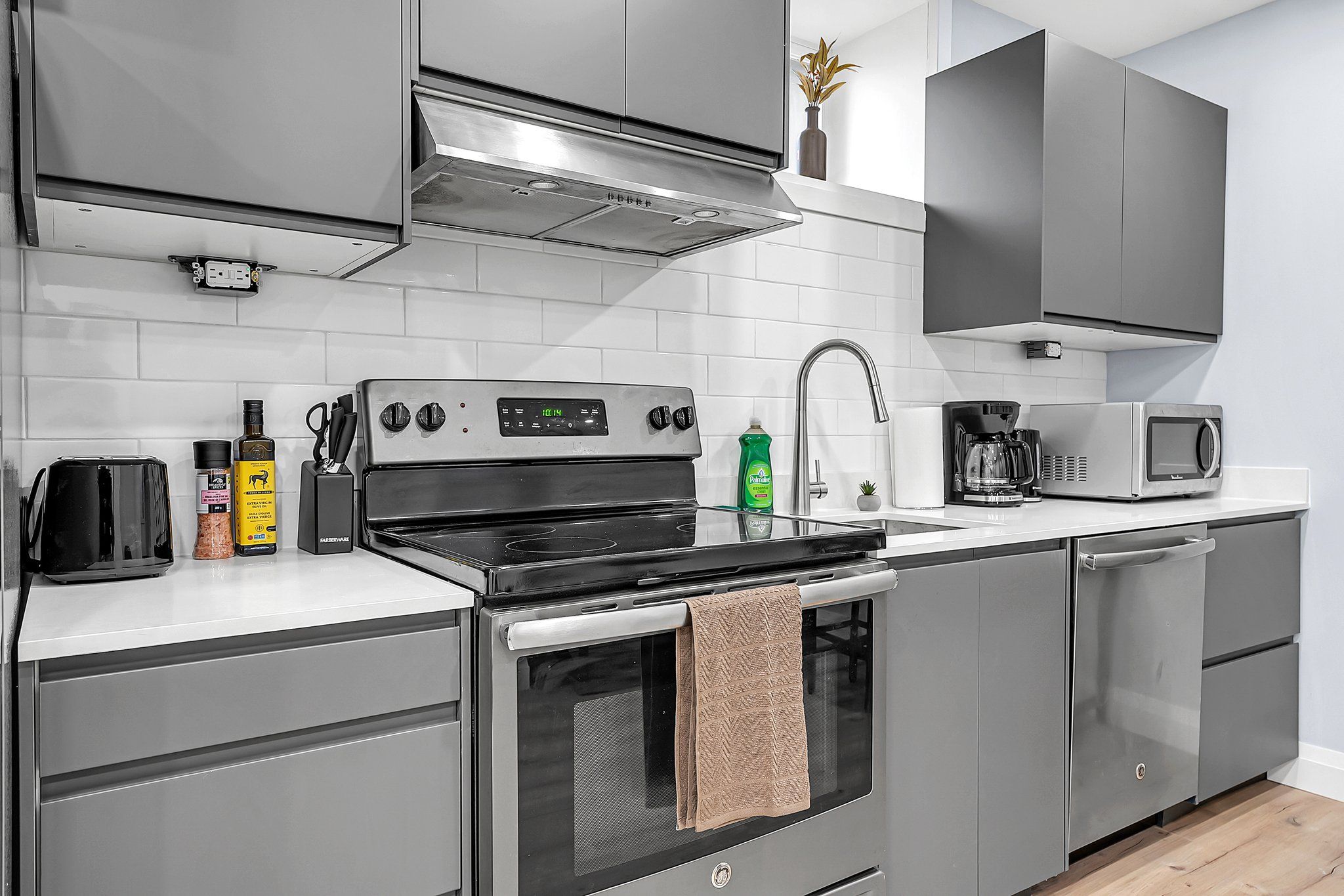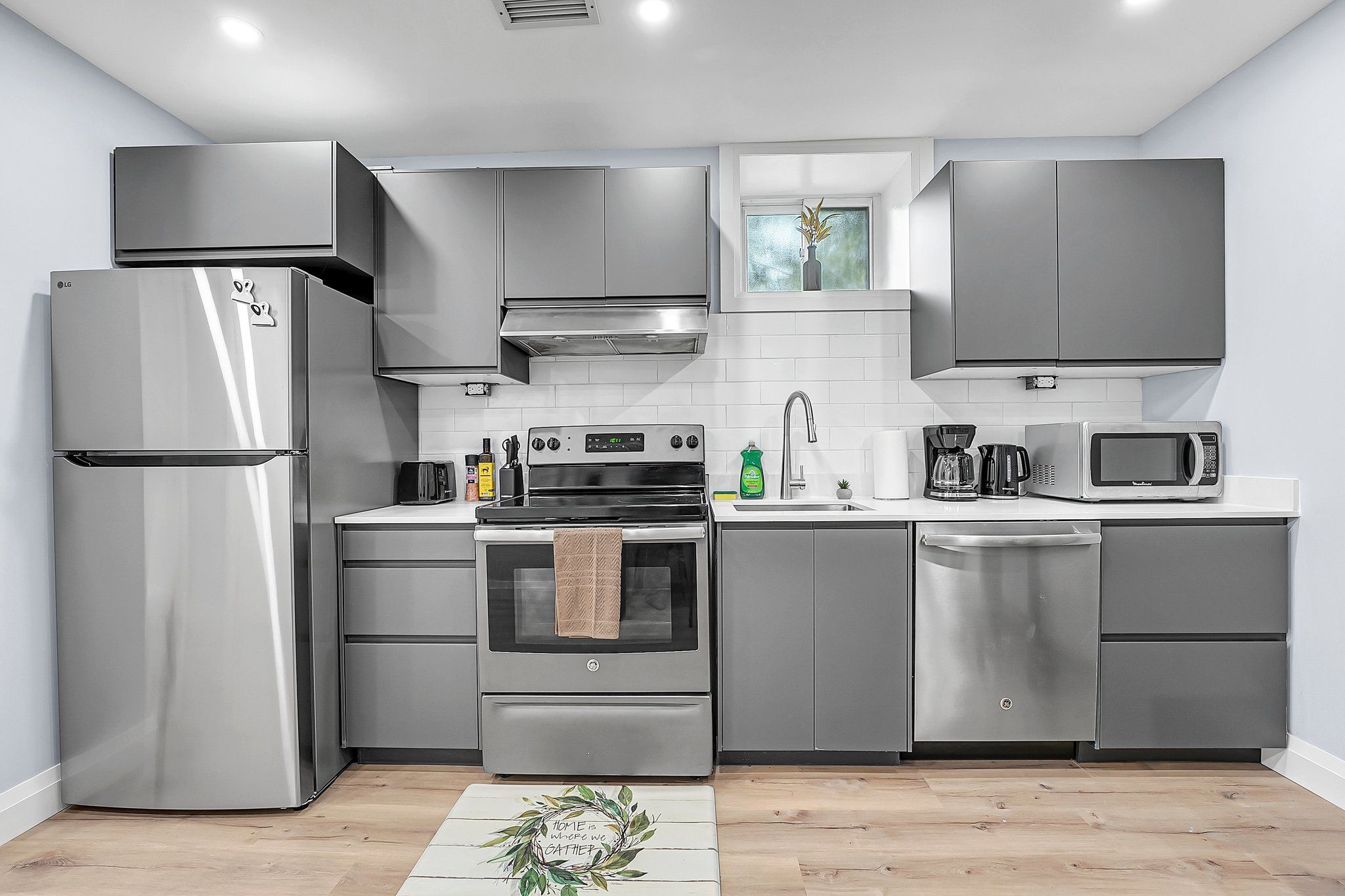 • Modern eat-in kitchen featuring quartz countertops and stainless steel appliances.