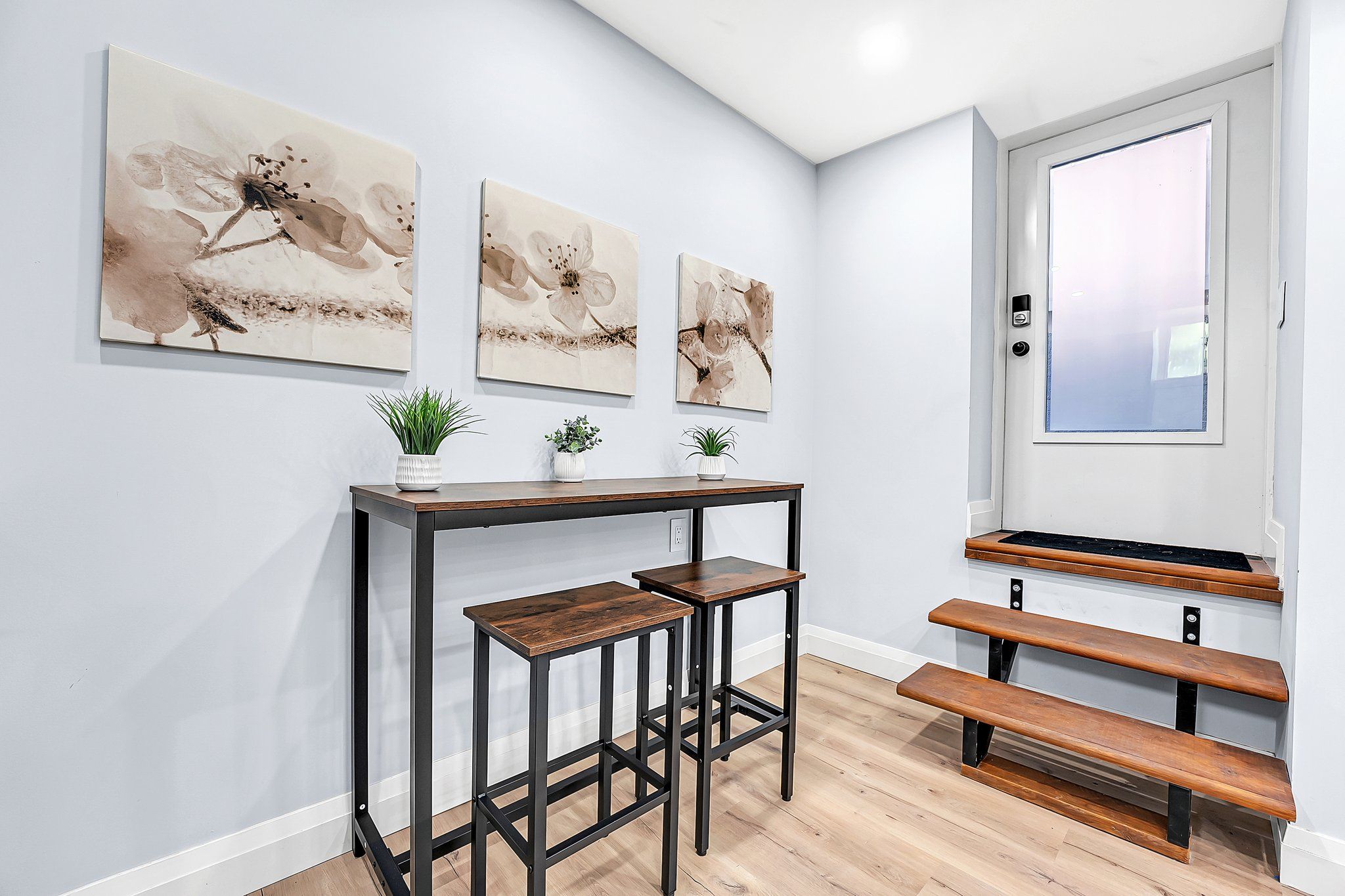 • Bright living space with 8-foot ceilings and laminate flooring.