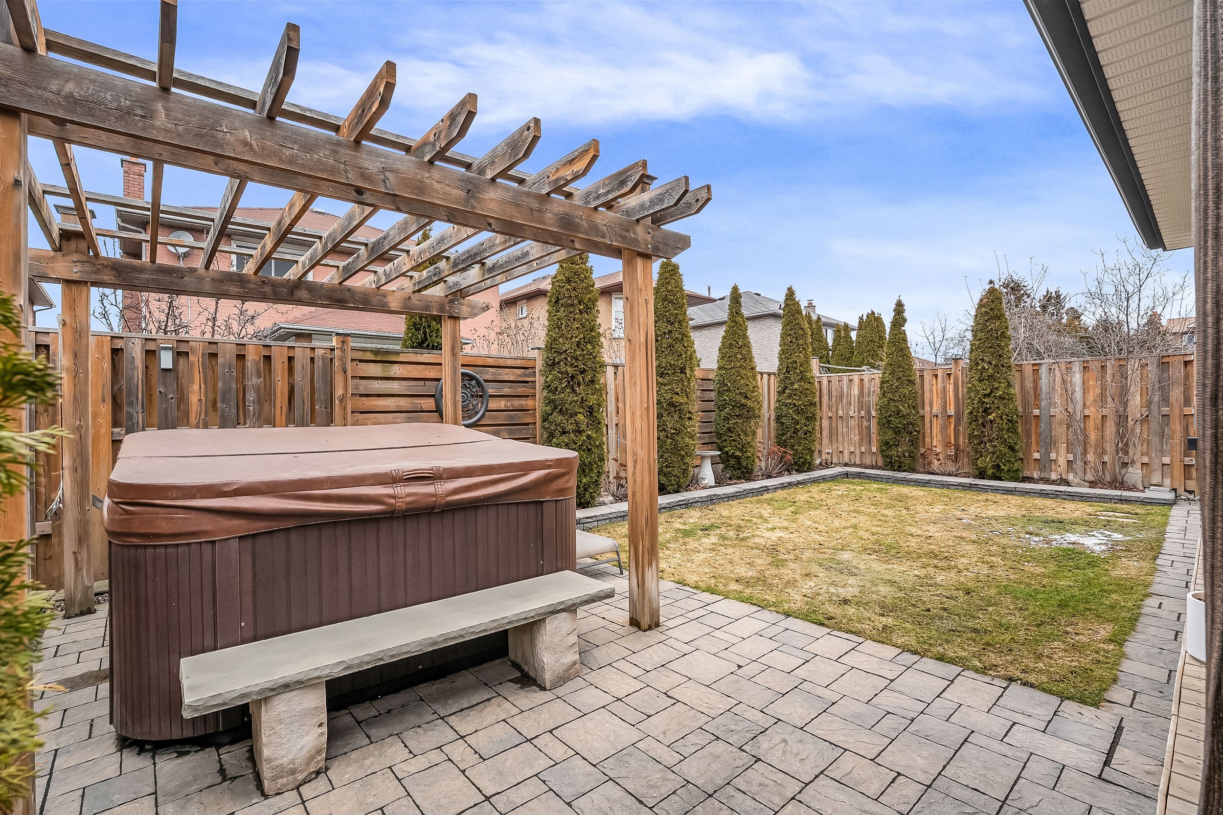 • Backyard equipped with fire pit, hot tub, and covered deck for relaxation.