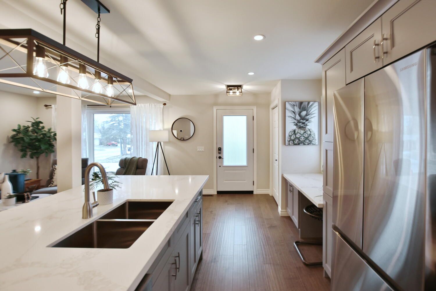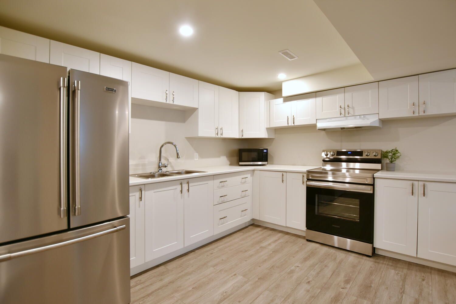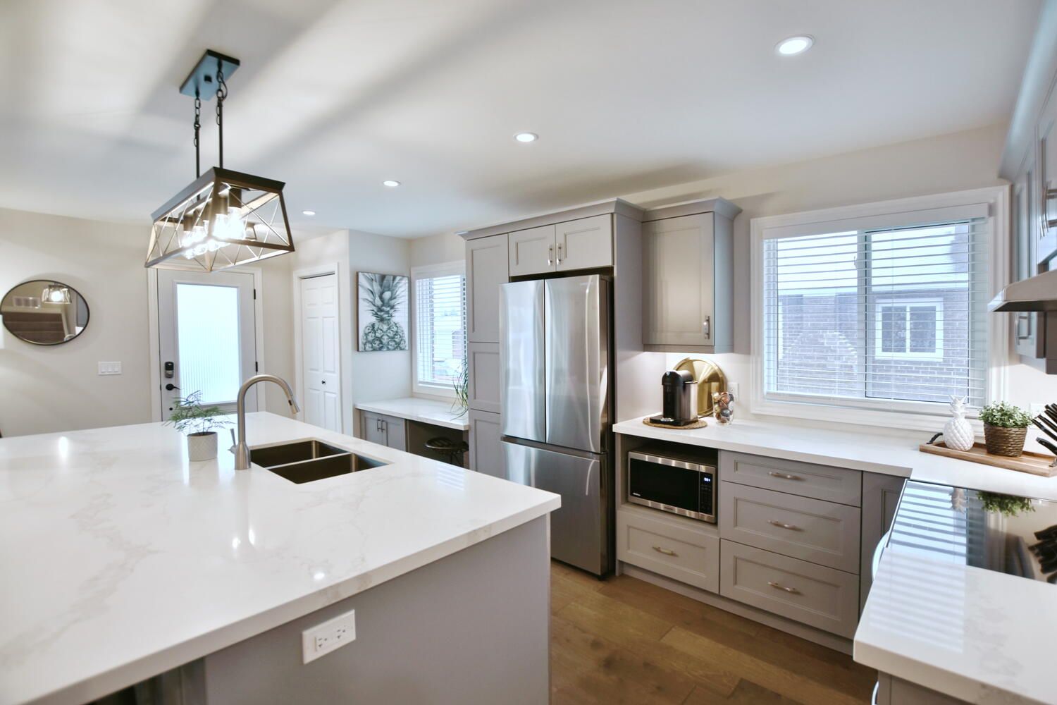 • Upscale kitchen with quartz countertops and stainless steel appliances.