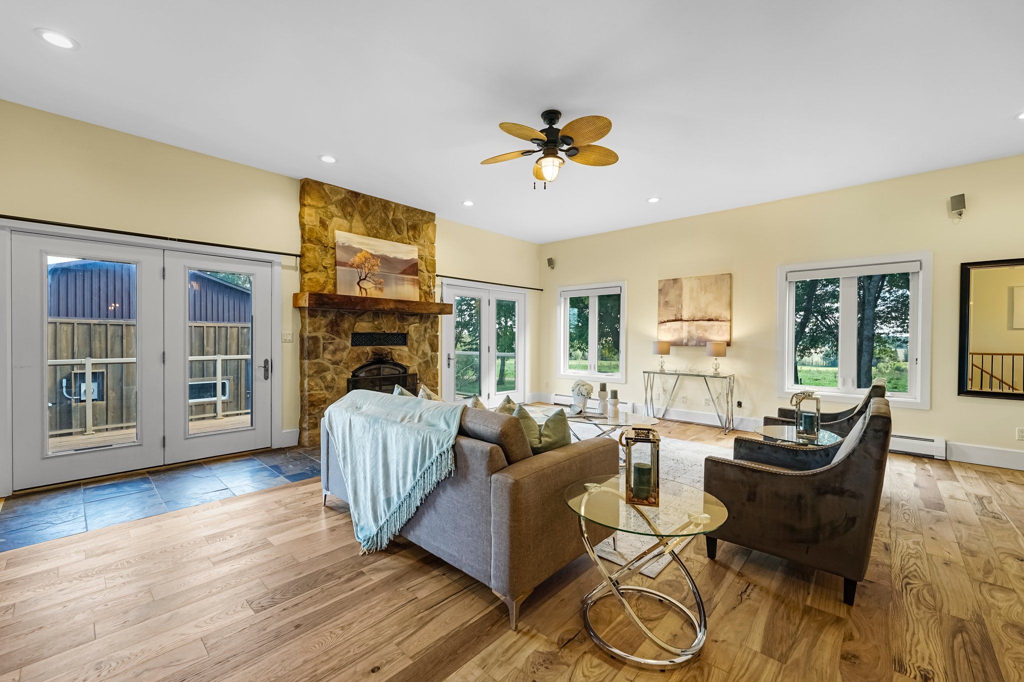 76. 50 acre farm w/ modern upgraded 5 bed & 3 bath brick bungalow. 50 workable acres. 40'x60' insulated det. Garage, 60'x42' bank barn 60'x40 pole barn both w/water & hydro 20'x30' outside chicken coup, 2 run in shelters. Bright home w/ enclosed porch / sunroom, open concept great room w/ 10ft ceiling. Large eat in kitchen, dining & living rm w/ floor to ceiling stone fireplace & w/o to deck. Huge finished lower level w/ sep. Entrance & in floor heating. Private location w/ open fields & scenic country views. Just 5 mins drive to shelburne with shopping, schools & amenities. Close to many provincial parks, golfing, skiing & hiking, biking & snowmobile trails. Must see home & property!