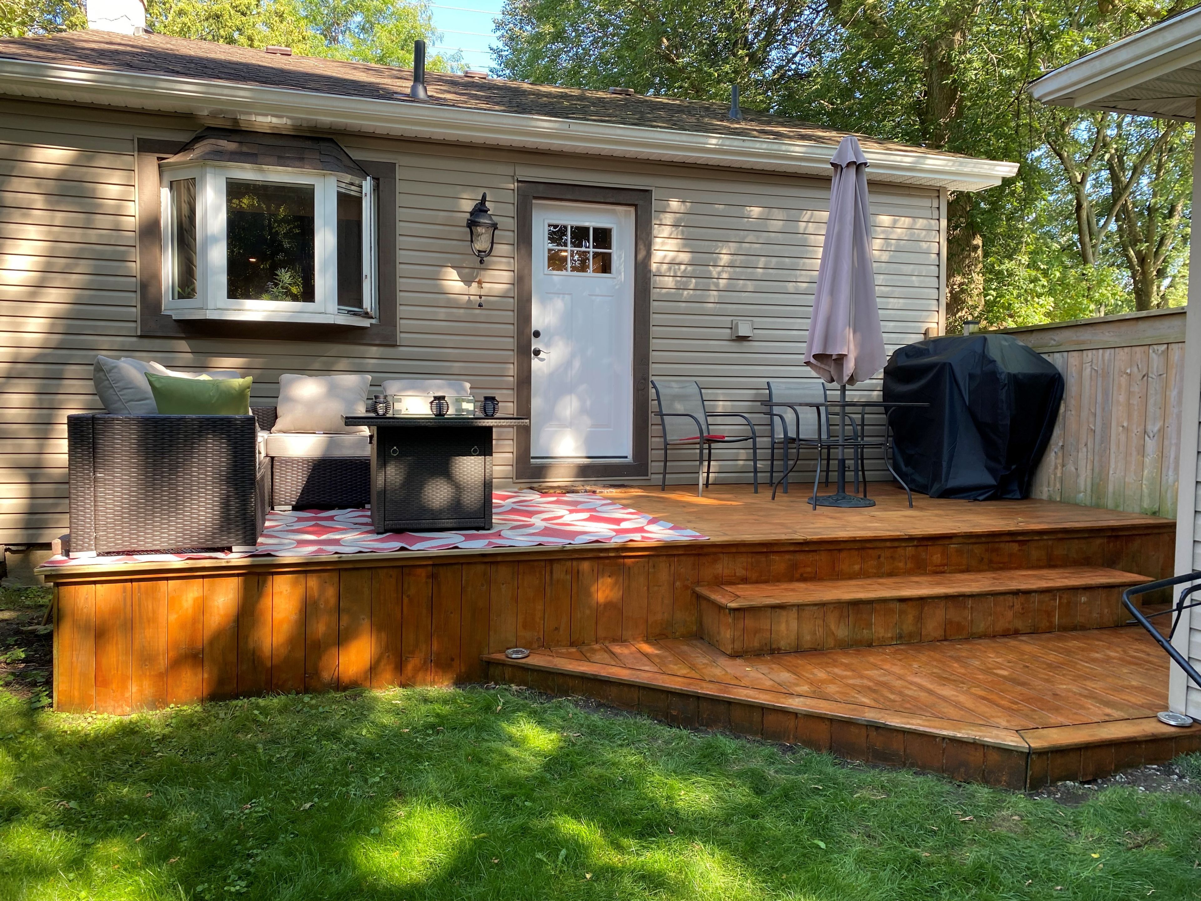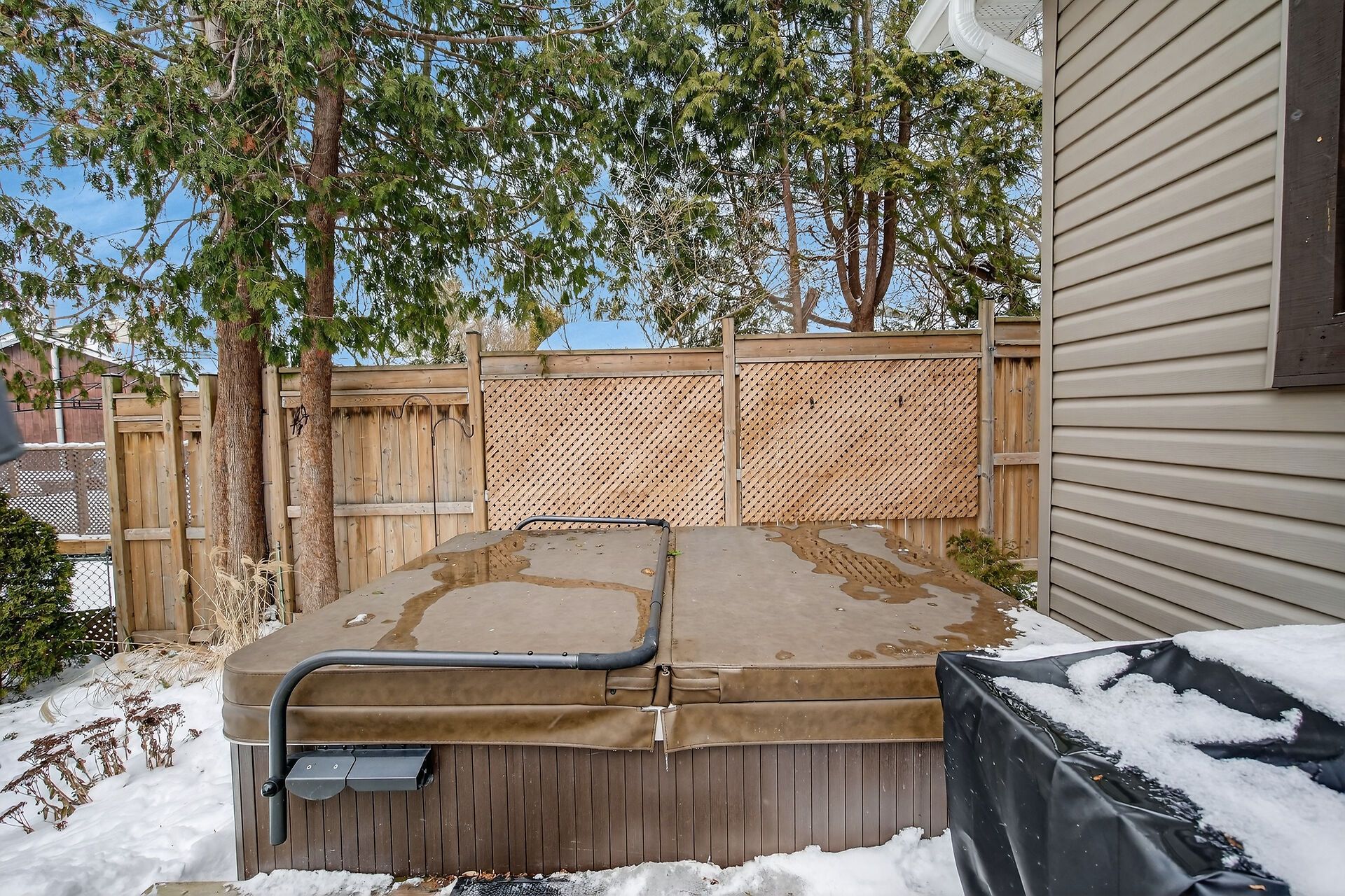 • Fully fenced backyard with mature trees, spacious deck, and hot tub for relaxation.