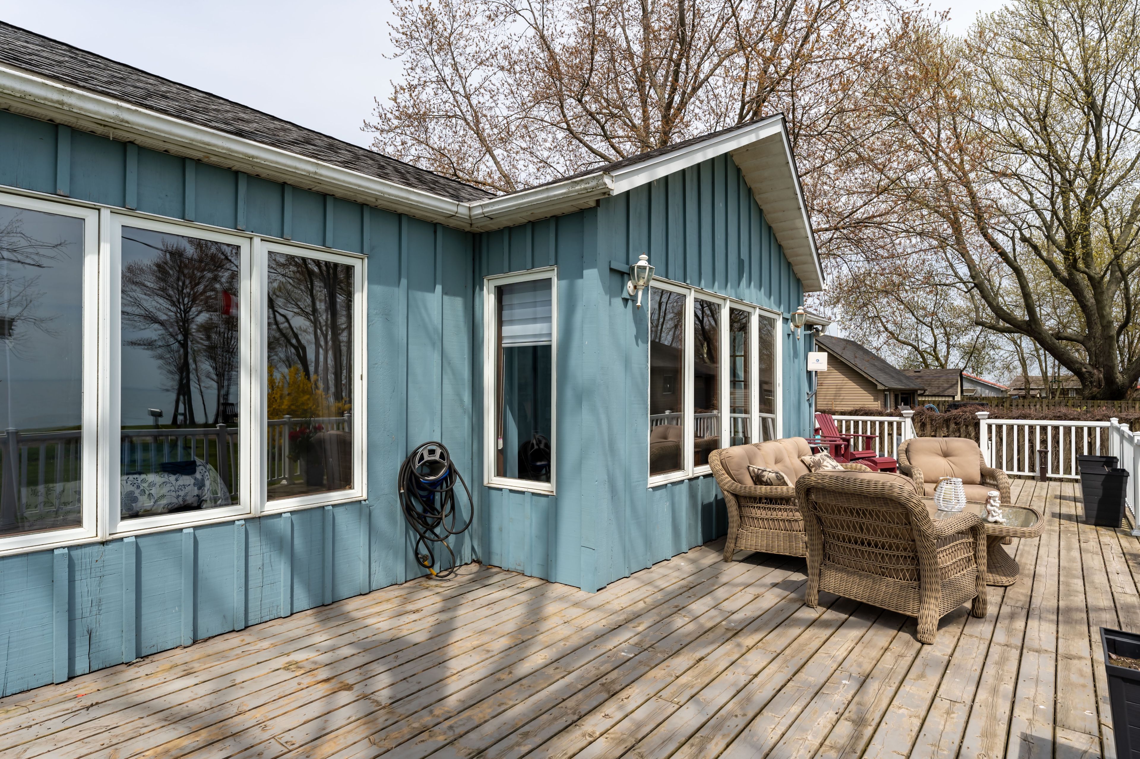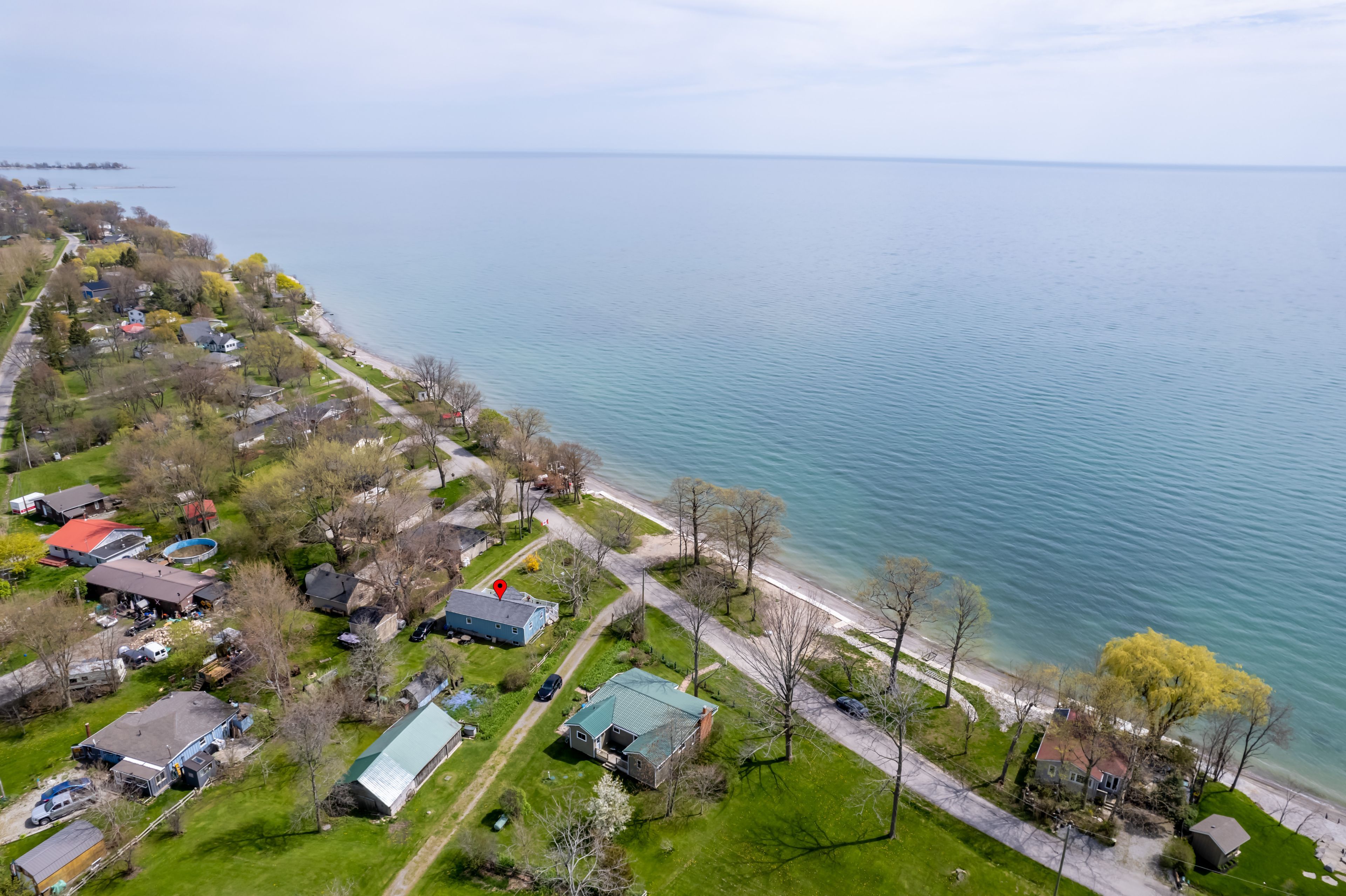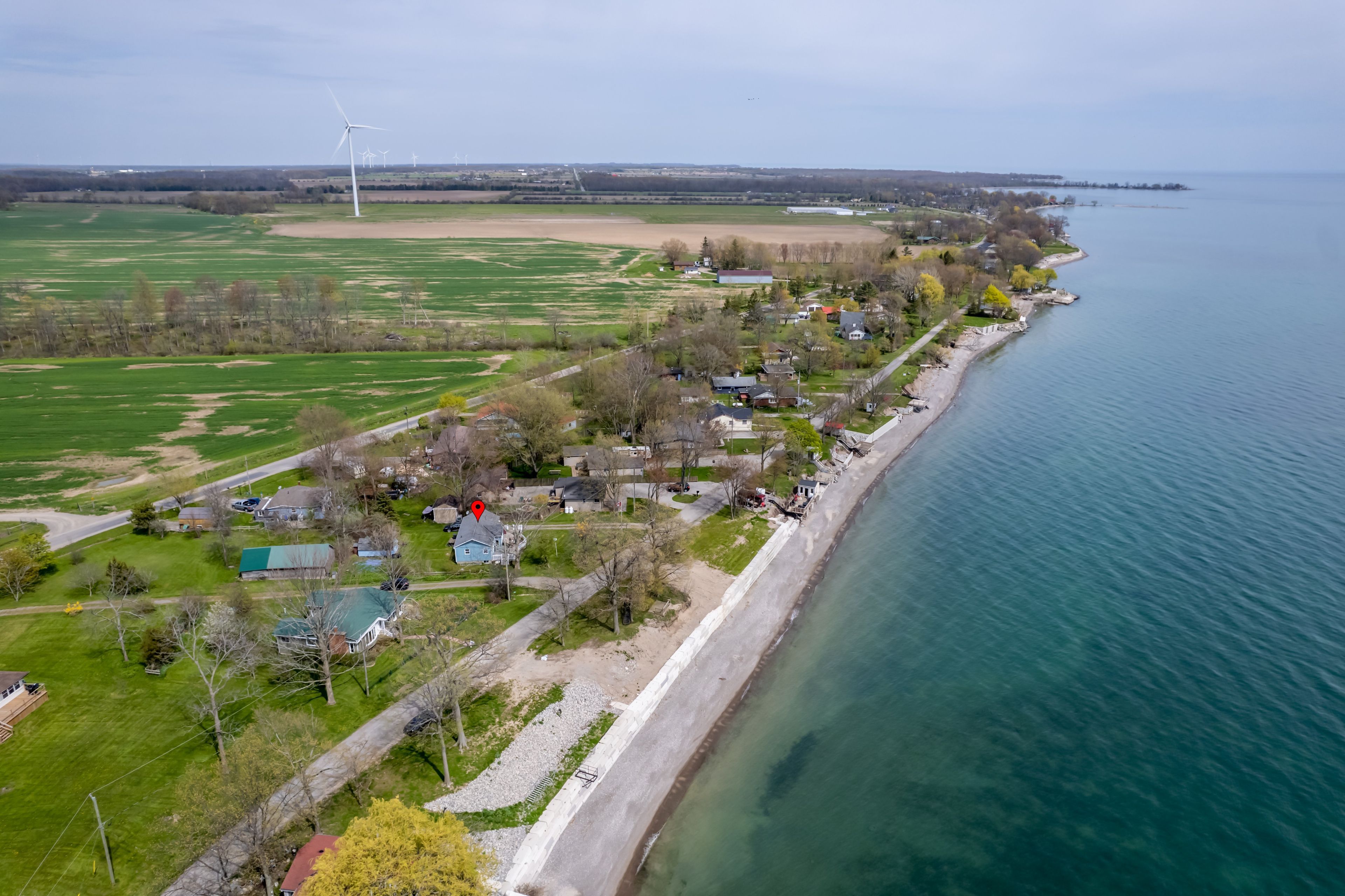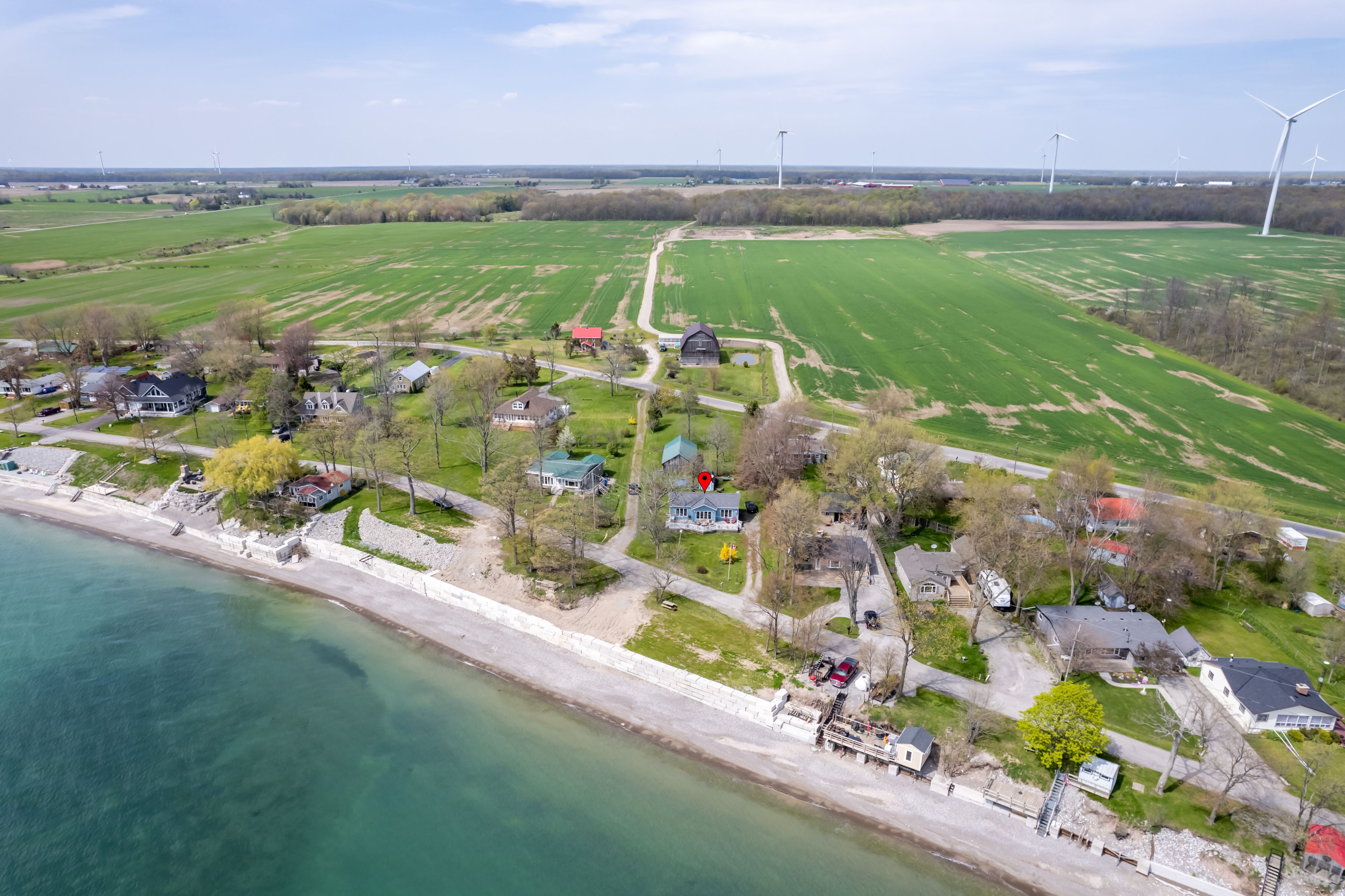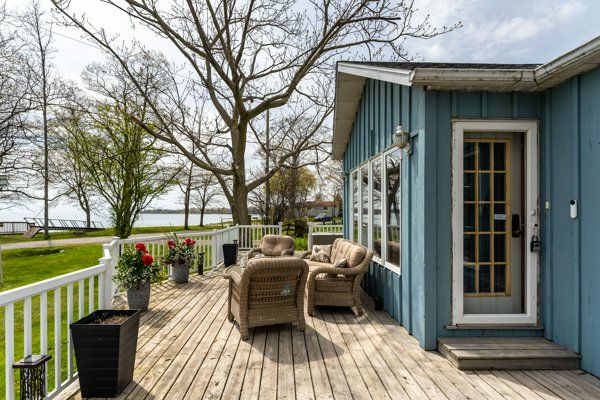 Waterfront retreat on a quiet road owning the north and south (waterside) of the road. This year-round 2-bedroom home offers the perfect blend of relaxation and recreation, featuring just over 70 feet of lake erie water frontage and 2022 wilkinson built break wall, plus a natural sand and pebble beach for endless summer enjoyment. Step inside to a bright, open-concept living/dining/kitchen space highlighted by vaulted, beamed ceilings and a wall of windows showcasing lake views and awesome sunsets. The inviting layout is ideal for both everyday living and entertaining. The home includes a basement (1992) providing ample storage space and development potential, while the expansive deck is perfect for morning coffee or hosting family and friends against a beautiful waterfront backdrop. Plenty of driveway parking accommodates all your vehicles and recreational toys. Additional updates include roof shingles and the added peace of mind of a backup generator. A rare opportunity to own a lakeside escape-perfect as a year-round residence or weekend getaway!
