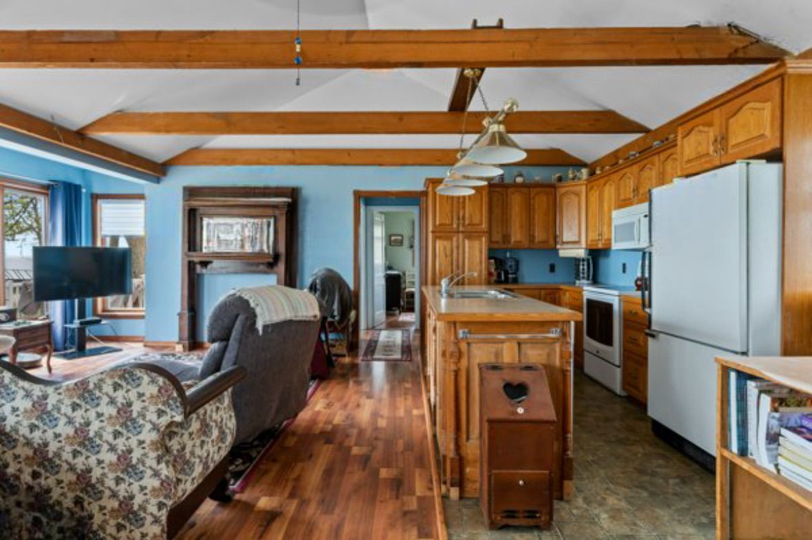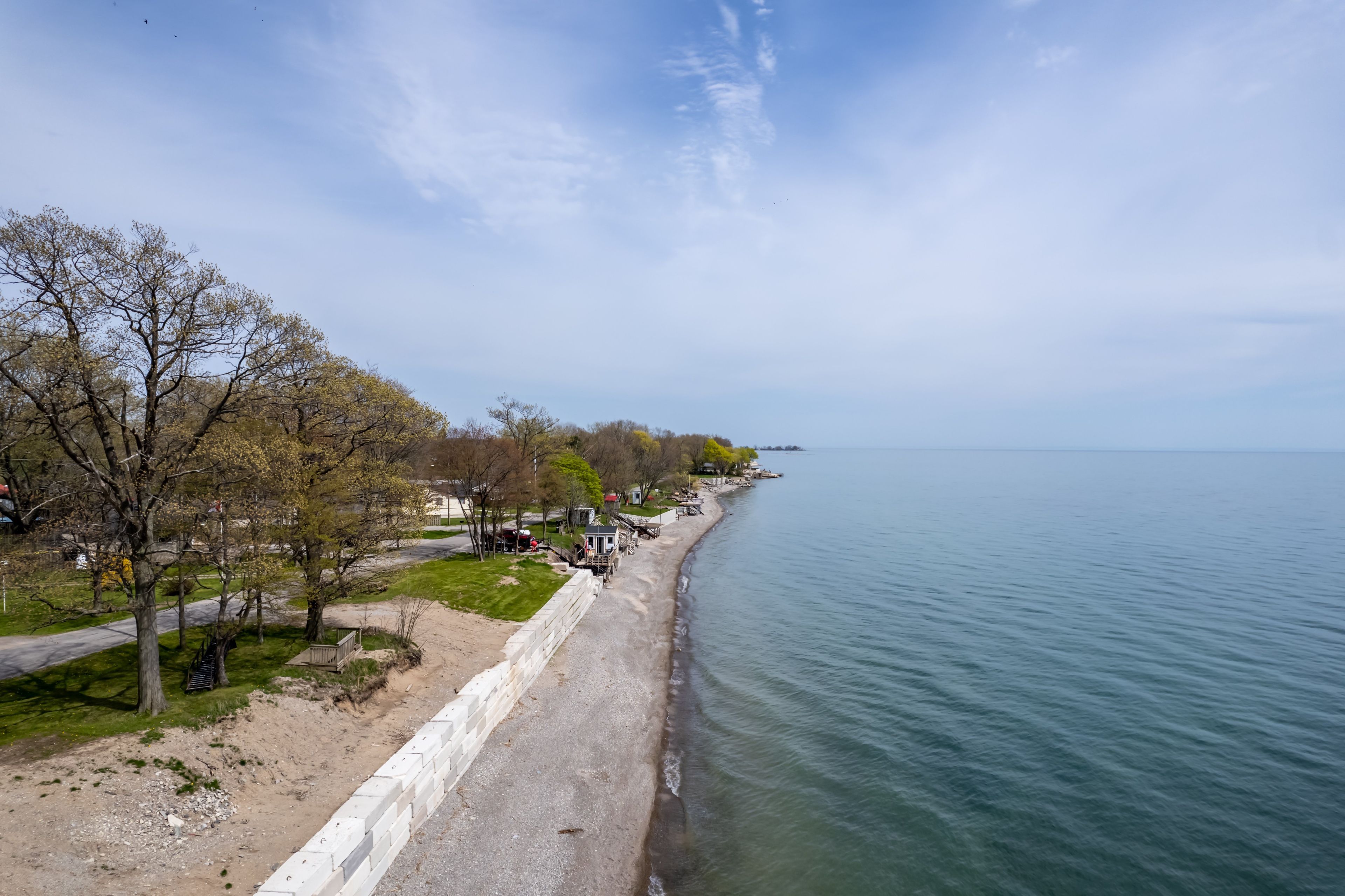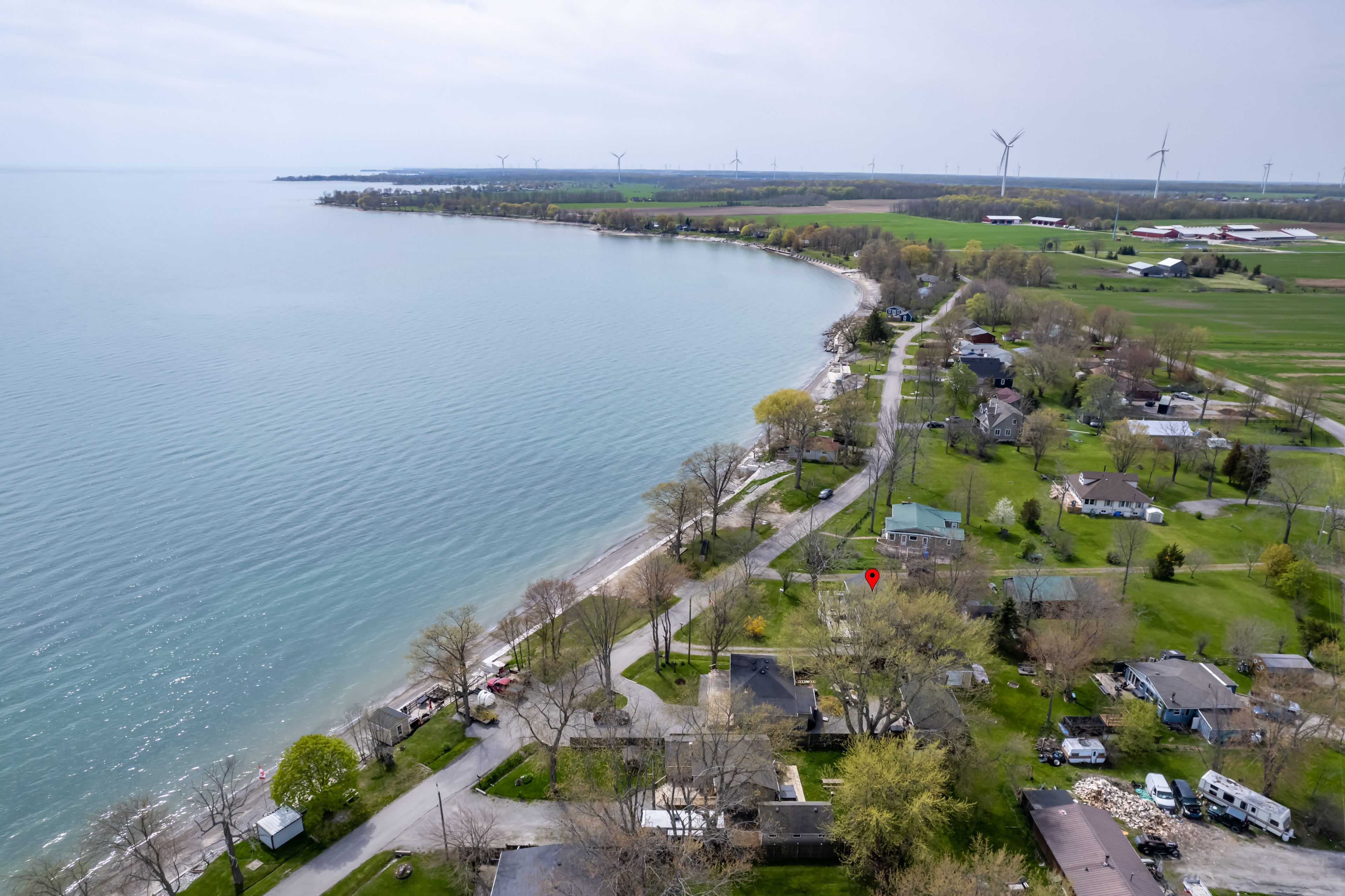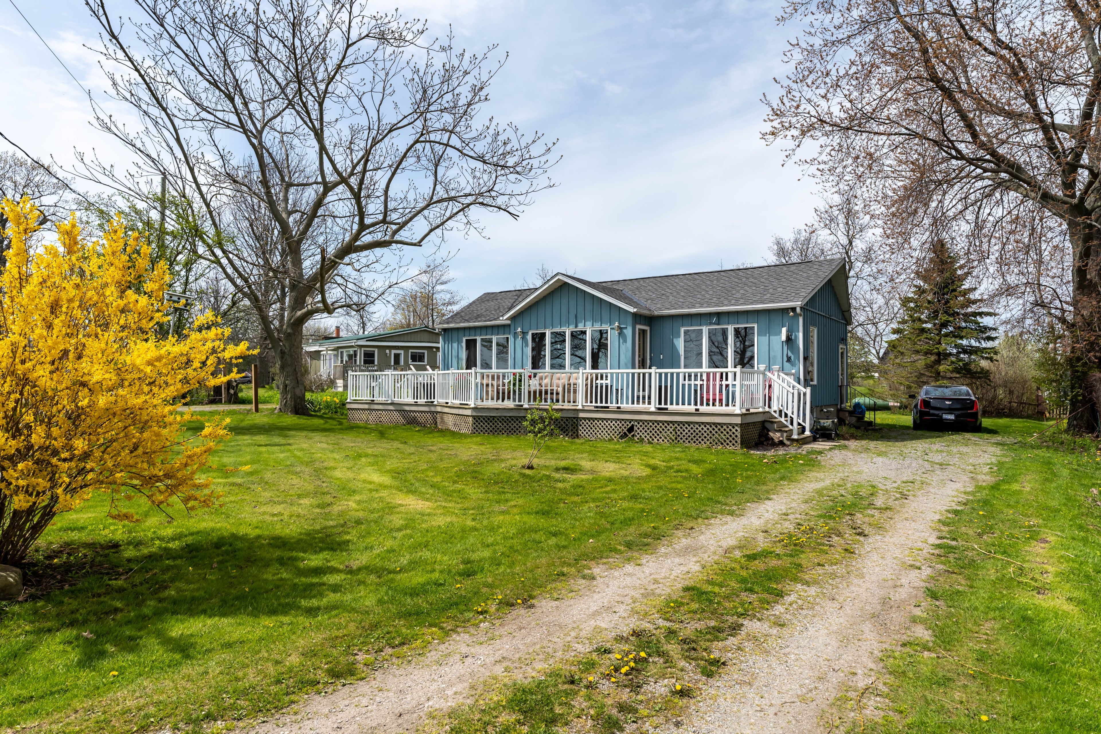 Waterfront retreat on a quiet road owning the north and south (waterside) of the road. This year-round 2-bedroom home offers the perfect blend of relaxation and recreation, featuring just over 70 feet of lake erie water frontage and 2022 wilkinson built break wall, plus a natural sand and pebble beach for endless summer enjoyment. Step inside to a bright, open-concept living/dining/kitchen space highlighted by vaulted, beamed ceilings and a wall of windows showcasing lake views and awesome sunsets. The inviting layout is ideal for both everyday living and entertaining. The home includes a basement (1992) providing ample storage space and development potential, while the expansive deck is perfect for morning coffee or hosting family and friends against a beautiful waterfront backdrop. Plenty of driveway parking accommodates all your vehicles and recreational toys. Additional updates include roof shingles and the added peace of mind of a backup generator. A rare opportunity to own a lakeside escape-perfect as a year-round residence or weekend getaway!
