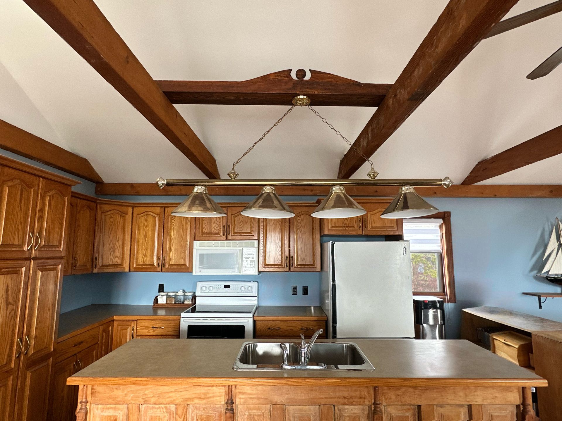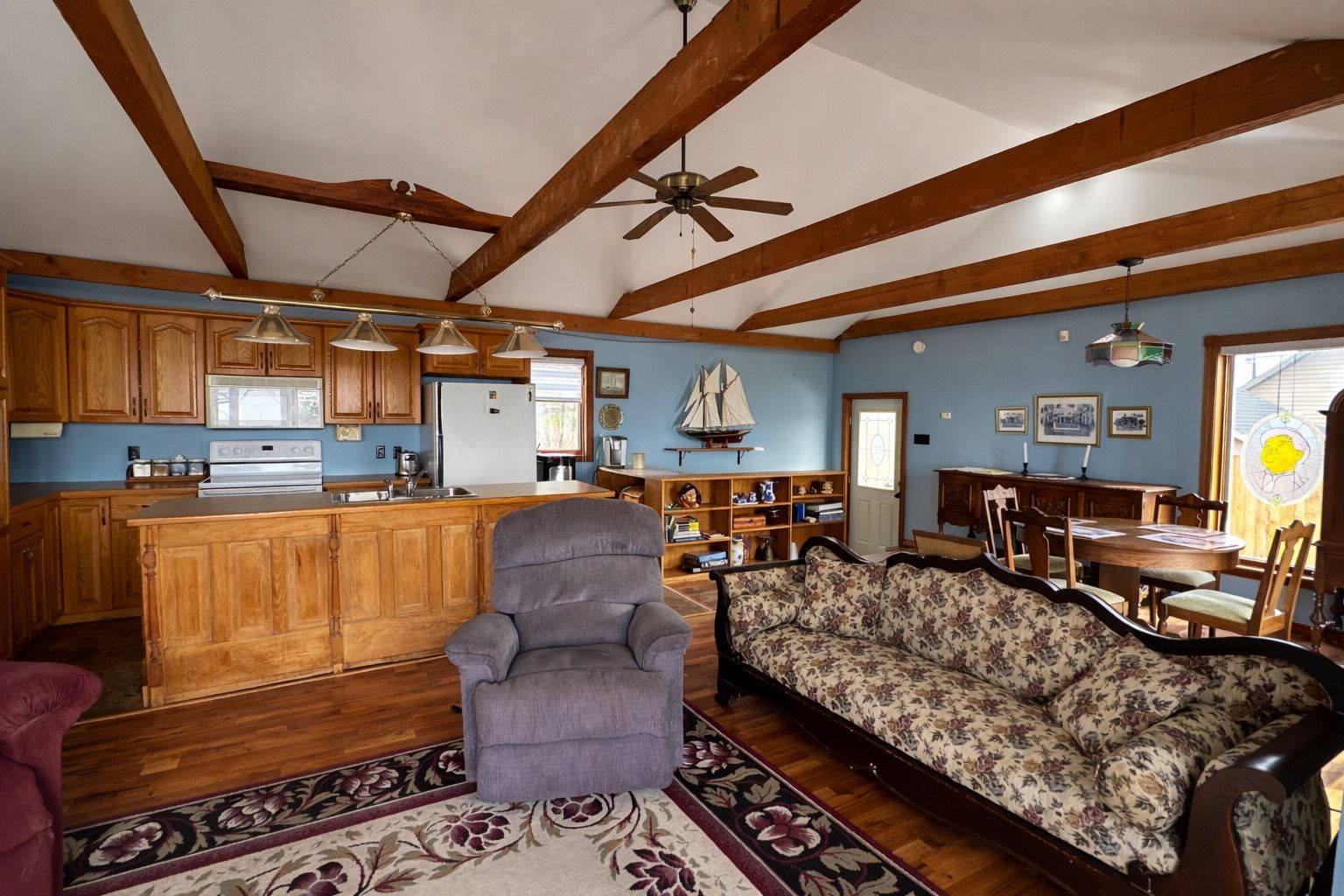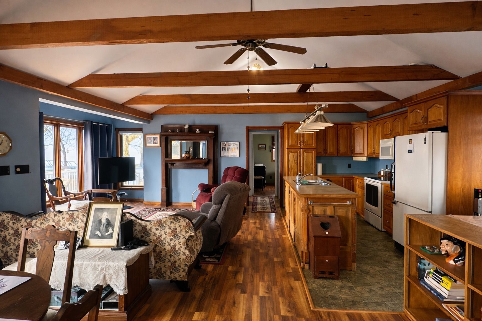 • Open-concept living space with vaulted ceilings and stunning lake views.
