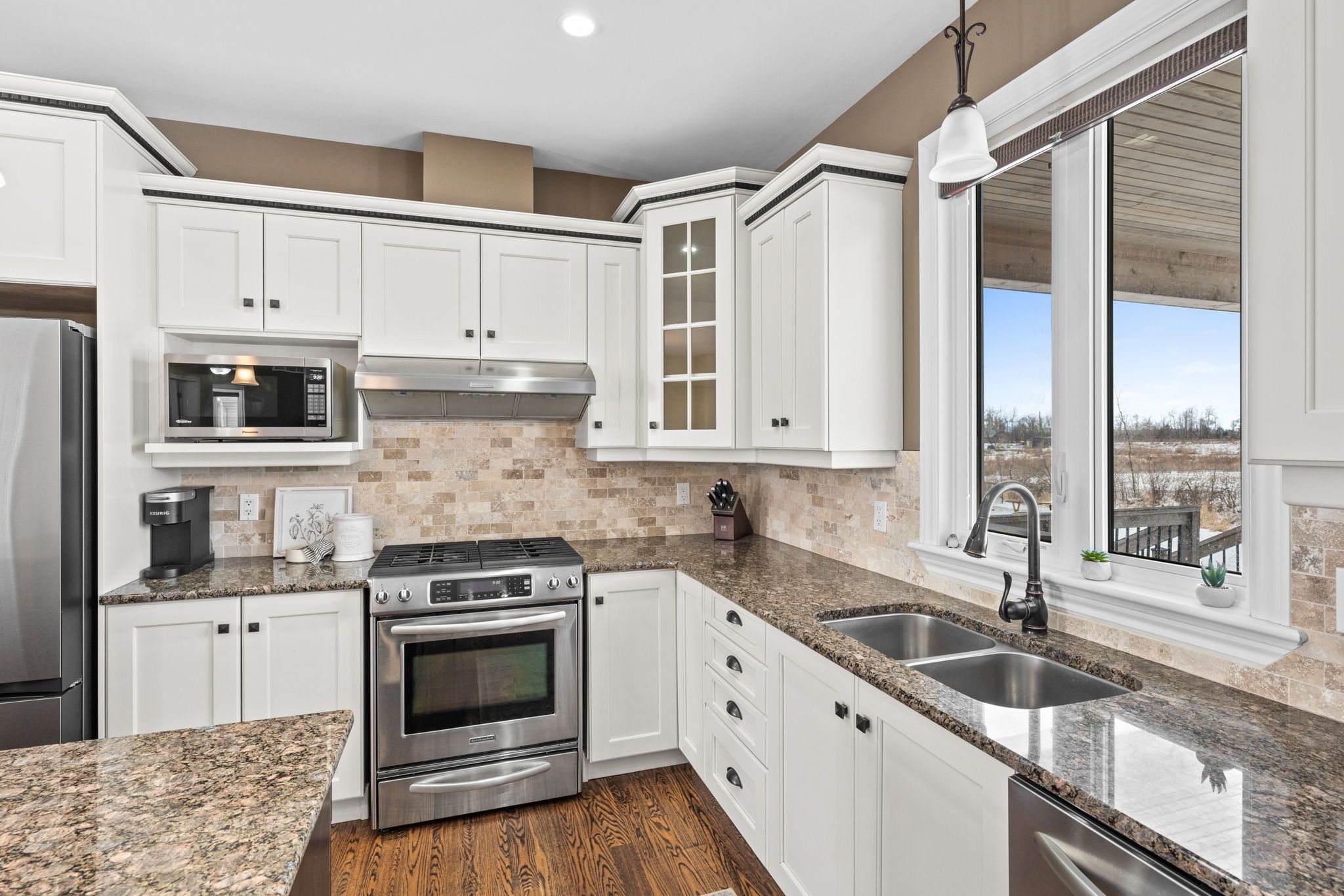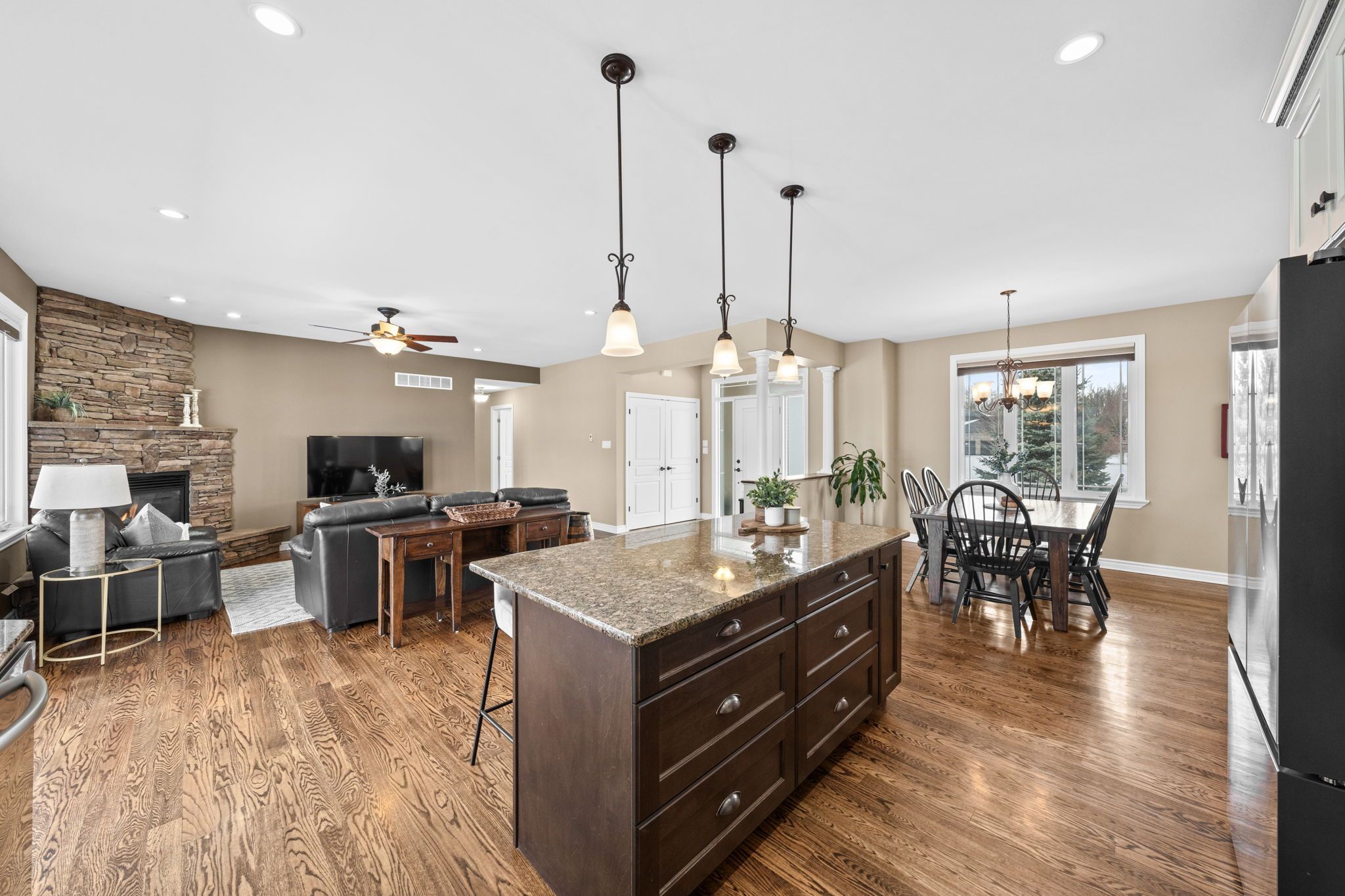 • Open-concept living area with high ceilings, hardwood floors, and granite countertops.