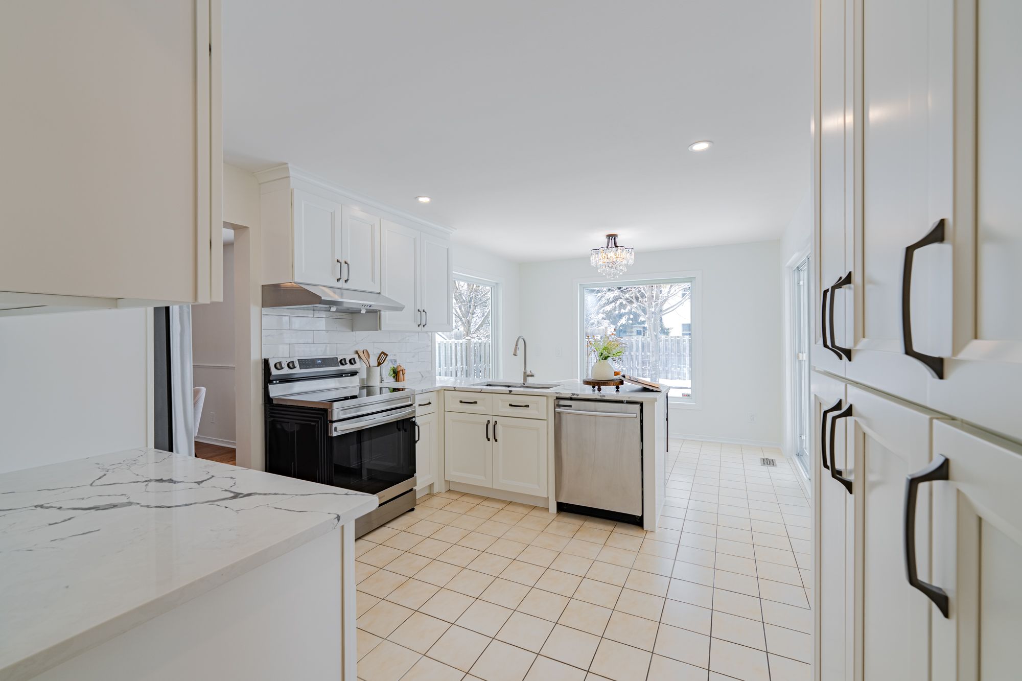 • Bright, renovated kitchen featuring solid wood cabinetry and new appliances.