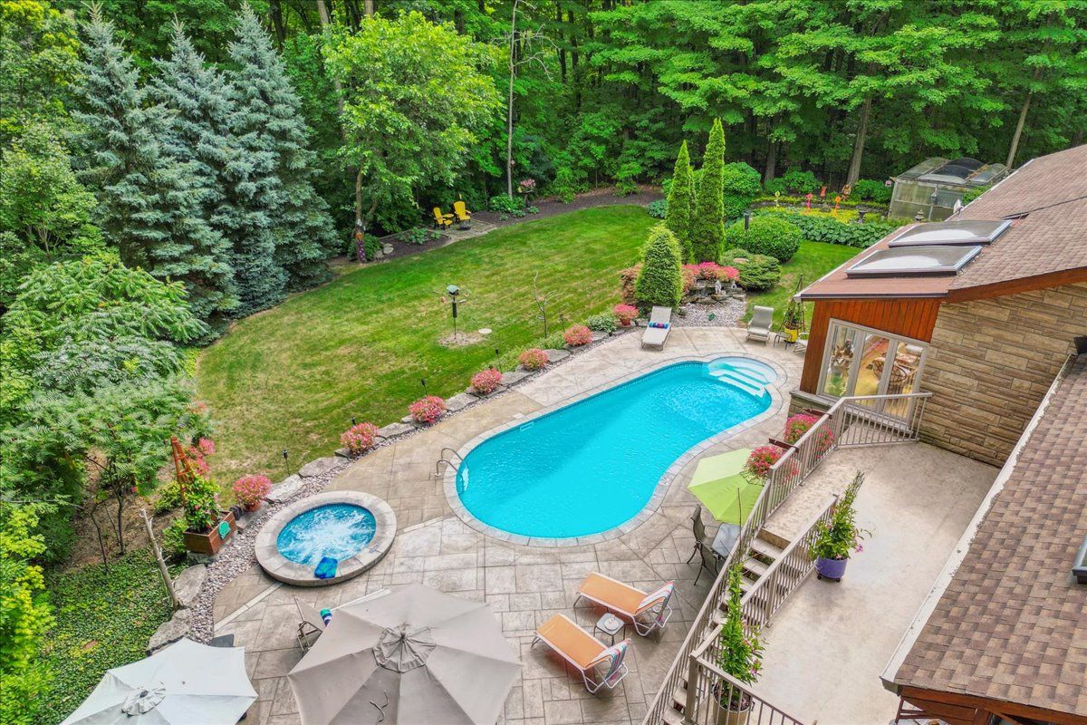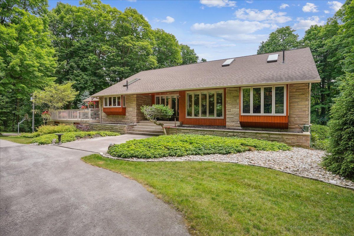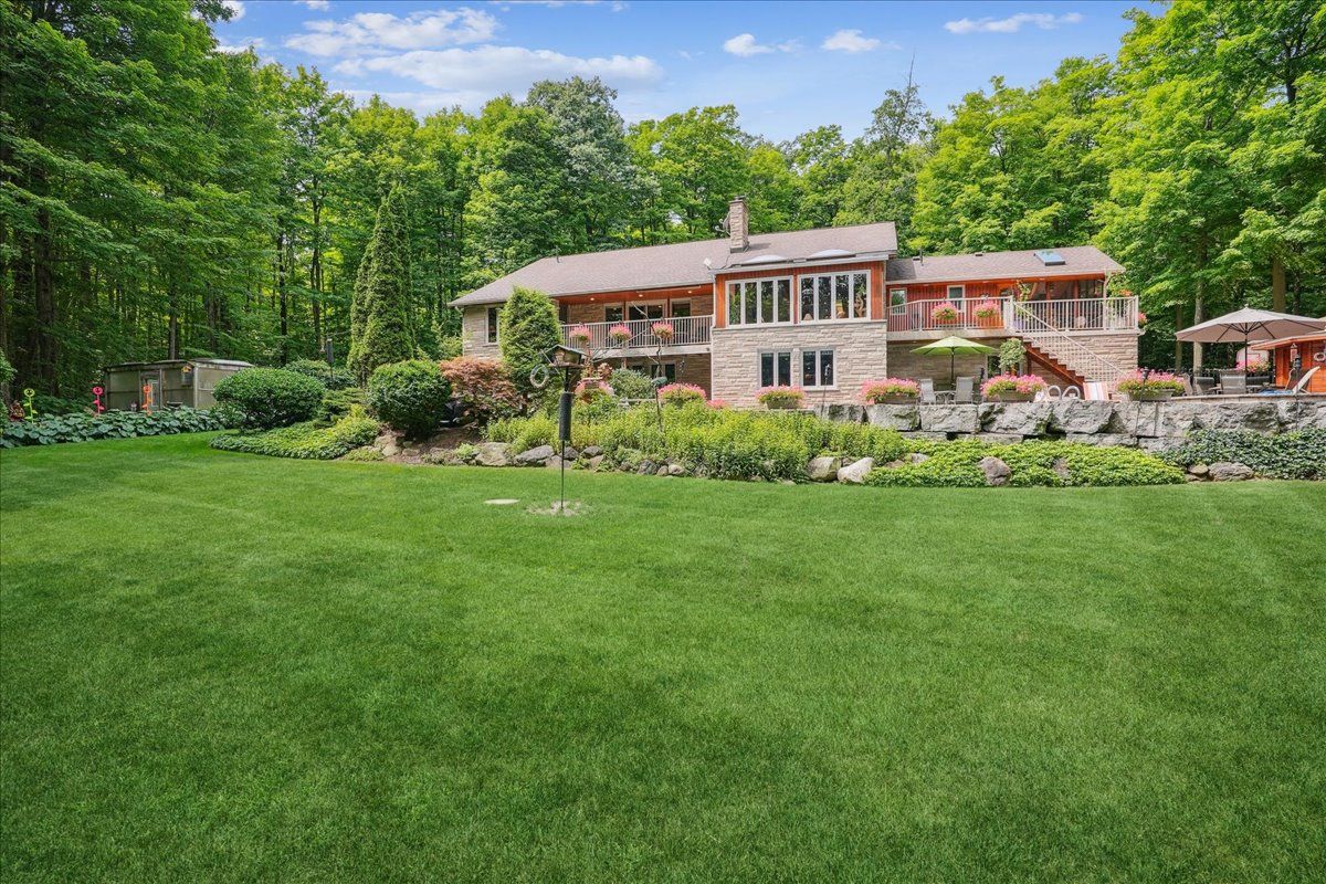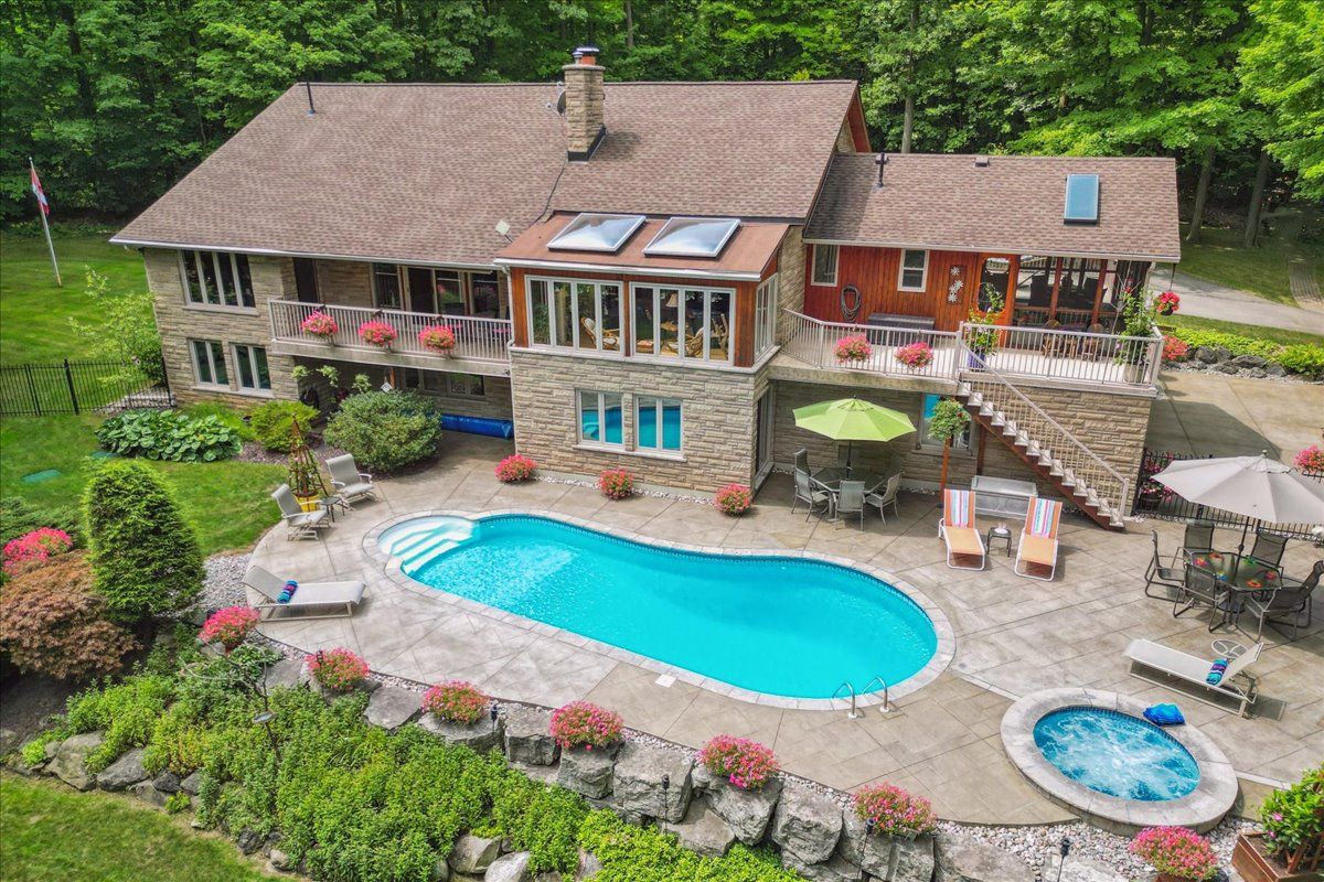 Discover an unparalleled gem rarely available on the market: a private and serene estate with a custom-designed home that fulfills every dream. Set on over 10 lush acres amidst the stunning niagara escarpment, this meticulously cared-for property is just minutes from the 401 and downtown milton. Surrounded by vibrant perennial gardens and towering mature trees, this home is perfectly positioned in the heart of halton conservation's premier parks. You'll be just moments from kelso conservation area, rattlesnake point, crawford lake, hilton falls, and the bruce trail ideal for outdoor enthusiasts and nature lovers. The custom-built bungalow features over 6,000 sq. Ft. Of exquisite living space. Its open-concept design showcases vaulted ceilings, a double-sided stone fireplace, a spacious kitchen with pine cabinets, granite countertops, and an island. A convenient wet bar, elegant dining room, and a fantastic outdoor screen room offers the perfect space for 3-season entertaining. Enjoy stunning views from walkout decks off the kitchen, screen room, sun room, and master bedroom balcony. The lower level is a haven of relaxation and recreation. You will find a large recreation room with a cozy wood-burning stove, a games room, four additional bedrooms, and access to a three-car garage. Walk out to a luxurious inground pool with a hot tub, cabana, and a soothing water feature. The home is equipped with a 400-amp electrical service, a propane-powered generator, and a geothermal heating and cooling system. A separate two-car garage provides the ideal "man cave" and additional storage for garden equipment. Garden enthusiasts will love the large greenhouse/potting shed, and the property boasts a fire pit with a patio area, night landscape lighting, and over one kilometer of meticulously groomed walking trails. Why settle for a cottage when you can have this dream home without the drive? Experience the ultimate in luxury and tranquility this is truly what dreams are made of!