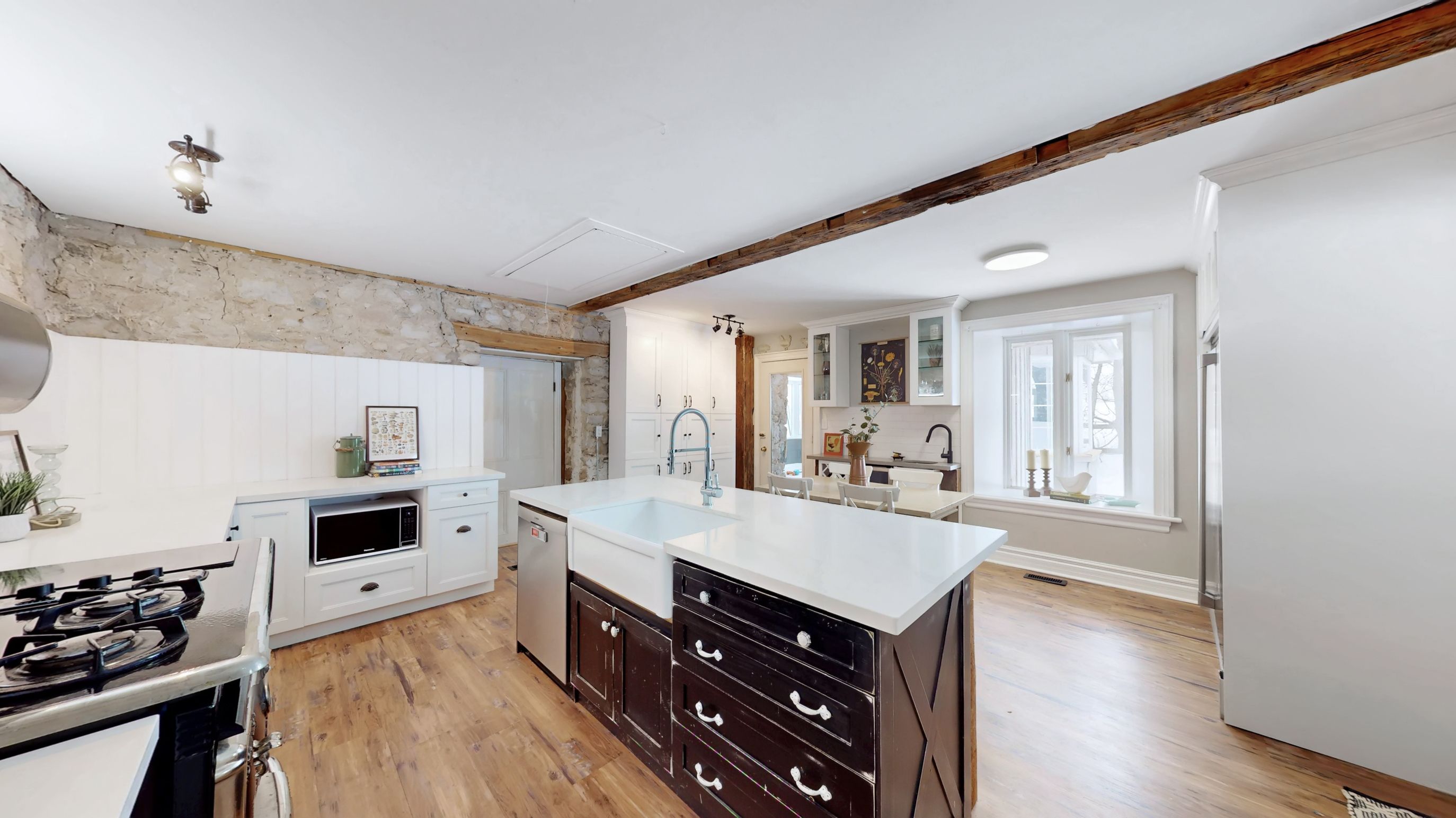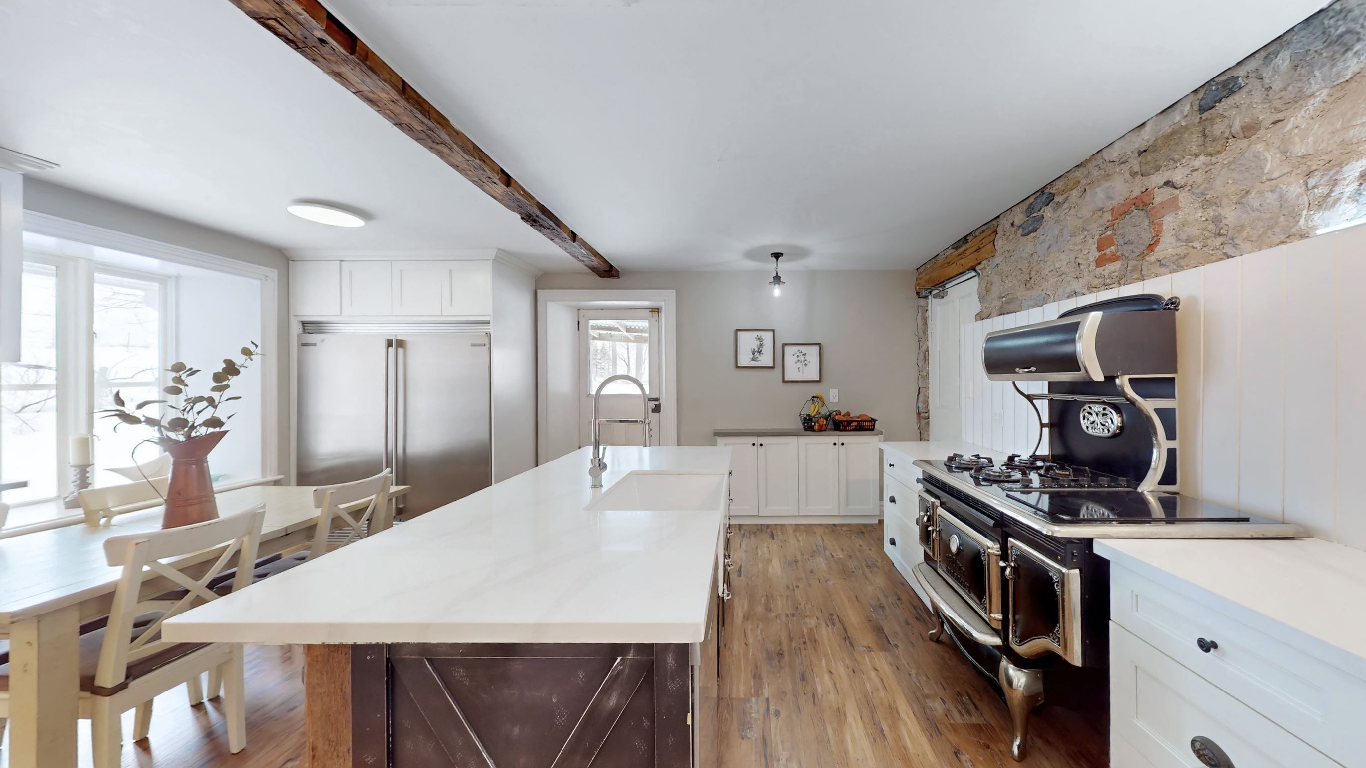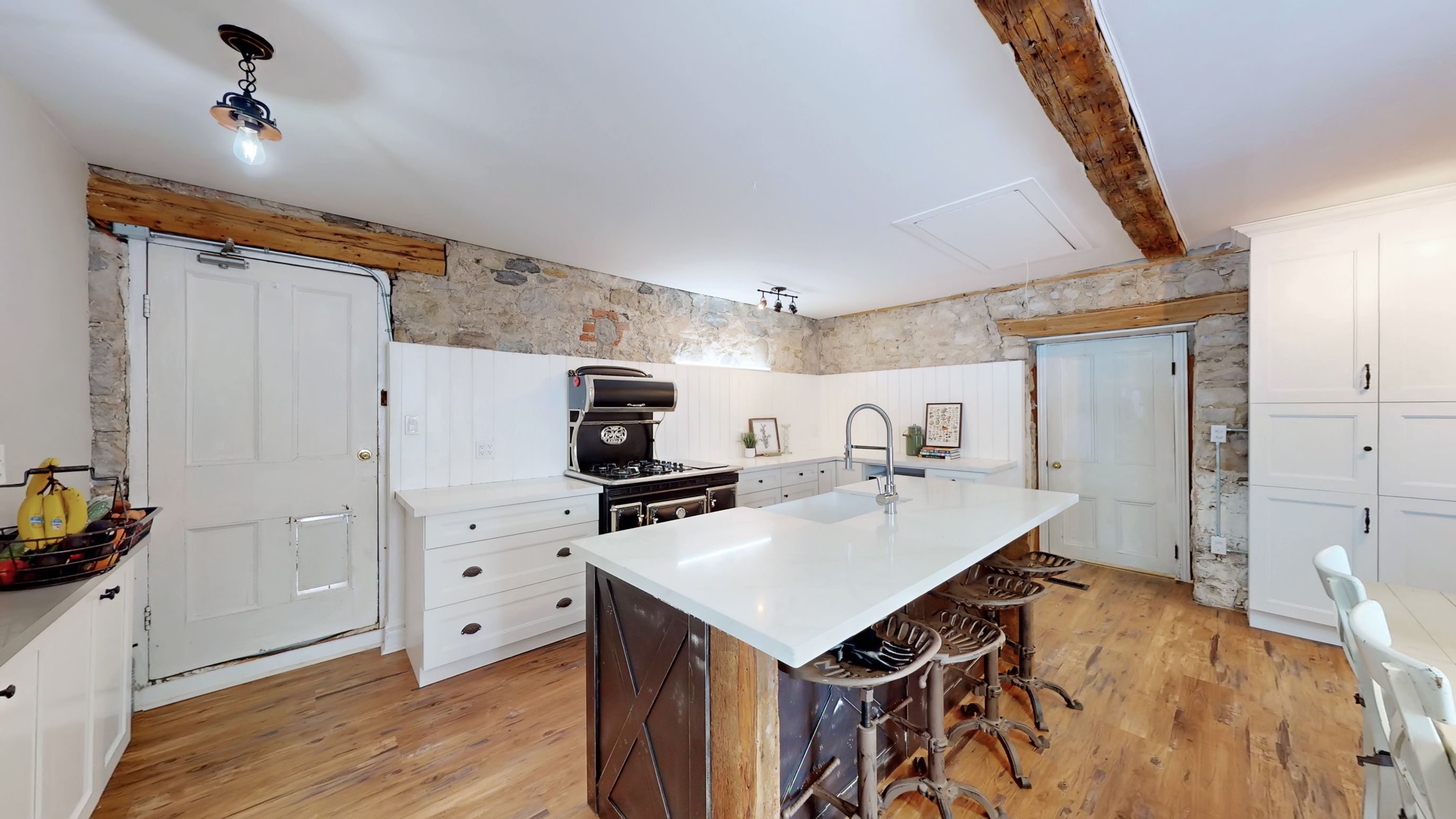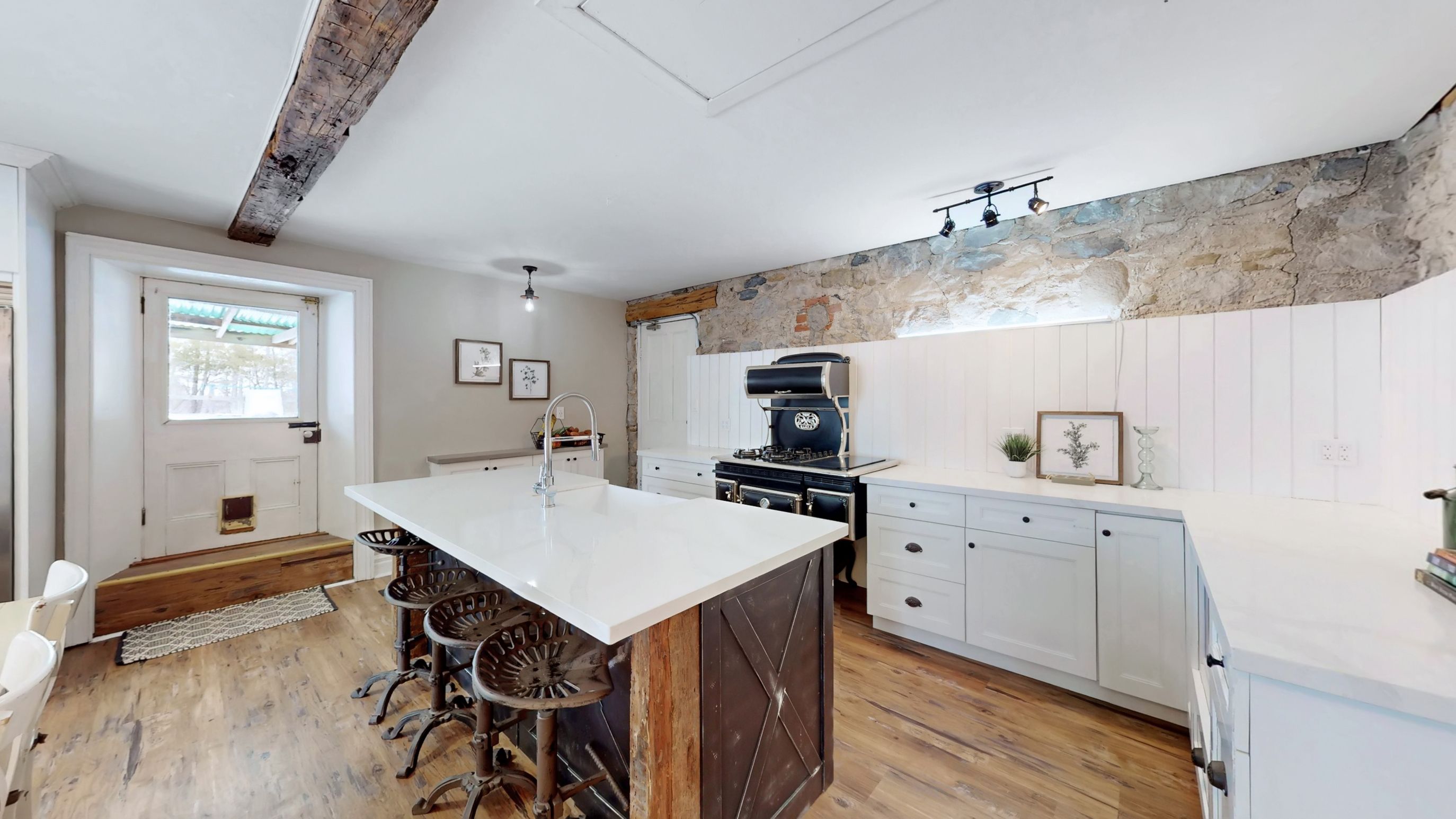 • Renovated kitchen with stone accents and a vintage-style Elmira Stove.