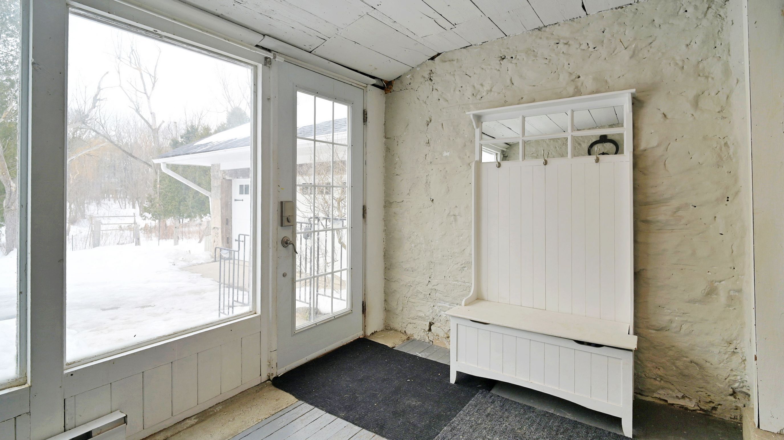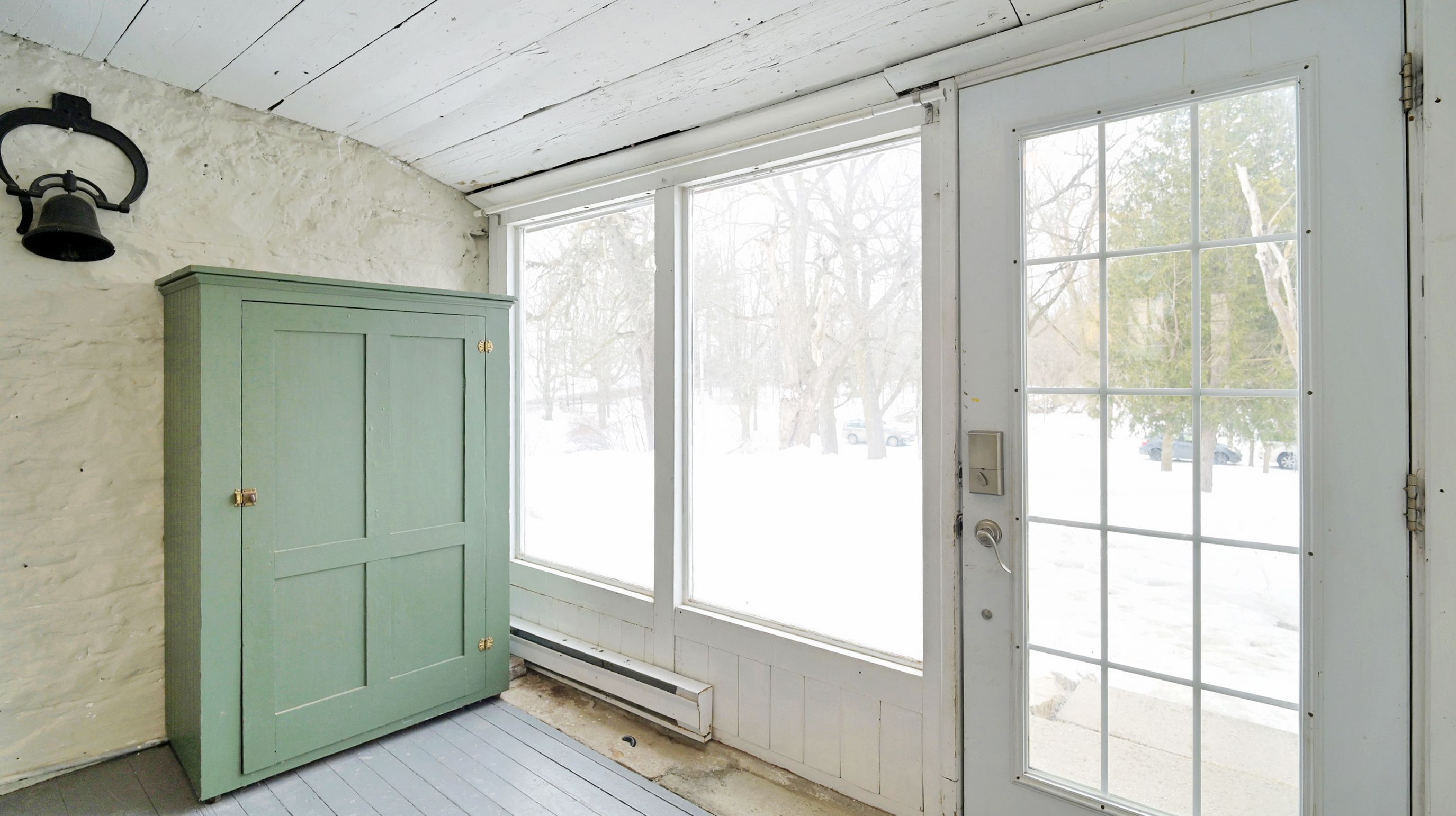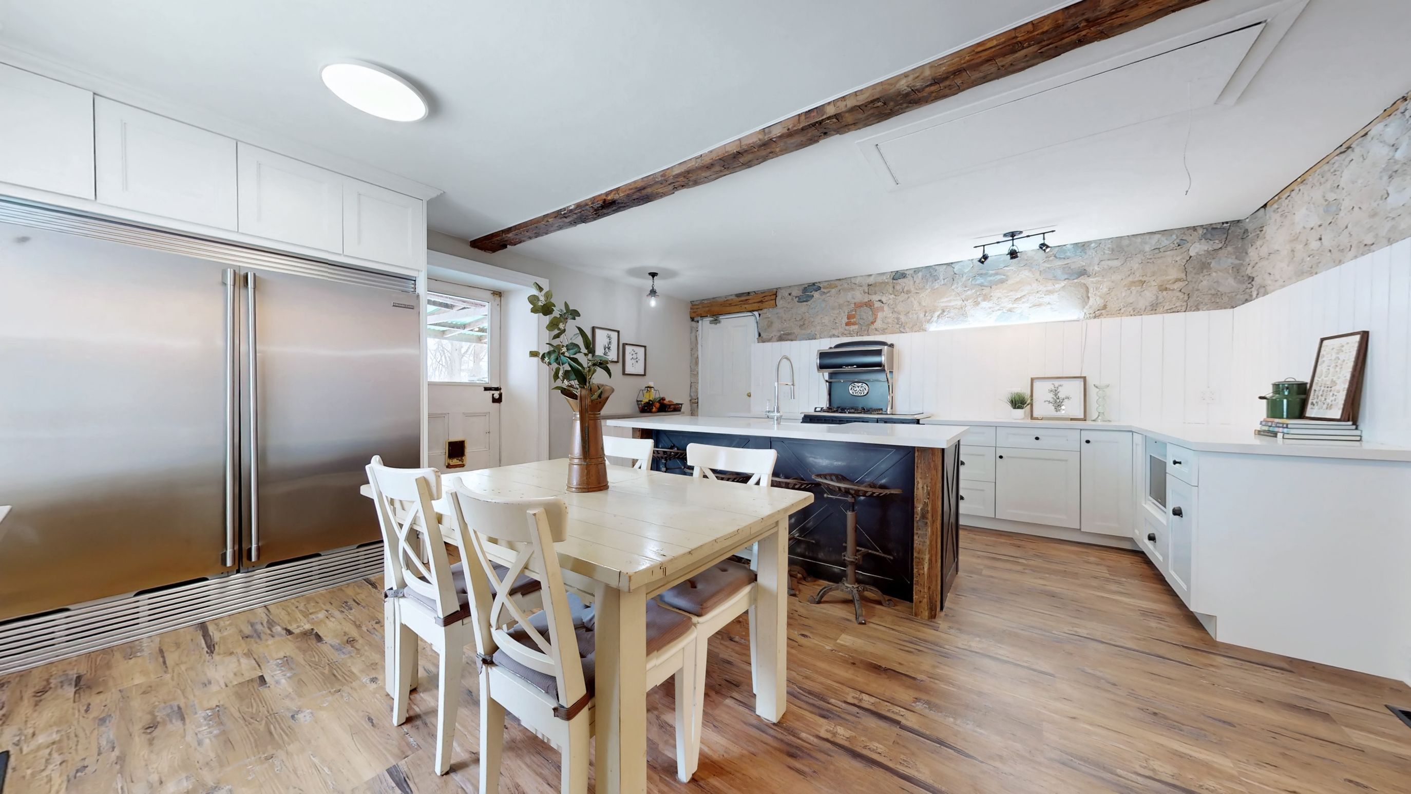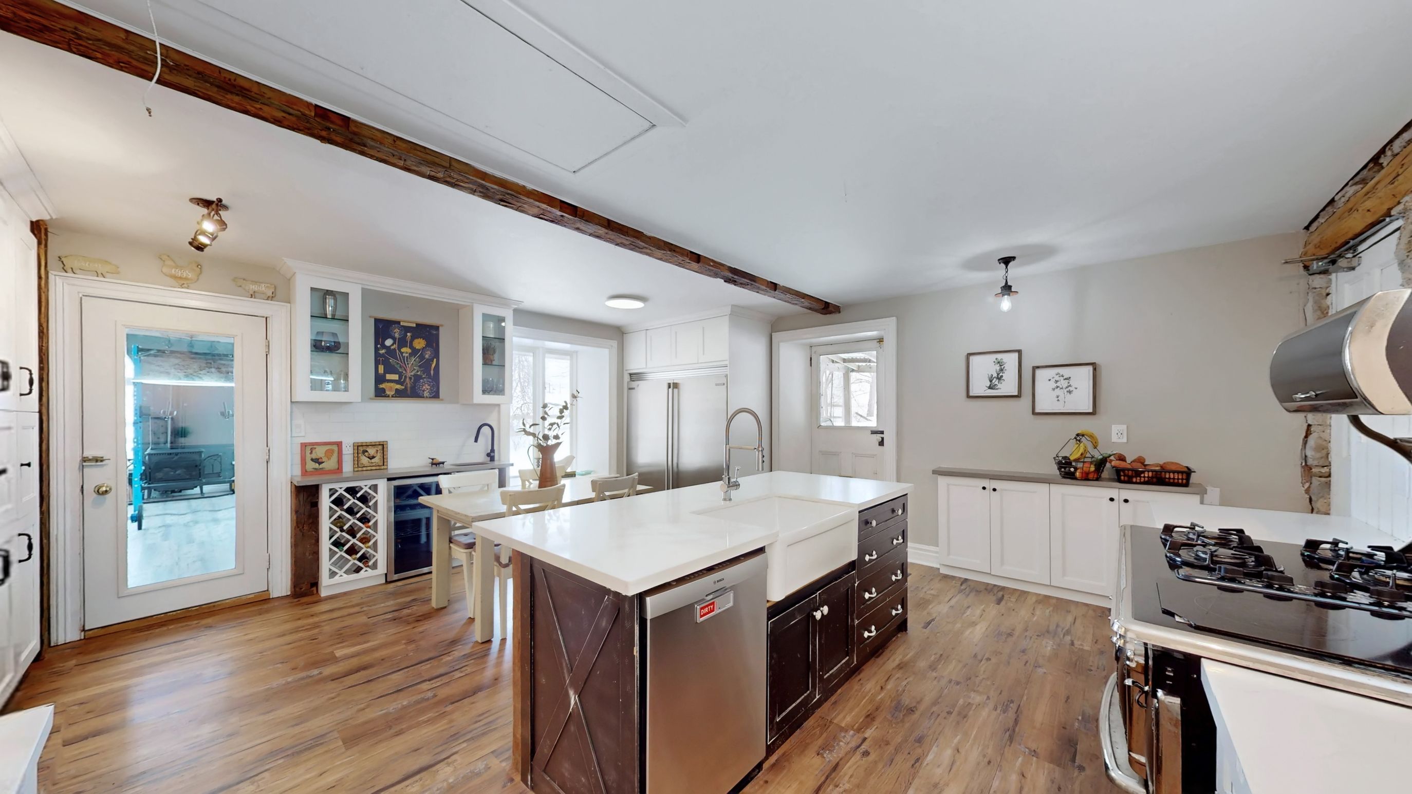 • Renovated kitchen with stone accents and a vintage-style Elmira Stove.