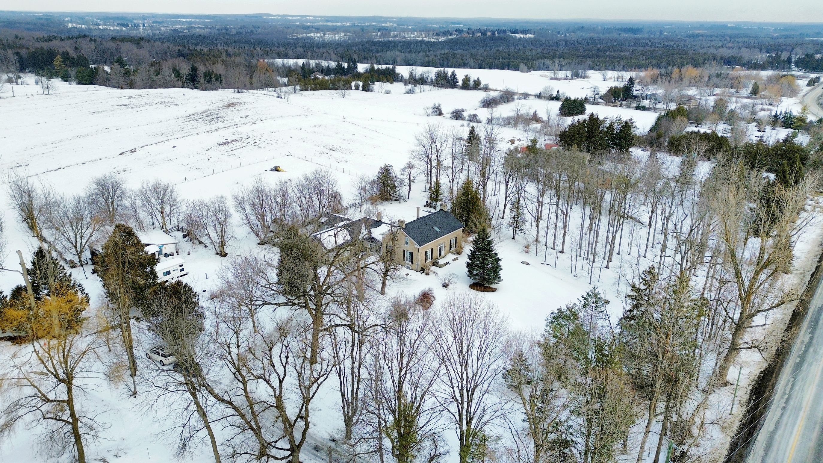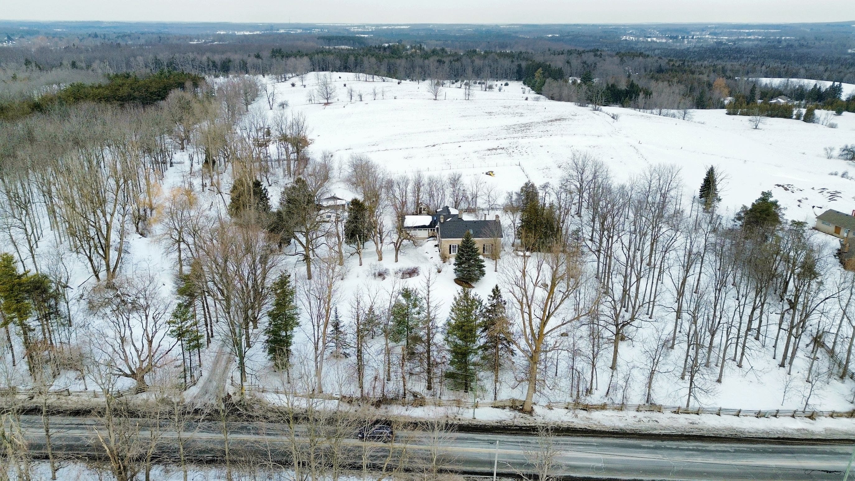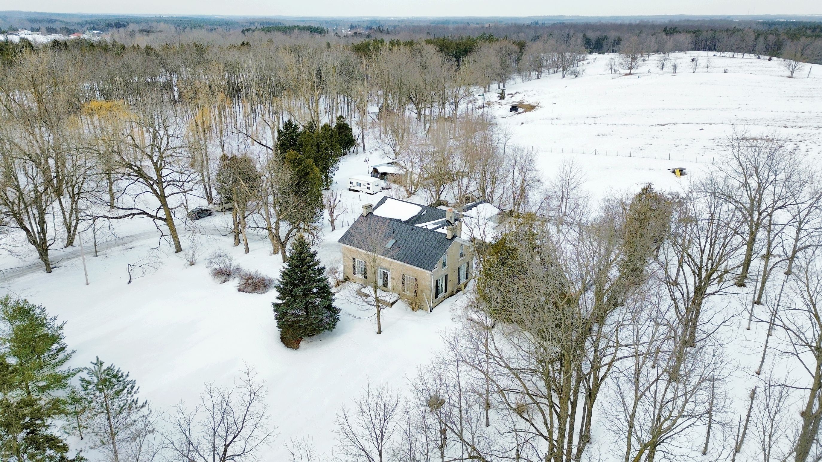 Step away from the ordinary in this welcoming 3,442+ sf, 4 bdrm, 4 bath century home ideal for families seeking space, privacy and a connection to nature. This treasured home blends timeless character on a private 10-acre setting for the ideal hobby farm. You will be transported back in time with a warm with soaring ceilings, open hearth wood-burning fireplaces, deep window sills, and original details. The unique and versatile floor plan can accommodate extended family needs. The recently renovated kitchen showcases a striking stone wall with timber beam accents, stone countertops, hardwood flooring, a vintage-style elmira stove, and a centre island with breakfast bar. Separate family, living, and dining rooms provide ample space for both everyday living and special occasions. The formal dining room currently serves as a main-floor primary bedroom, complete with a walk-in closet/office. The 2nd dining and currently used as a gym features oversized windows, a striking stone wall, and ample space for a harvest table, with a walkout to the garden. More conveniences include an enclosed sunroom, a mudroom with access to the 2 car garage, main-floor laundry, and a stately wood staircase to the bedrooms. Enjoy a pool area, views of a tranquil pond, a vegetable garden, storage & barn and gently rolling open fields that are perfect for exploring and pasture. An energy-efficient heat pump for heat and air conditioning (2019), r50 attic insulation, and updated asphalt shingles. Versatile outbuildings and an attached two-car garage offer ample space for cars, hobbies, toys, motorbike, outdoor gear and more. A generous driveway and laneway provide plenty of parking for cars, trucks and campers. All this is located just minutes from town amenities, schools, churches, blue springs golf club, and the go train station offering the perfect blend of country living and town convenience.