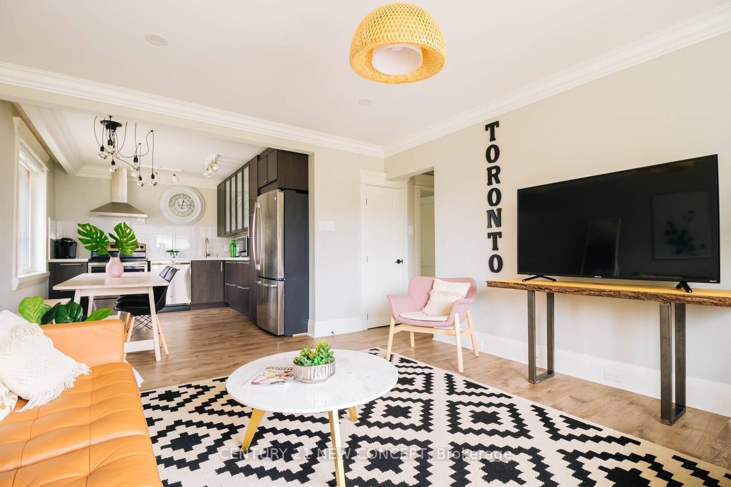 • Open concept kitchen with quartz countertops and stainless steel appliances.