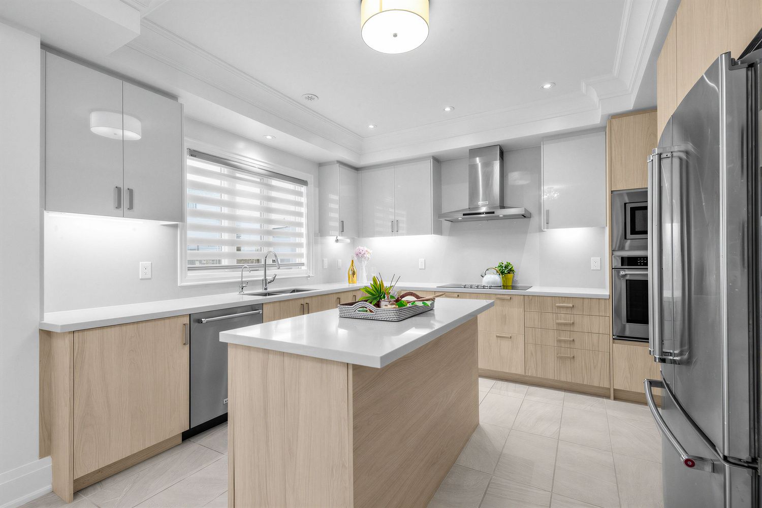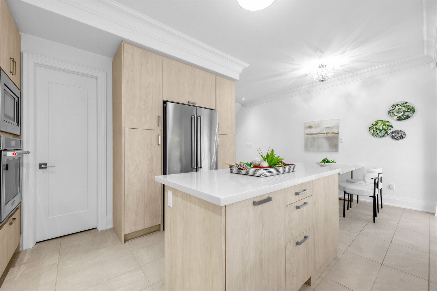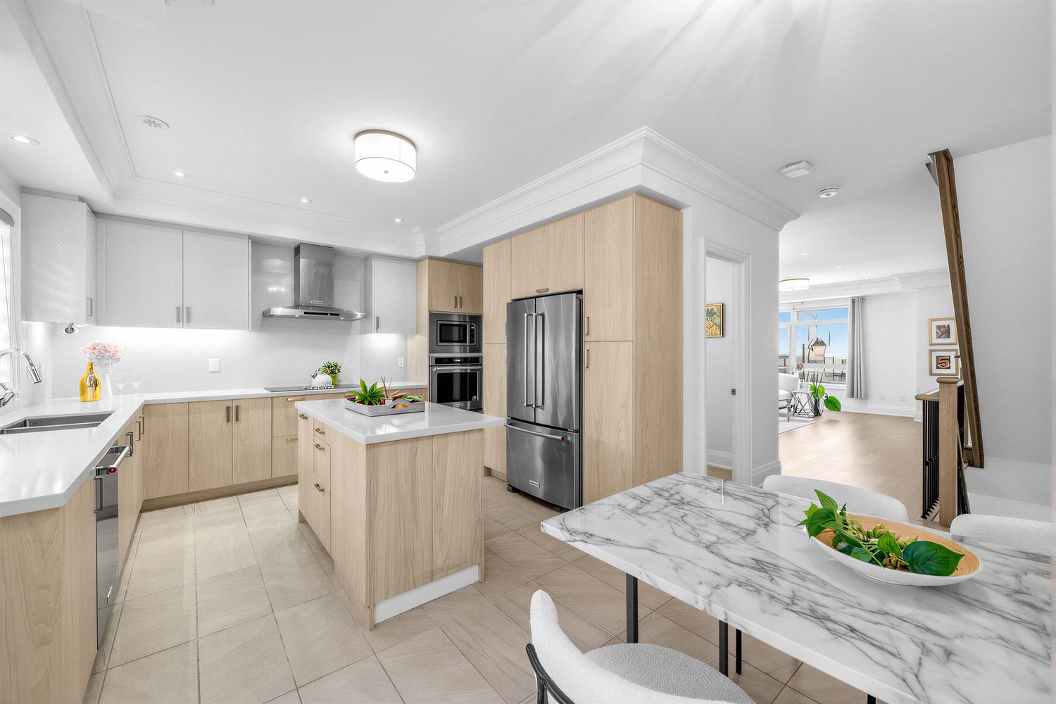 • Modern kitchen equipped with quartz countertops and stainless steel appliances.