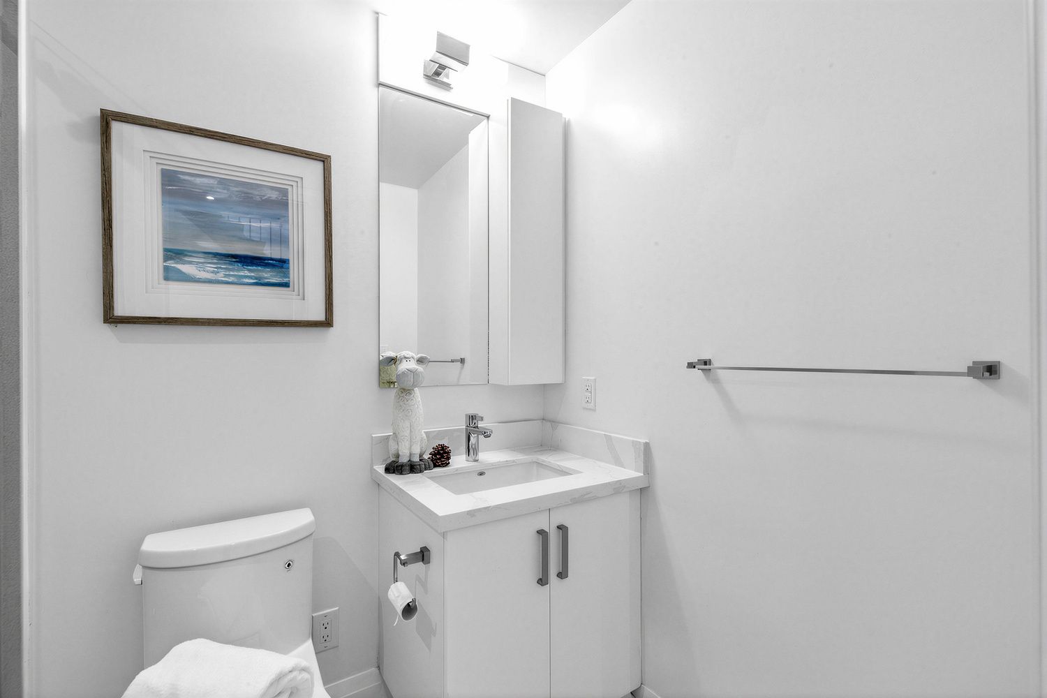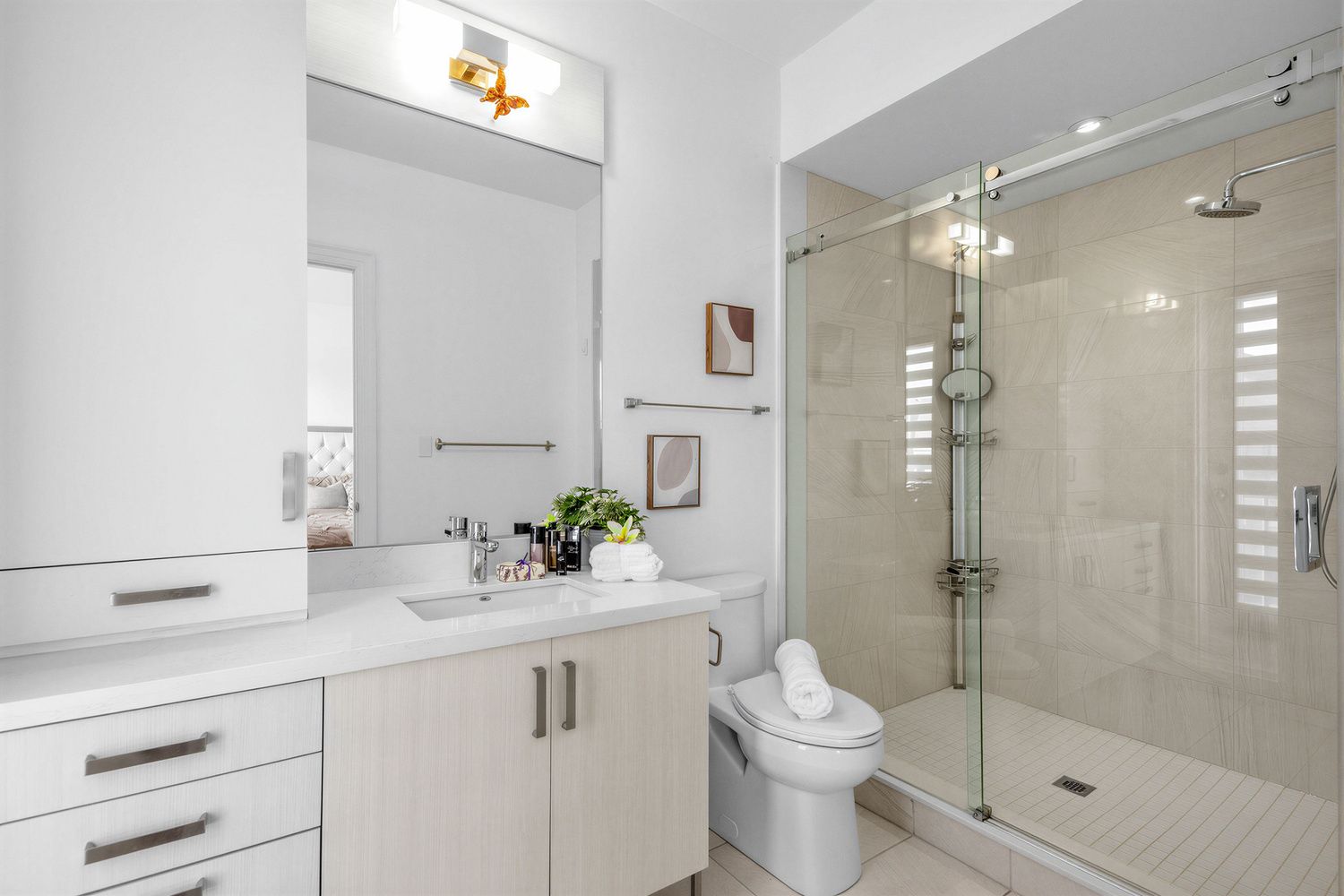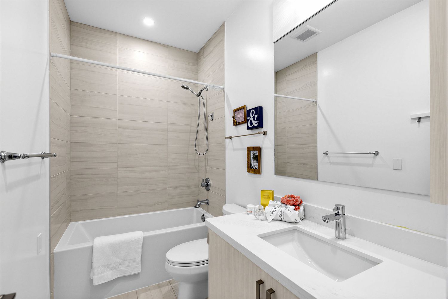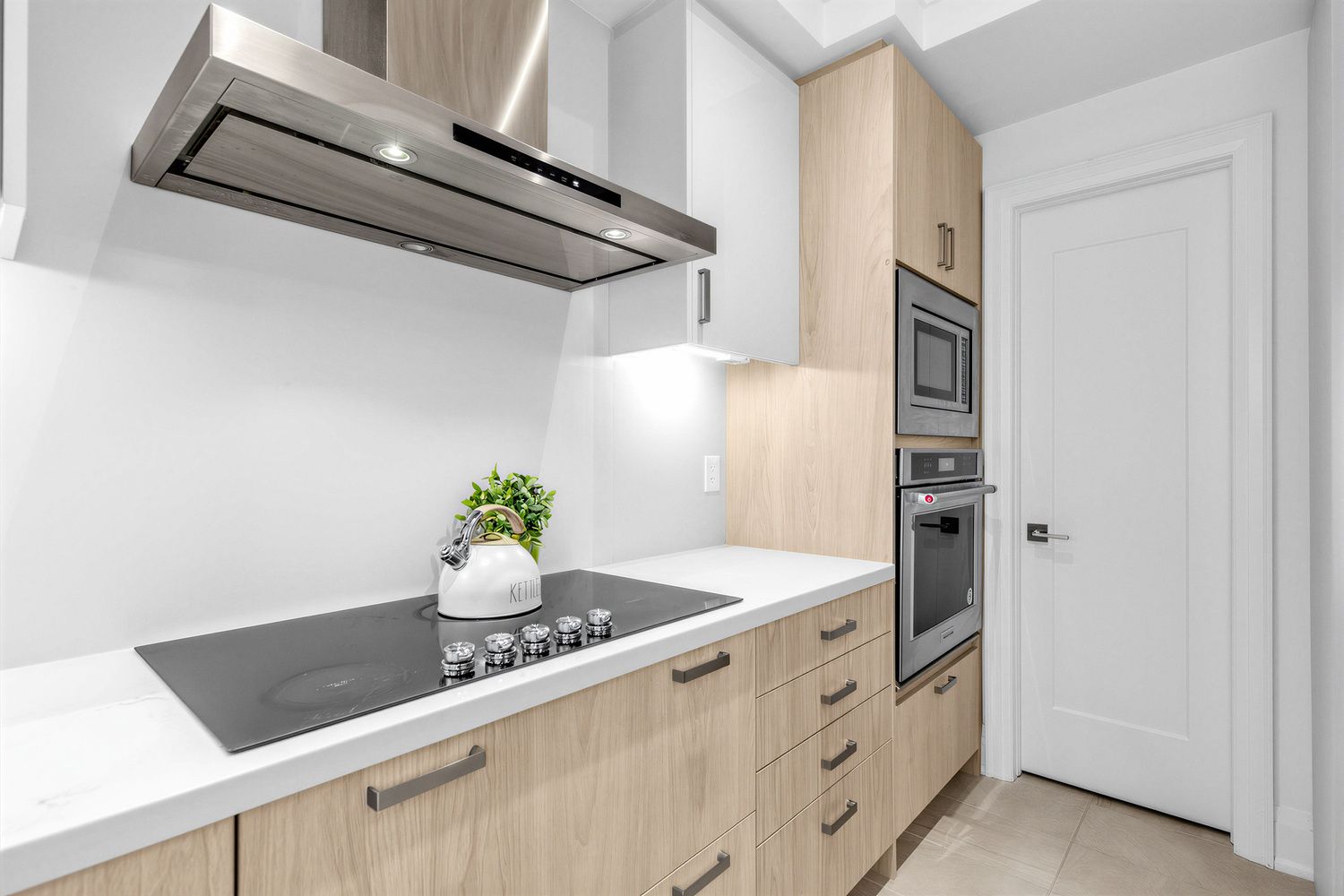 • Modern kitchen equipped with quartz countertops and stainless steel appliances.
