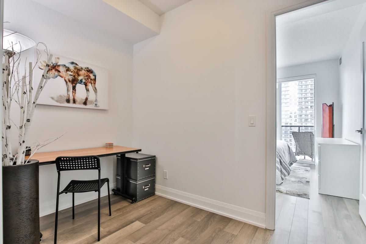 1 bedroom + den unit at lago. This spacious and bright unit offers 663 sq. Ft. Of functional living space, sw lake views, 4 pc bathroom, large primary bedroom closet, engineered hardwood, parking & locker. Steps to waterfront, trails, bike path, parks, ttc, restaurants, grocery store & so much more. Condo amenities include indoor pool, hot tub, gym, yoga studio, theater room, party room, guest suite, 24 hr concierge & more.