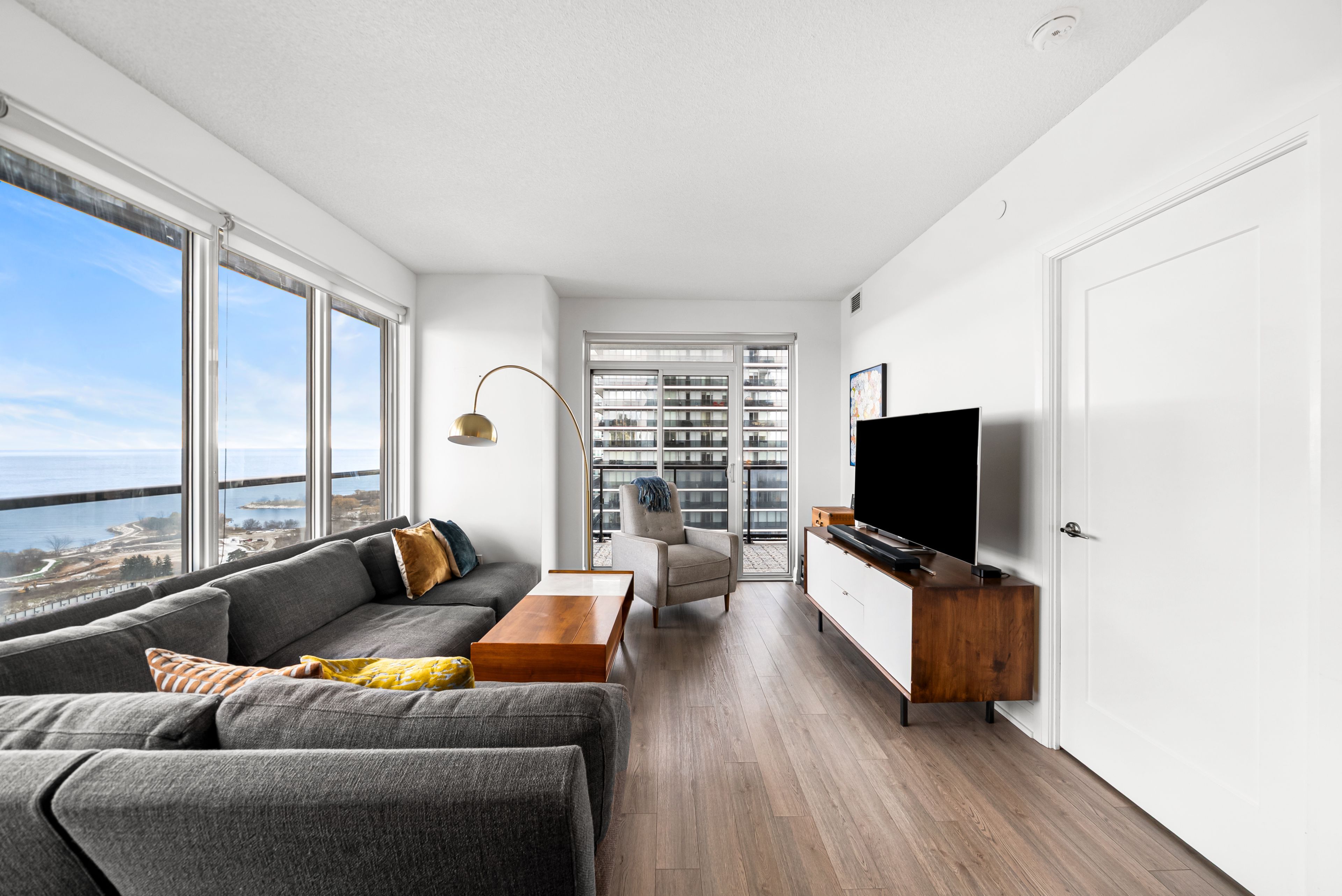 • Stunning wrap-around balcony with panoramic lake and city skyline views.