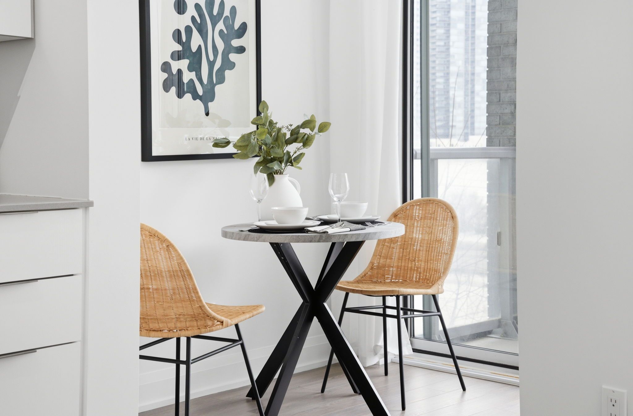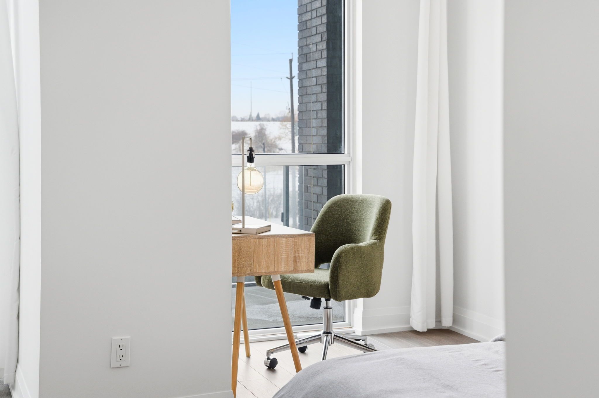• Bright studio with floor-to-ceiling windows and sunset views.