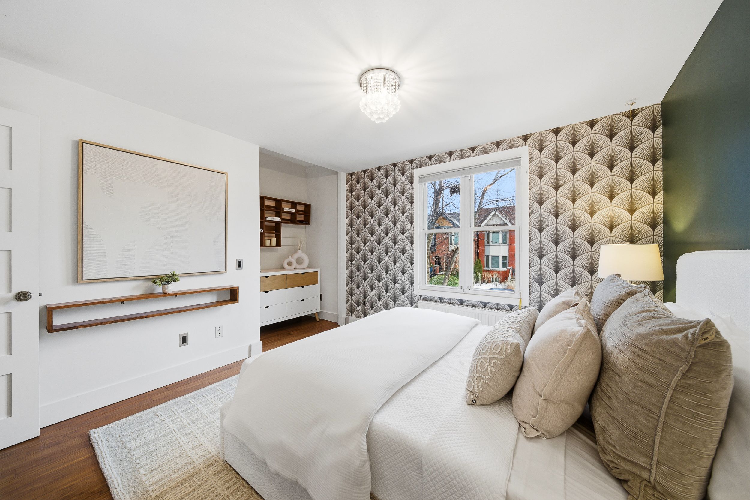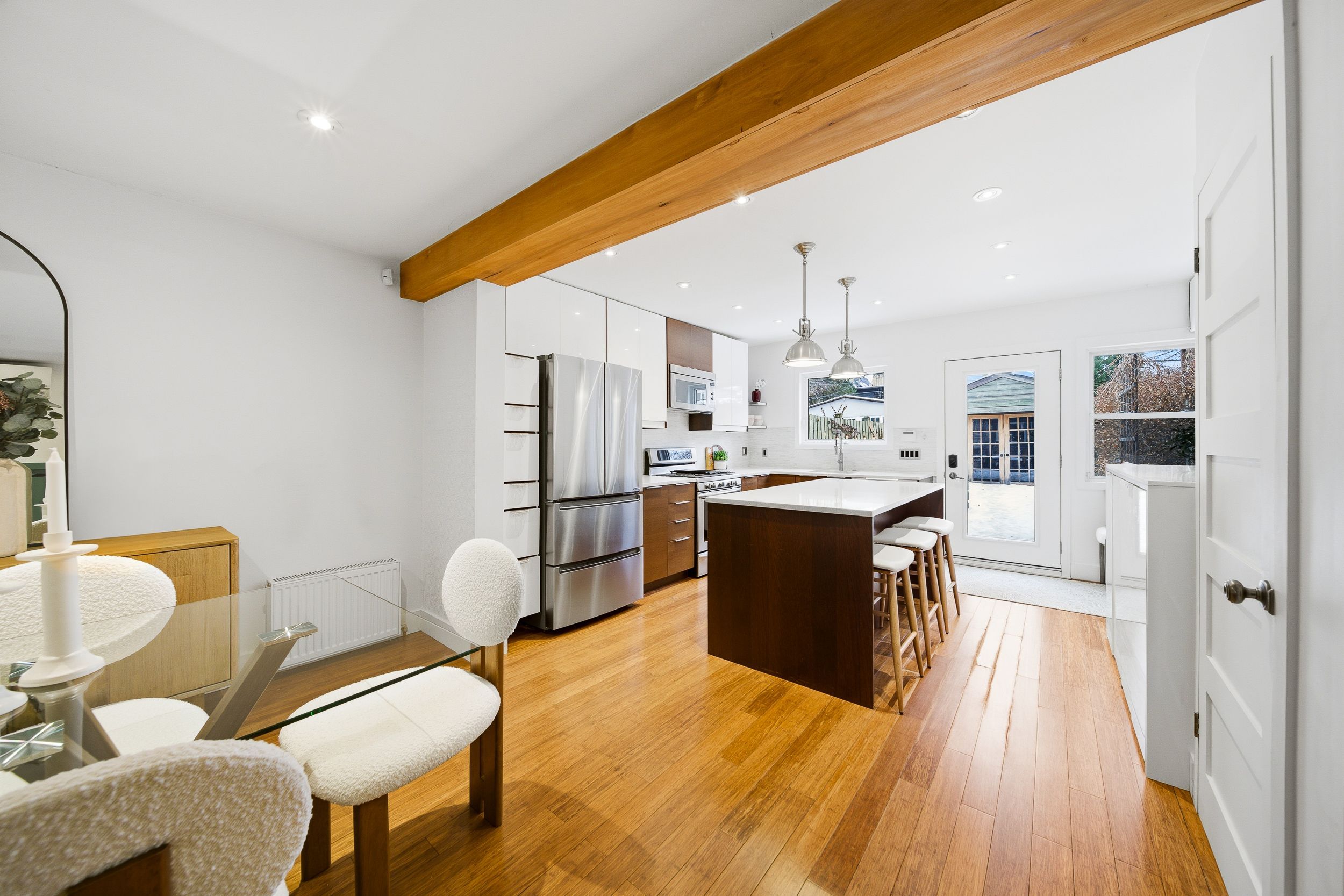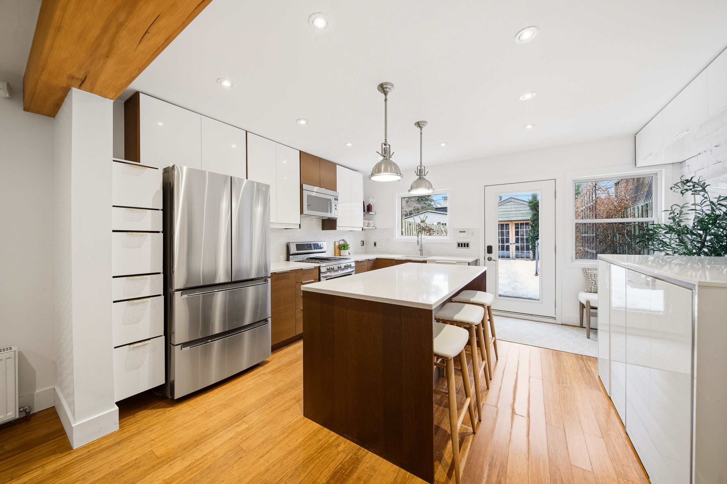 Rare opportunity in prestigious playter estates. This beautifully designed 2-bedroom home with laneway garage parking offers an exceptional blend of character, comfort, and ease in one of toronto's most sought-after neighborhoods. The open-concept main floor is anchored by an elegant foyer with slate flooring, double closet storage, and a preserved vintage heritage front door, while exposed wood beams and a refined kitchen with quartz countertops, a generous centre island with seating, and thoughtfully integrated storage create a welcoming space for both everyday living and entertaining. Thoughtful lighting upgrades throughout include fully dimmable main fixtures, along with dimmable pot lights in the primary bedroom closets and shower, allowing for both function and ambience. The spa-inspired bathroom features radiant heated floors, adding a touch of everyday luxury. Recent, comprehensive roof updates completed with transferable warranties provide significant peace of mind, while a west-facing, fully fenced garden with gas hookup offers a private outdoor retreat. Exceptionally low operating costs further enhance the home's appeal, all just steps to coveted jackman avenue junior public school, chester subway station, and the danforth's best cafés, shops, and restaurants in an address where lifestyle, community, and long-term value consistently command a premium.