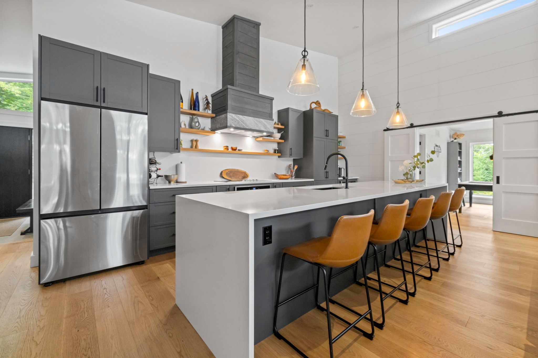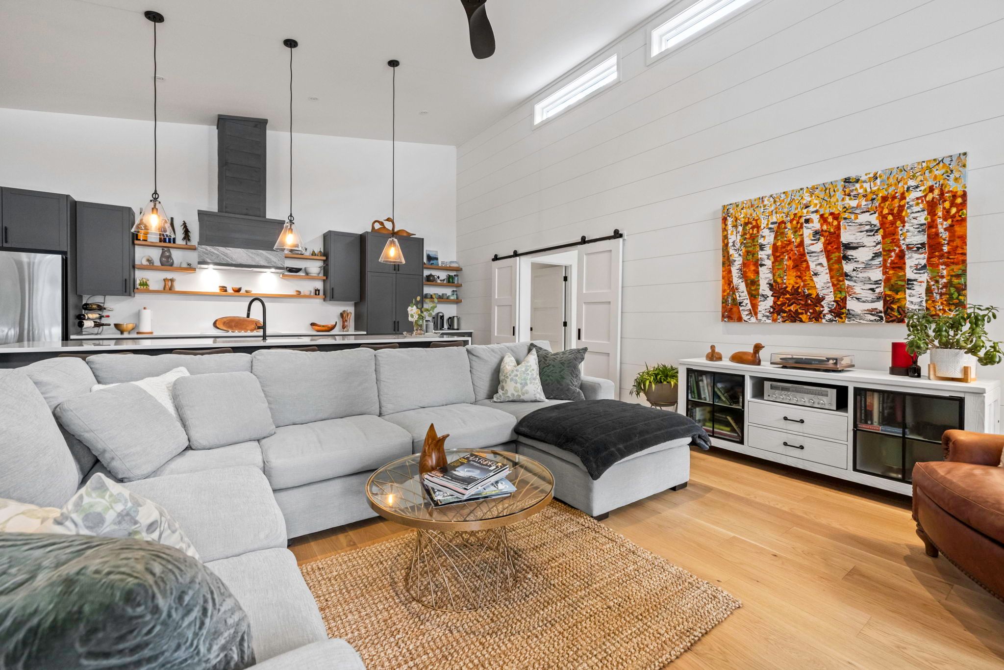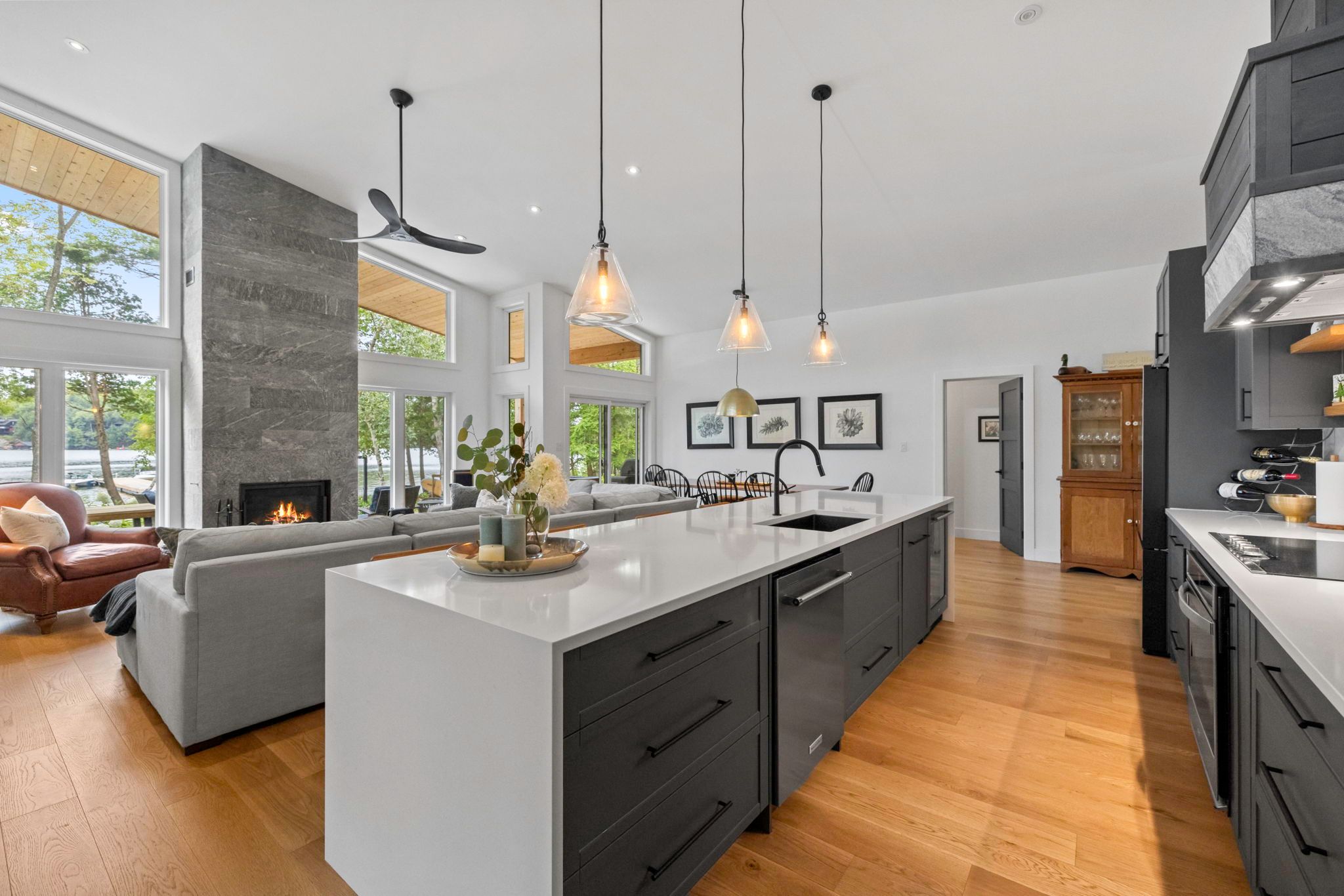 • Expansive open-concept living area with high ceilings and a stone fireplace.