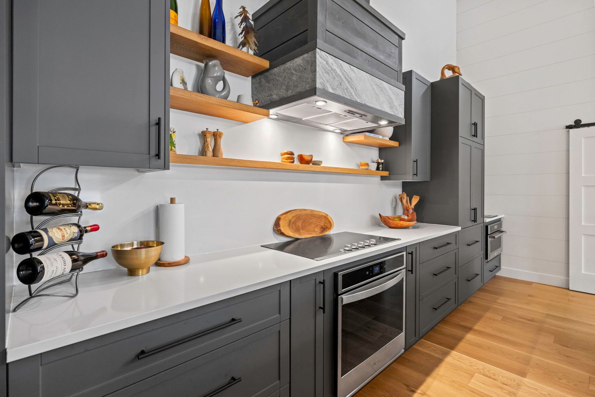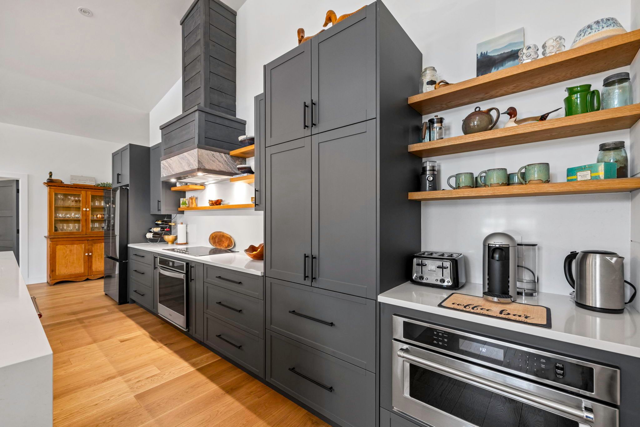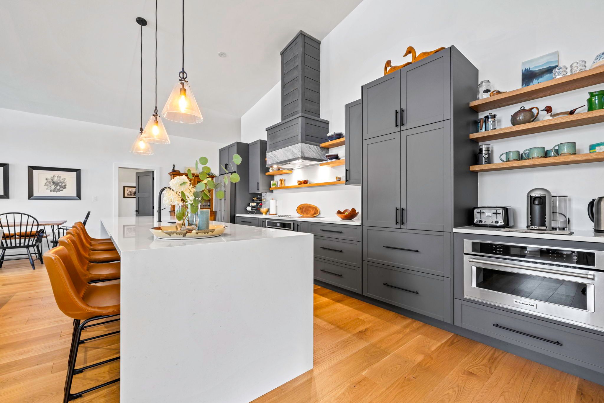 • Expansive open-concept living area with high ceilings and a stone fireplace.