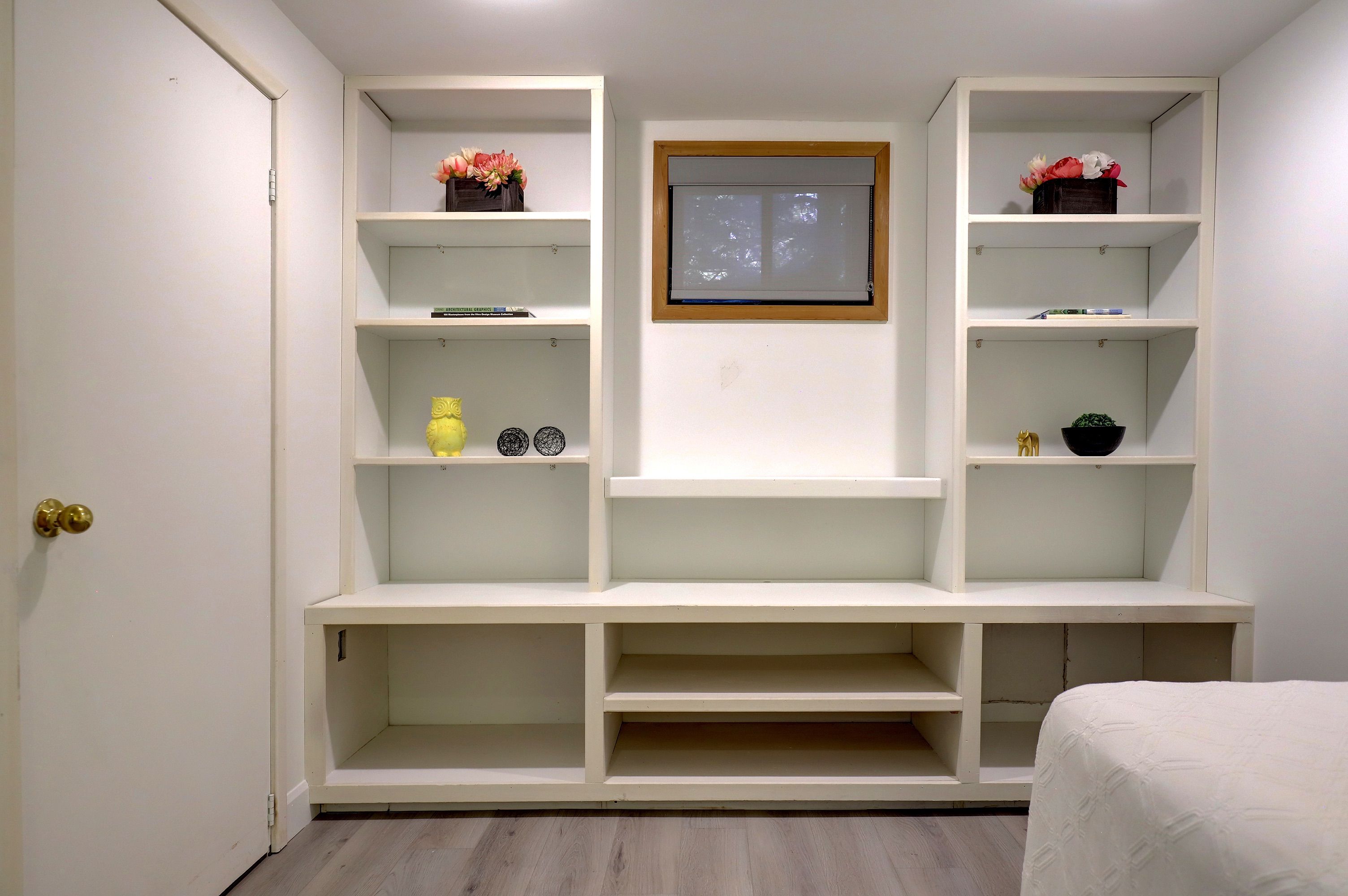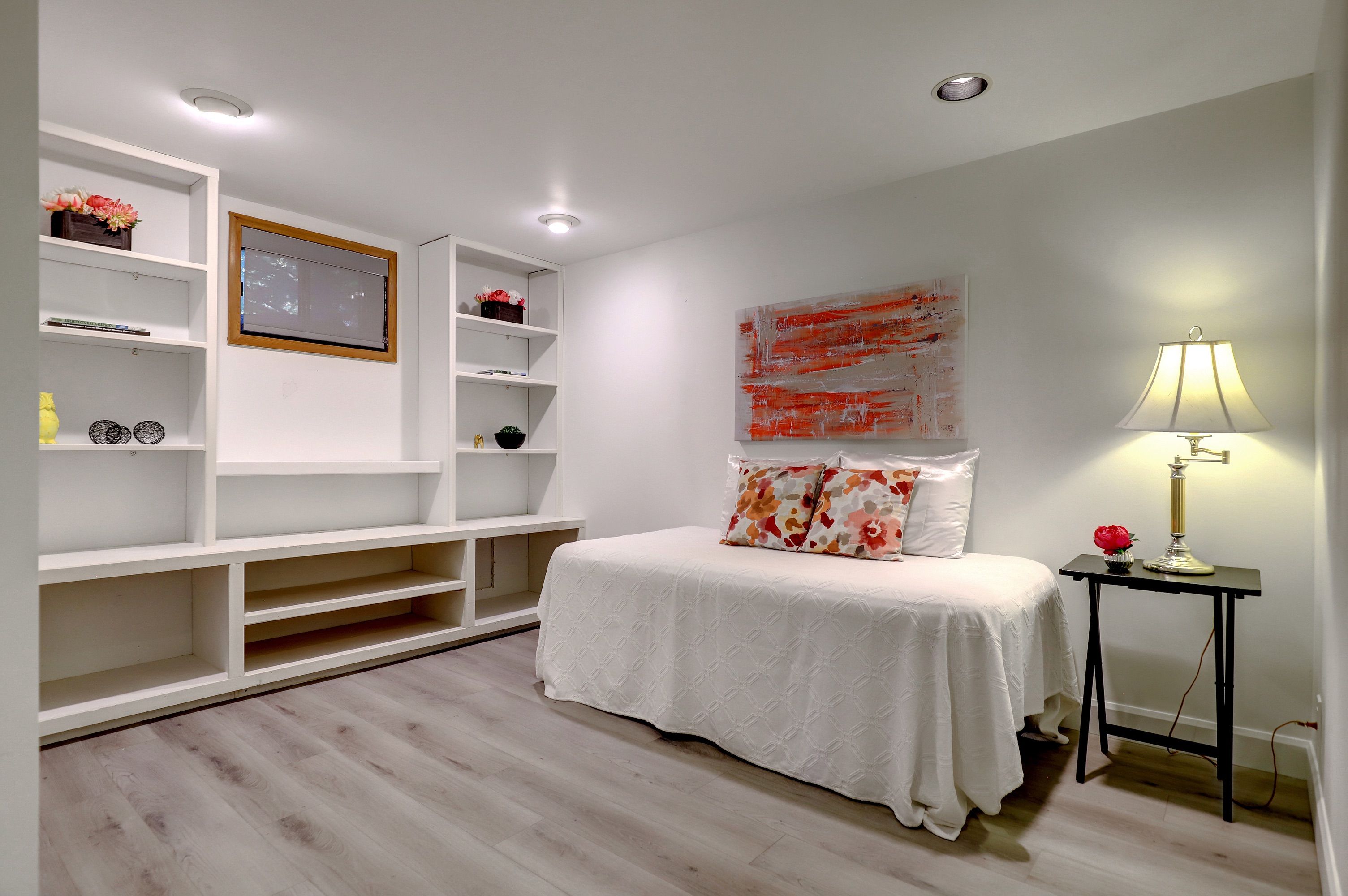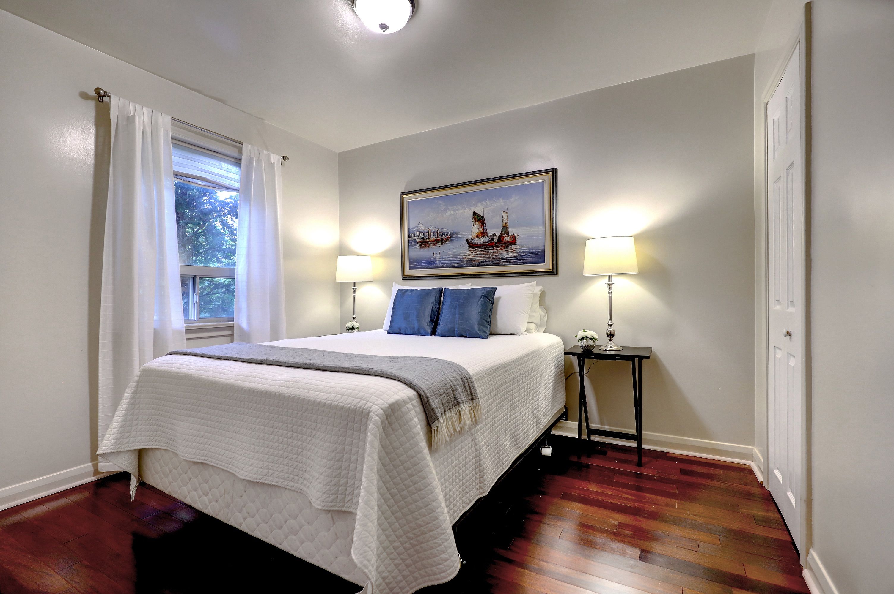 • Bright living room with large bay window and hardwood floors.
