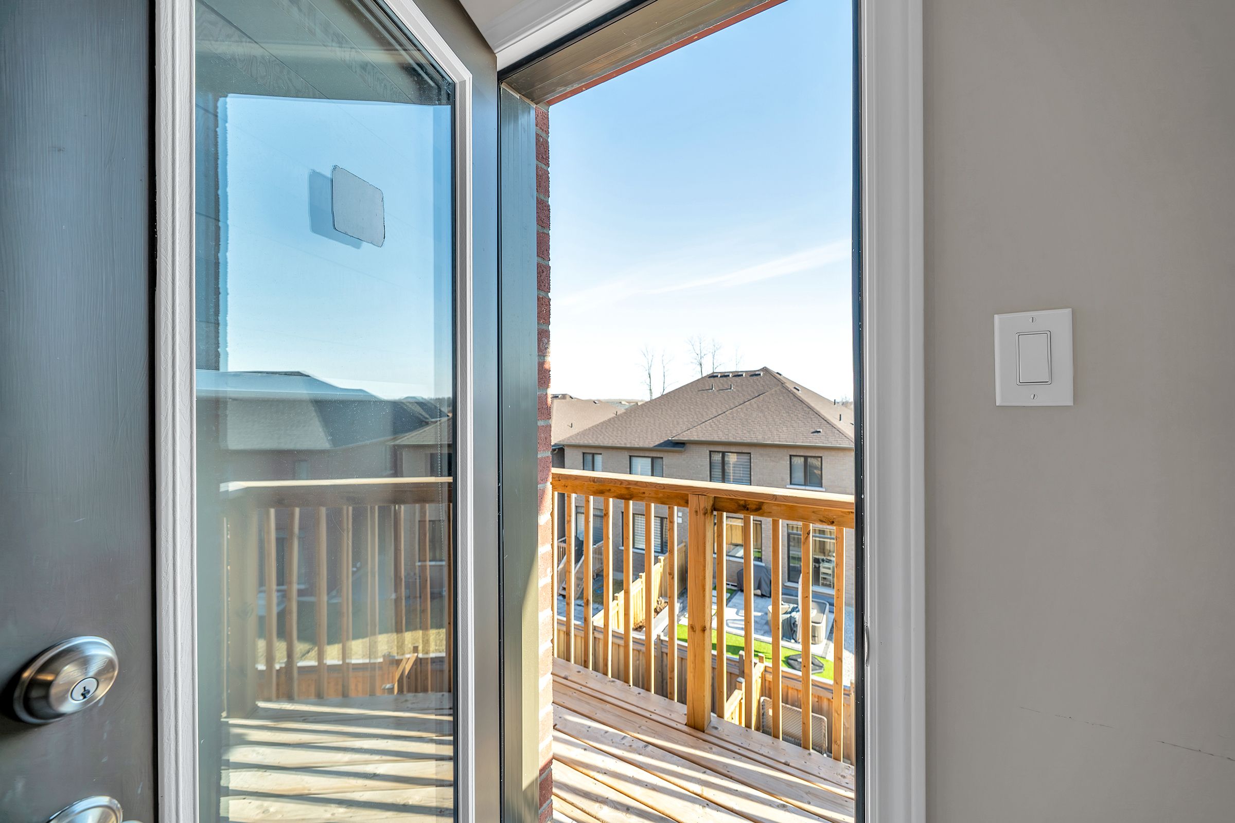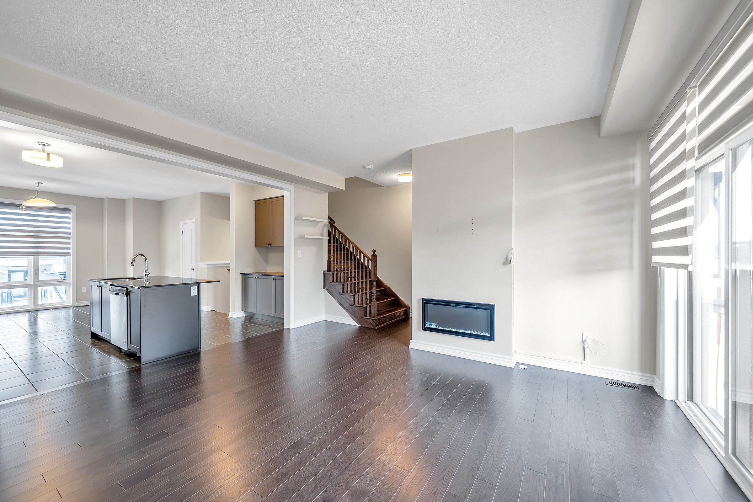Welcome to 56 douet lane! This spacious 4-bedroom, 4-bathroom gem is designed for modern living, featuring soaring 9-foot ceilings on the main floor, and an open-concept layout that offers a sense of freedom and flow. With a larger-than-average size and a more open feel than most townhomes in its class, this home stands out. Large windows throughout flood the home with natural light, creating a bright and inviting atmosphere in every room, enhanced by stylish zebra blinds that allow for the perfect balance of privacy and light control. Balconies on the main floor in the living room and second floor in the primary bedroom. Home comes fully equipped with stainless-steel appliances, practical upper-floor laundry, and the added comfort of an electric fireplace and central a/c for year-round convenience. Step outside from the 4th bedroom to a brand-new interlocked backyard patio space (2024) with simple accent lighting, and enjoy the added privacy of new fencing (2023), creating the perfect space for outdoor relaxation or entertaining. Located in a thriving community, everything you need is right at your doorstep: park just steps away, grocery stores, shopping, public transit, close to ajax go station, and quick access to the 401, making this an ideal spot for easy living. Whether you're looking to upgrade your space or start fresh in a new area, this home offers the perfect blend of comfort, style, and convenience.