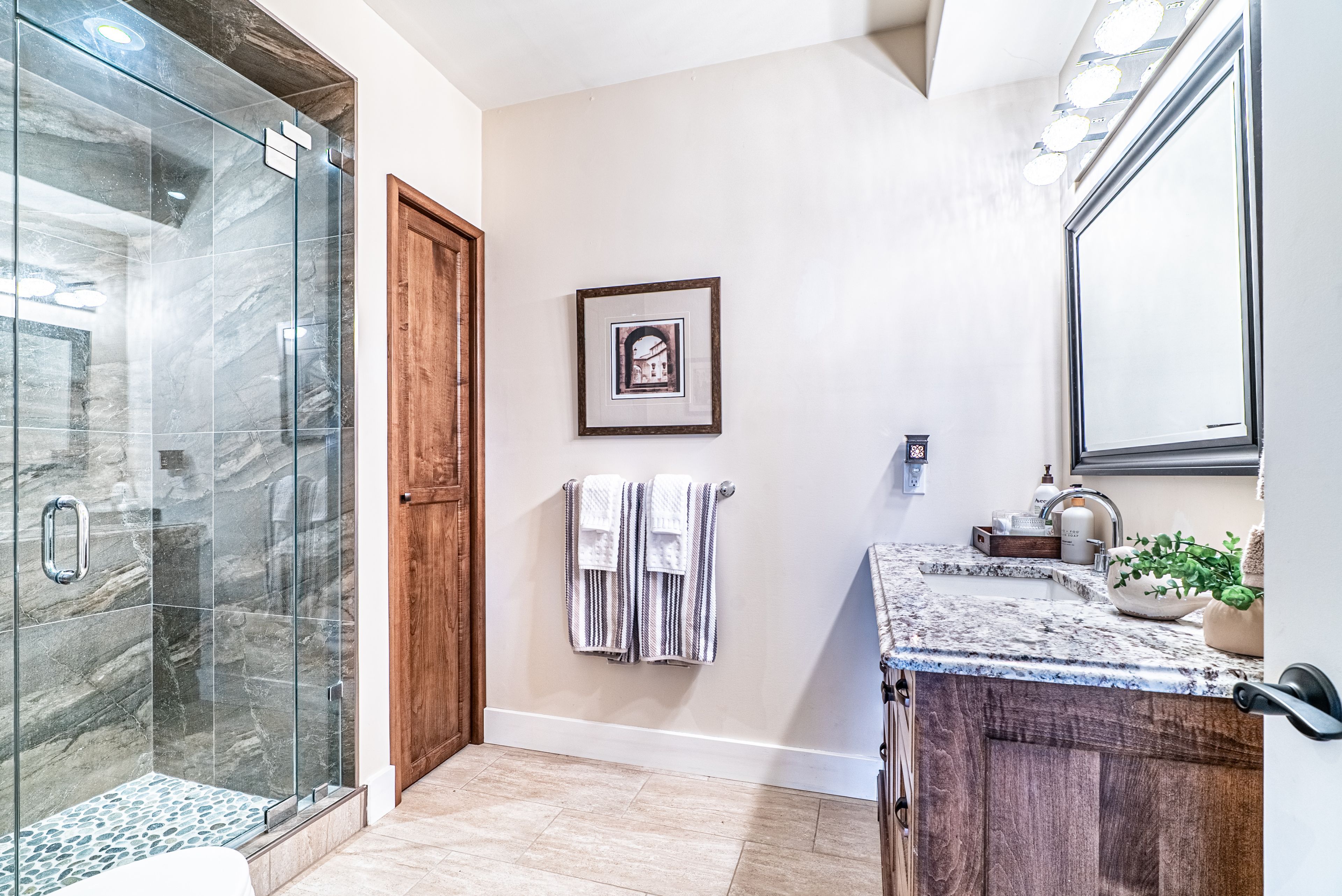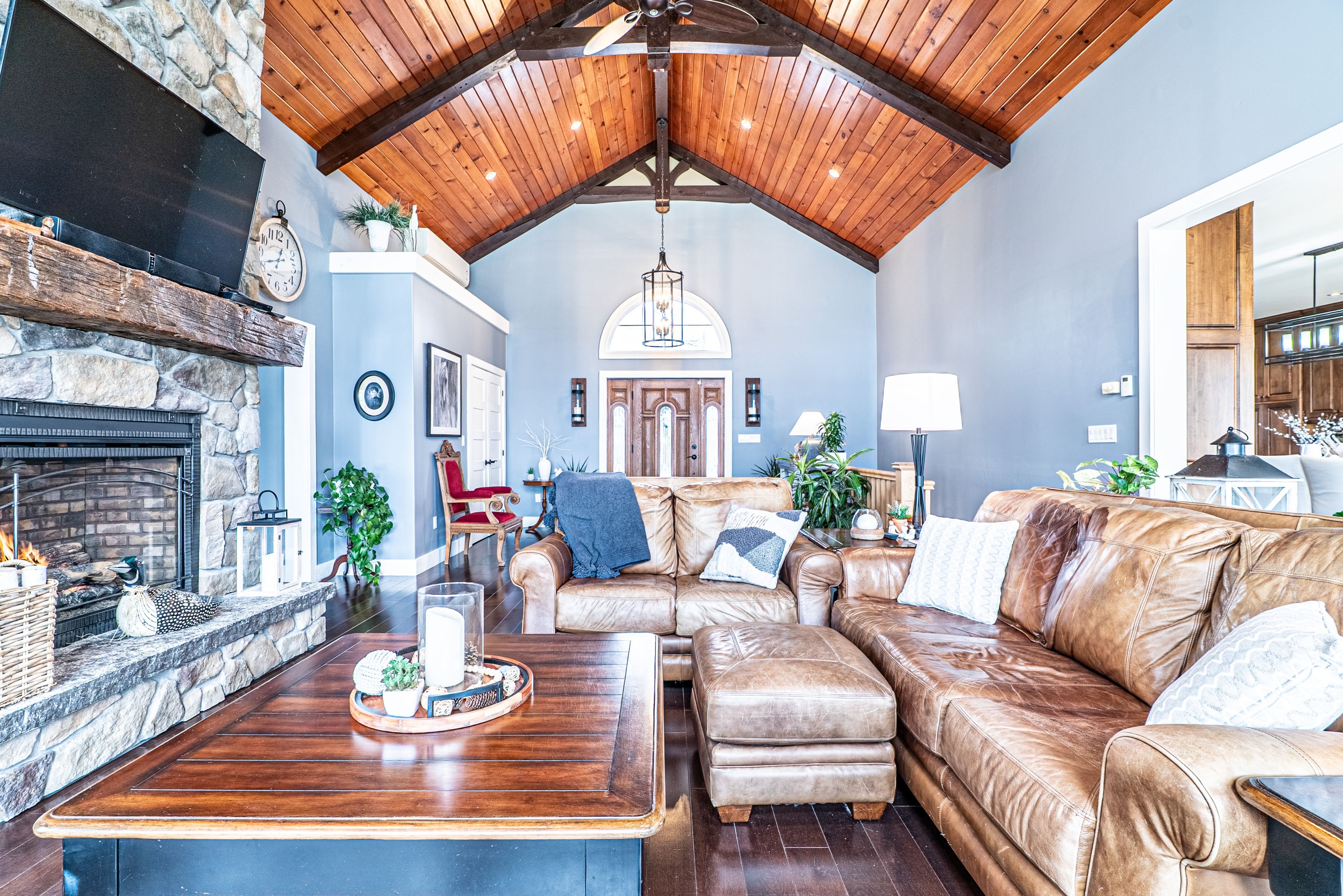 • Bright great room with cathedral ceilings and a stone gas fireplace.