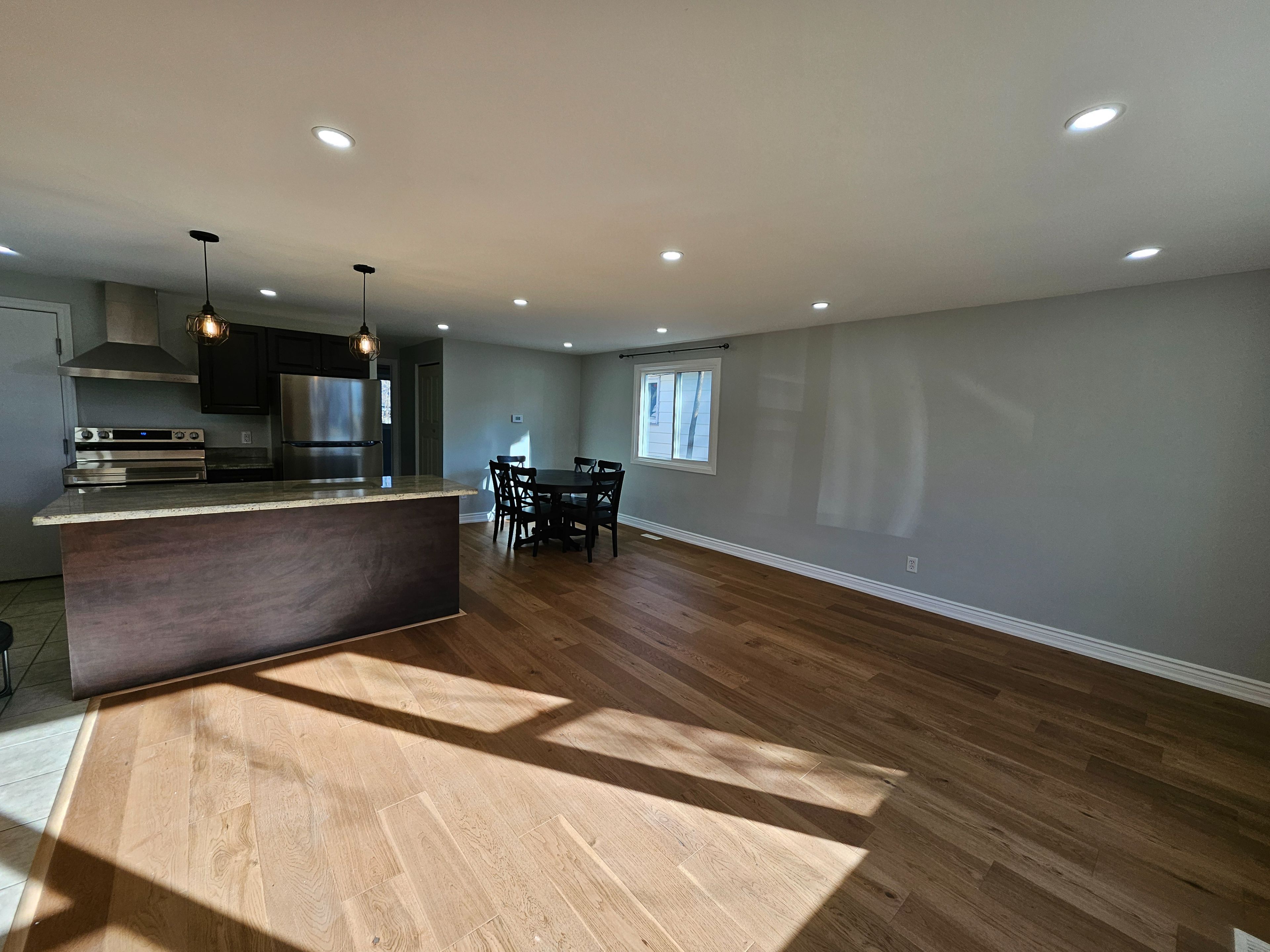 • Main level features a sun-filled living room and modern kitchen amenities.