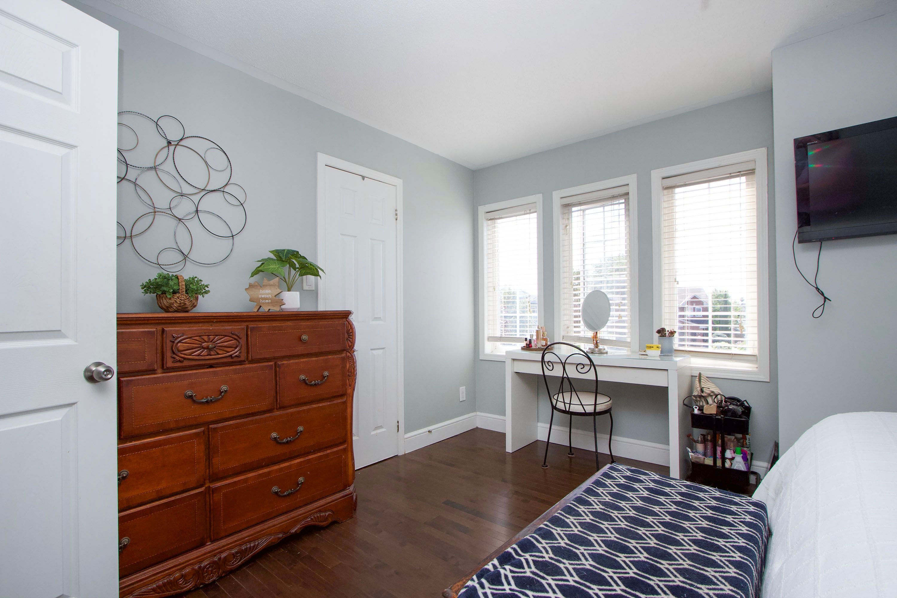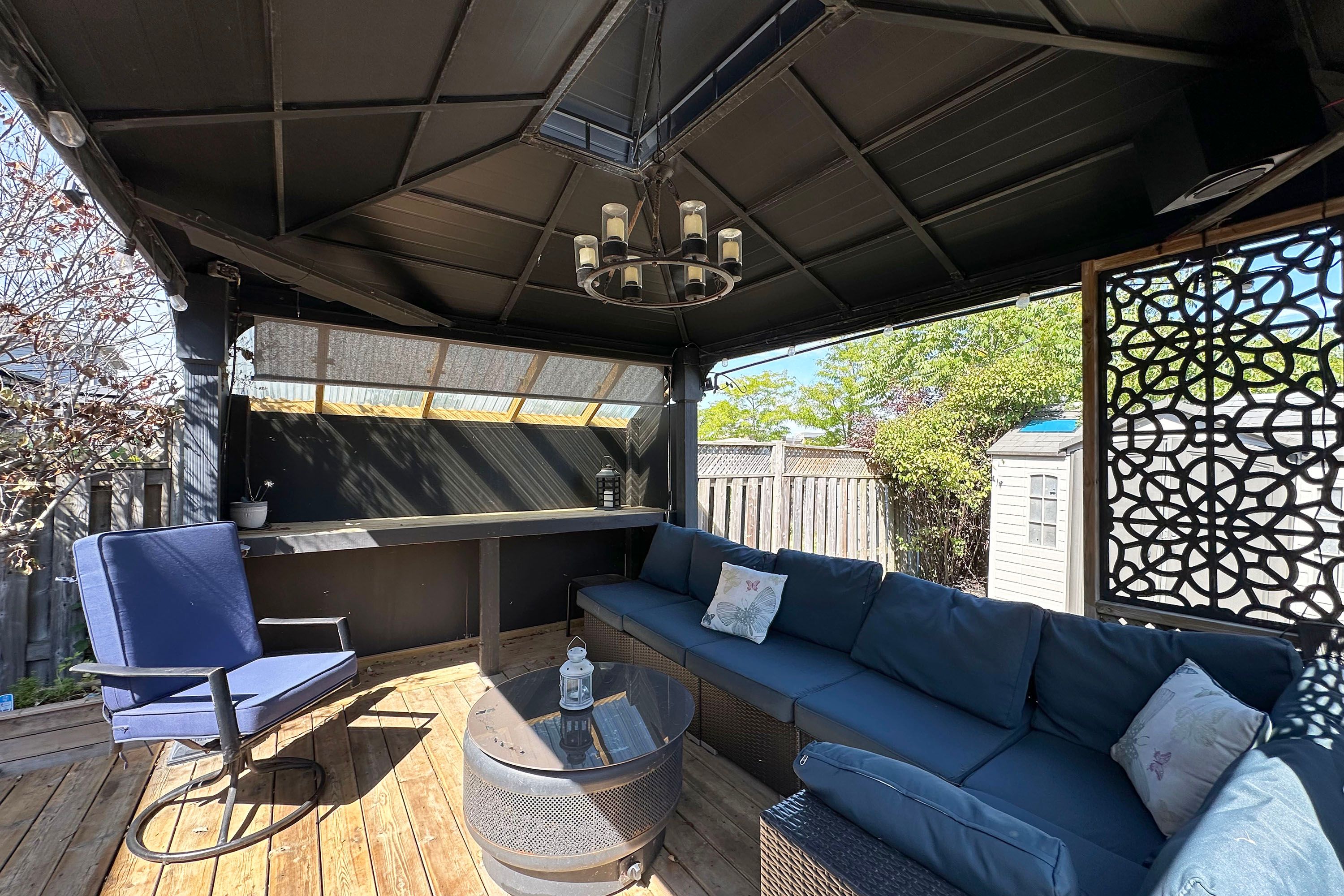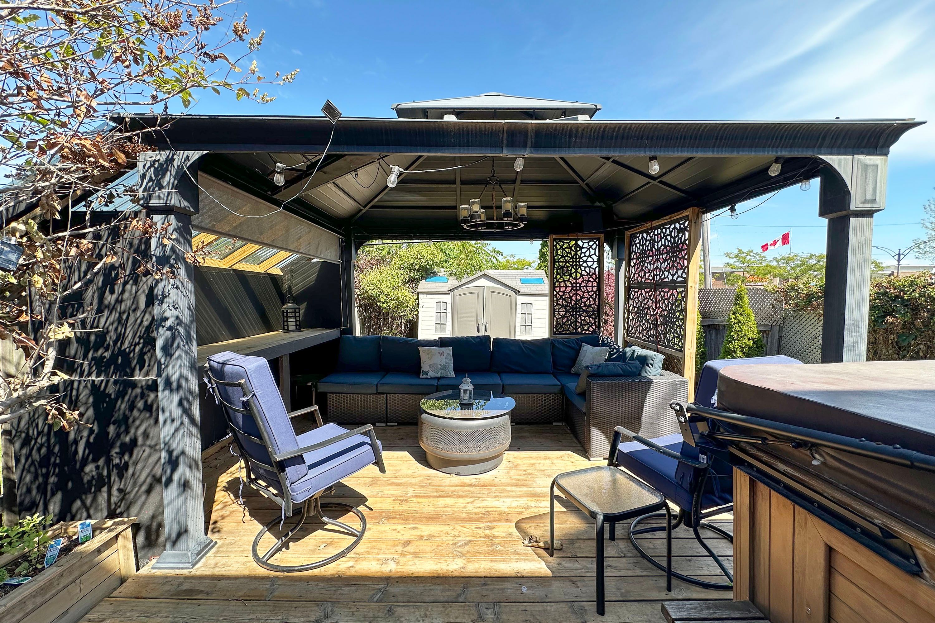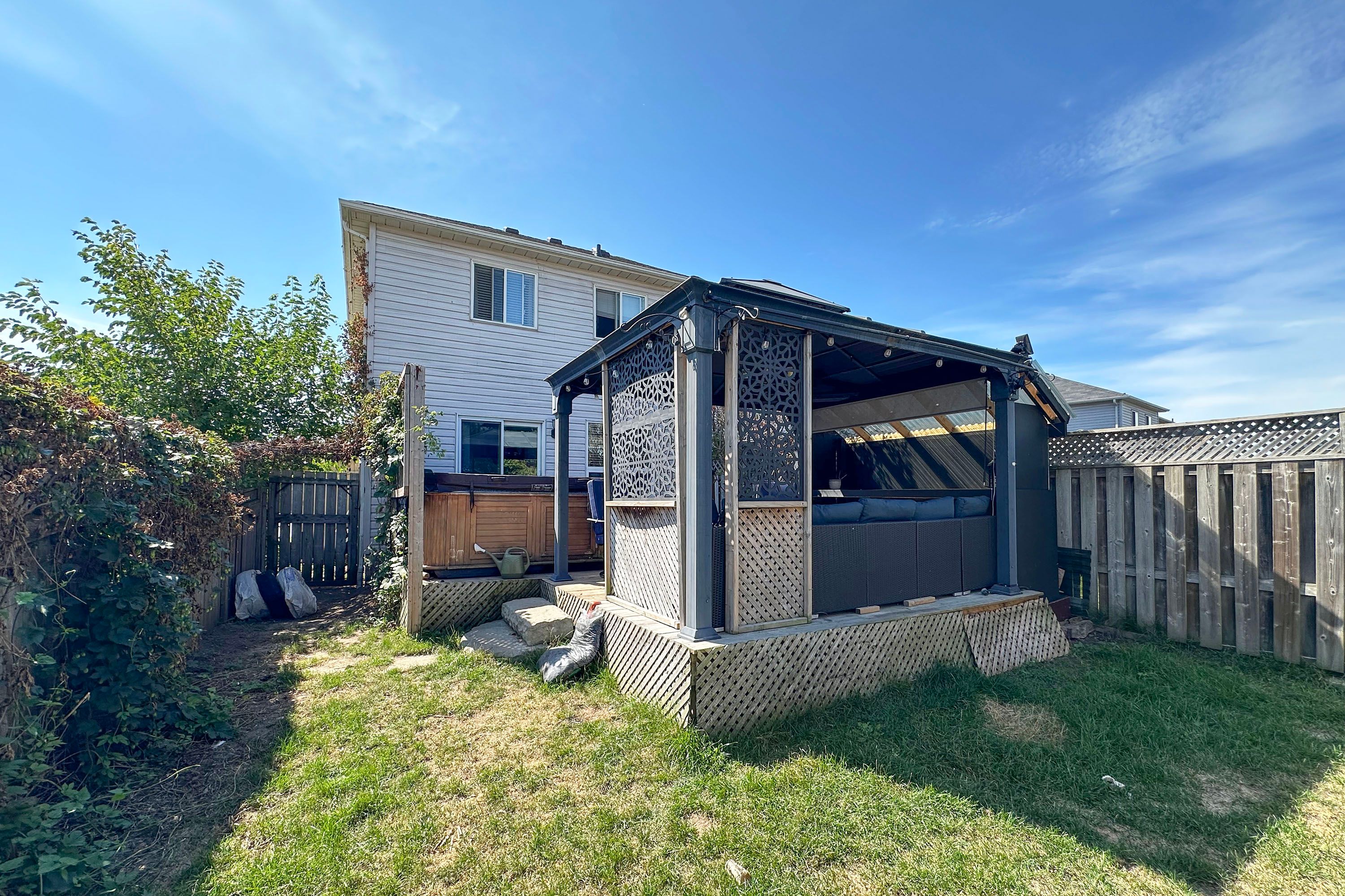 Location! Location! Location! Rare opportunity to own a freehold town-home situated on a quiet court in a high demand area with r3 zoning for a home based business use, a true gem! This well maintained home features a renovated kitchen (2022) complete with quartz countertops, ceramic backsplash & floor, stainless steel appliances, b/i dishwasher, & b/i microwave. The open concept dining and living room has hardwood floors and walk out to deck with hot tub and gazebo perfect for entertaining or relaxing. New air conditioner installed july 2025 . The second floor offers 3 bedrooms ( 2 with walk - in closets)all with hardwood floors , a 4pc bath. The converted garage has been transformed into a secondary kitchen with stairs leading down to a finished basement that includes a rec room, and a 4pc bathroom with stand up shower and separate jacuzzi tub-- ideal for student, in - law suite, or potential rental income. Enjoy the great curb appeal with a welcoming front porch and stamped concrete patio. Convenient location close to schools, shopping, go bus, hwy 401 & 407