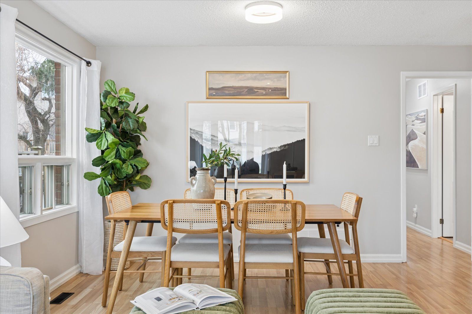 • Bright open-concept living and dining area with large bay window.